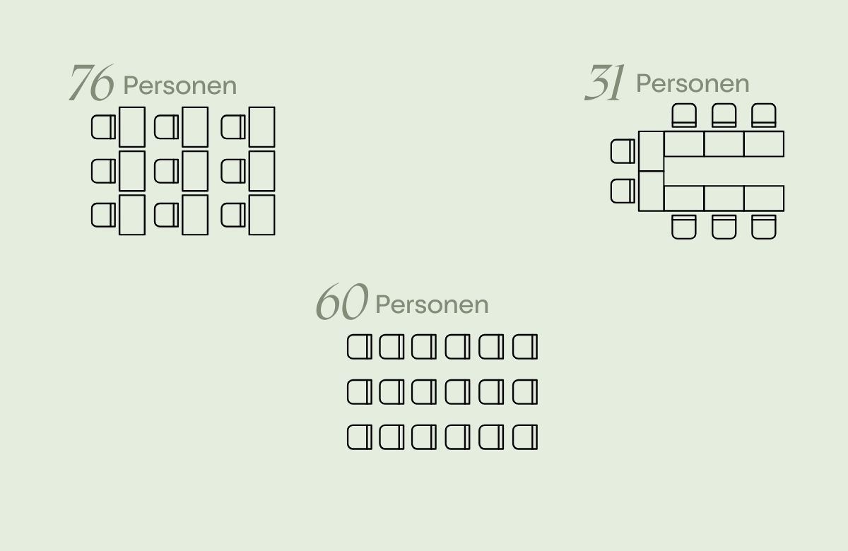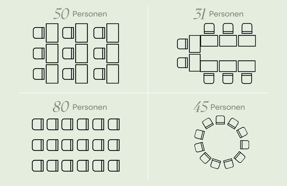 - Unser geräumiger Tagungsraum lässt sich für verschiedene Gruppengrößen aufteilen. Möglich sind Raumgrößen für Gruppen bis 10, 25, 80 oder 100 Personen. Kombinationen untereinander sind möglich, beeinflussen allerdings die maximale Kapazität des Tagungsraums.