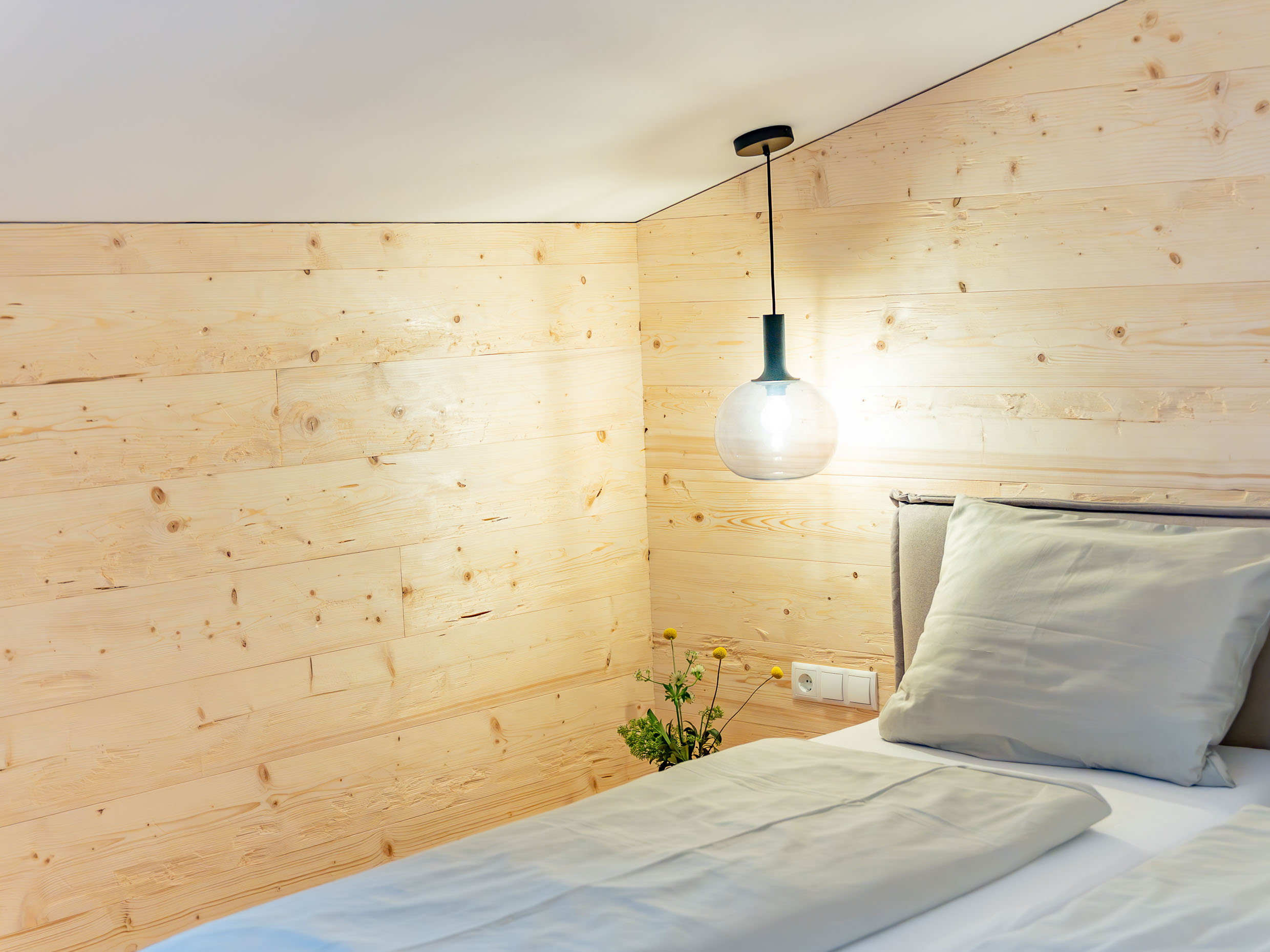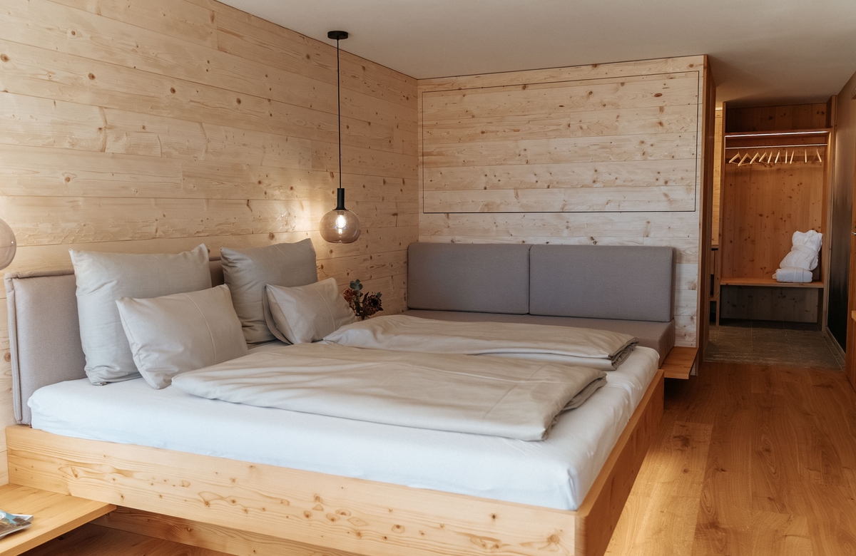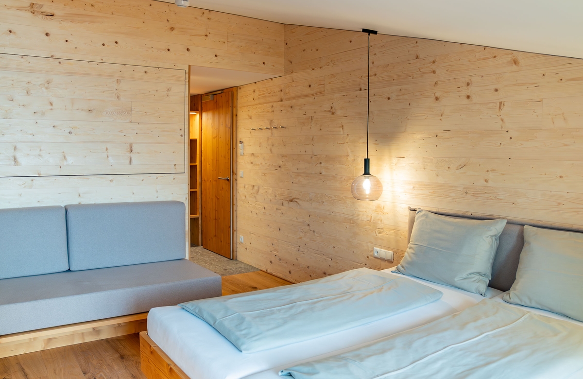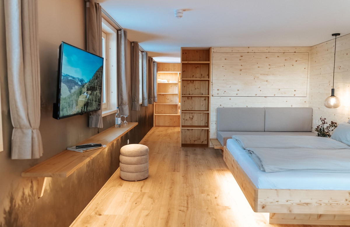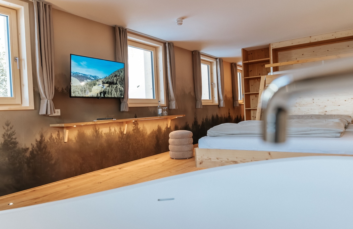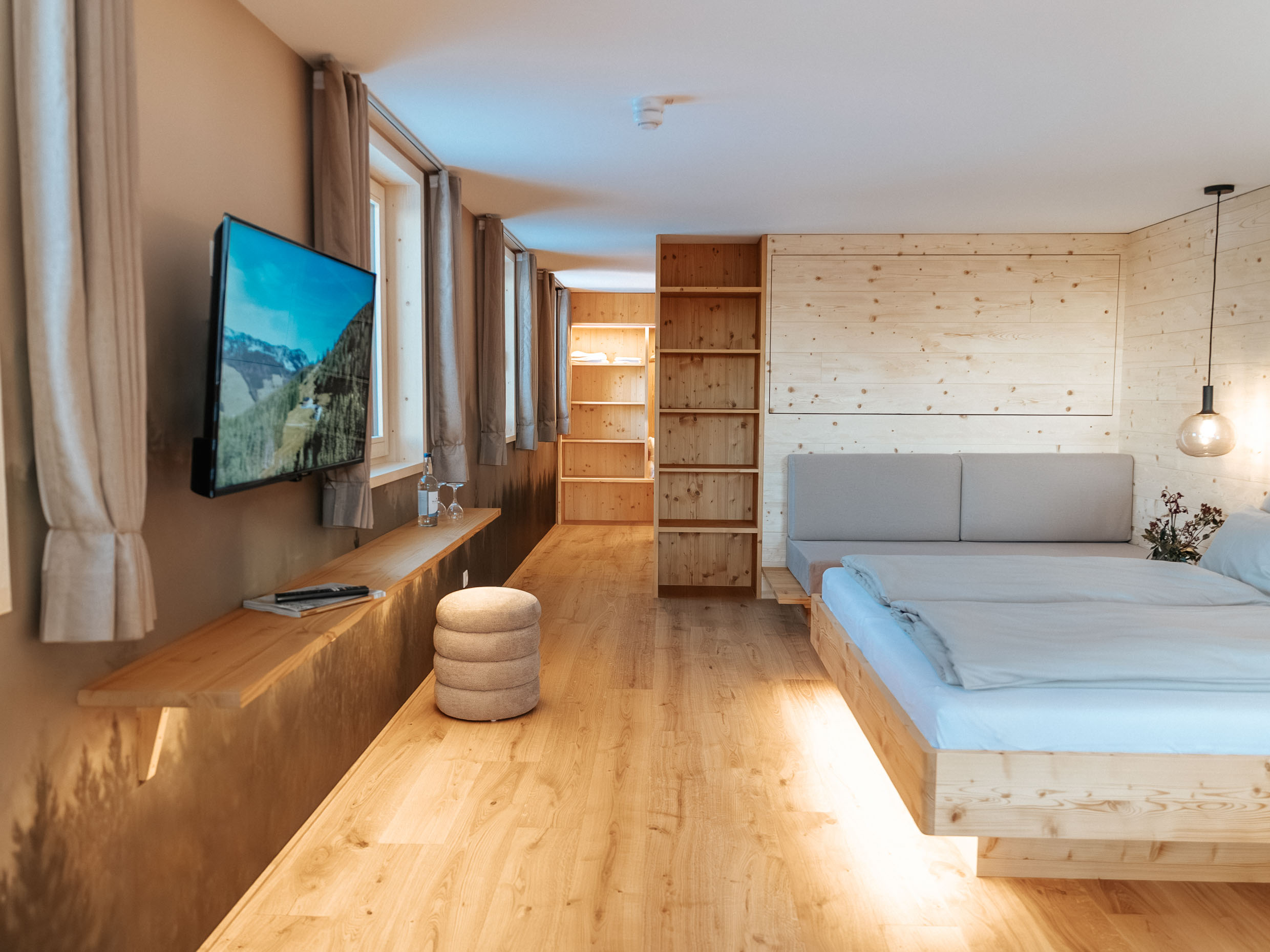 Gestalterisch greifen die Zimmer den klassischen Hüttenstil auf: viel Holz, warme Materialien und eine behagliche Atmosphäre, die das alpine Lebensgefühl von Wald & Wiesn widerspiegelt. Die Hütte ist damit der perfekte Ort für alle, die gerne mittendrin wohnen und das Herz des Hauses bewusst erleben möchten.