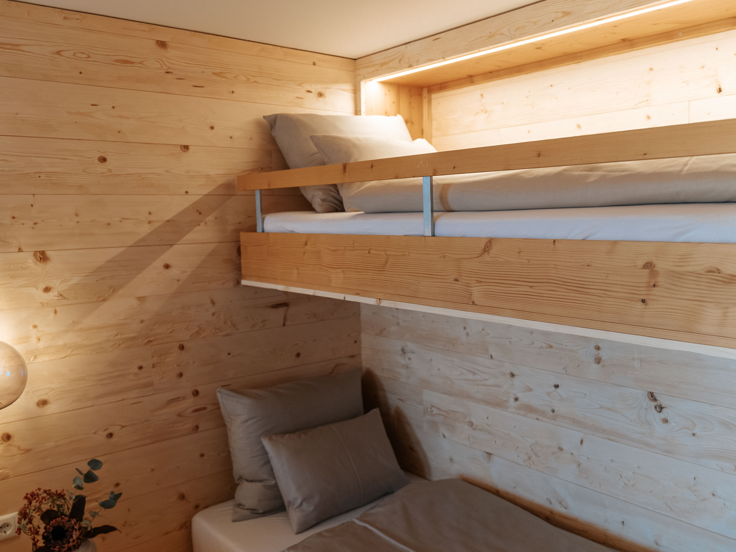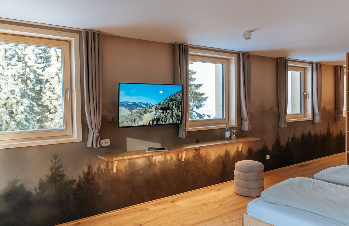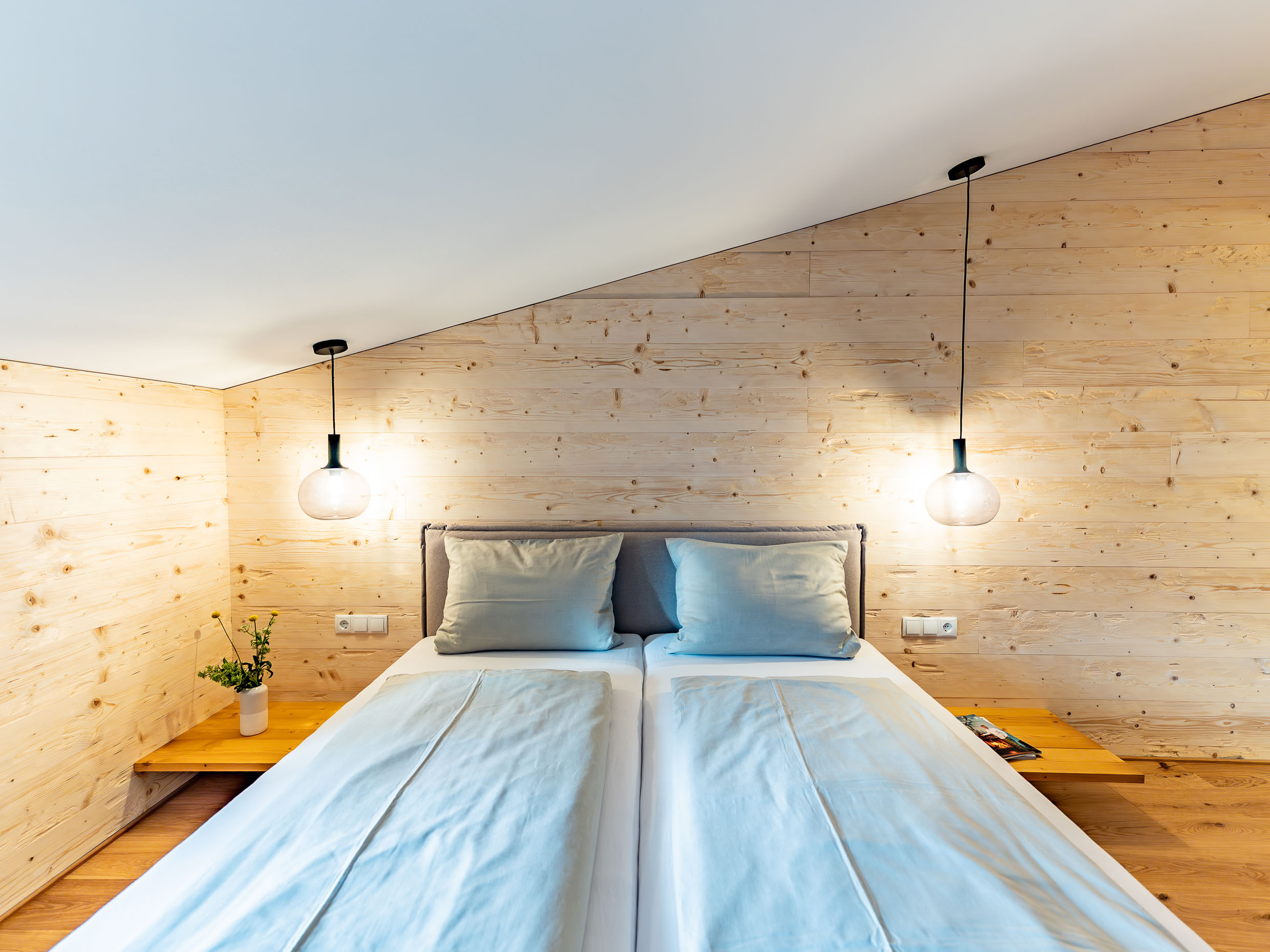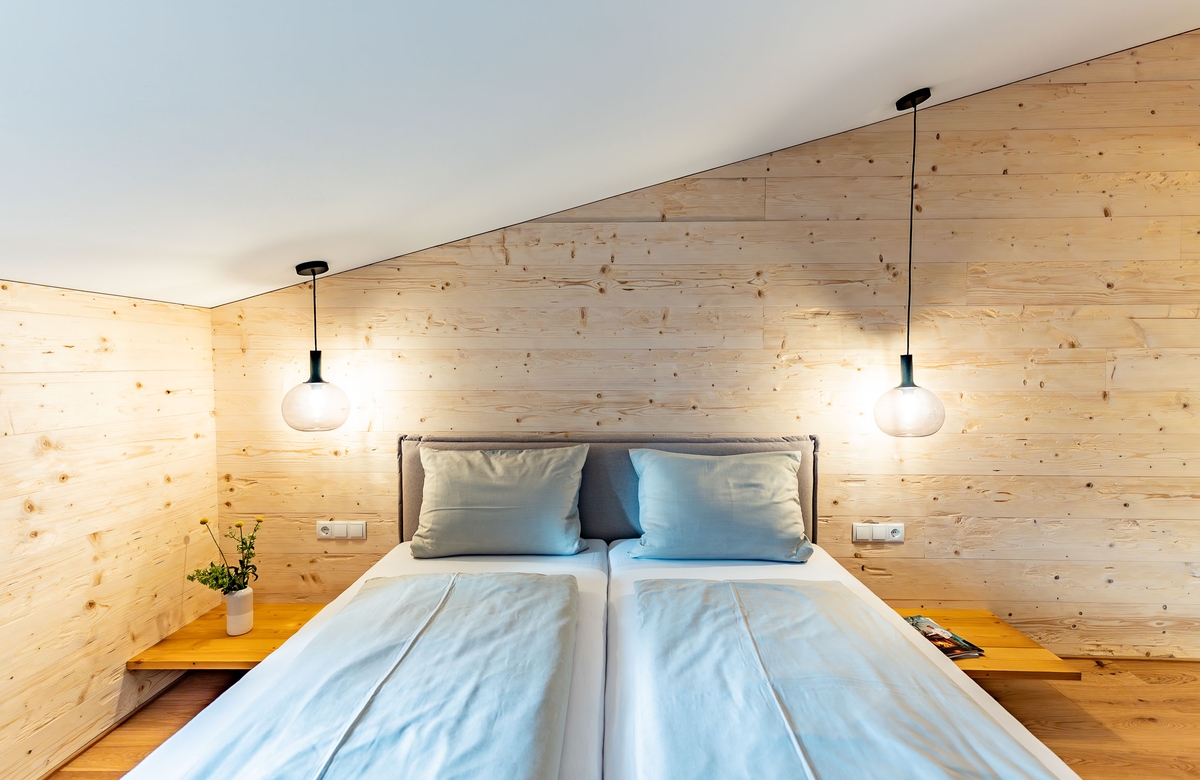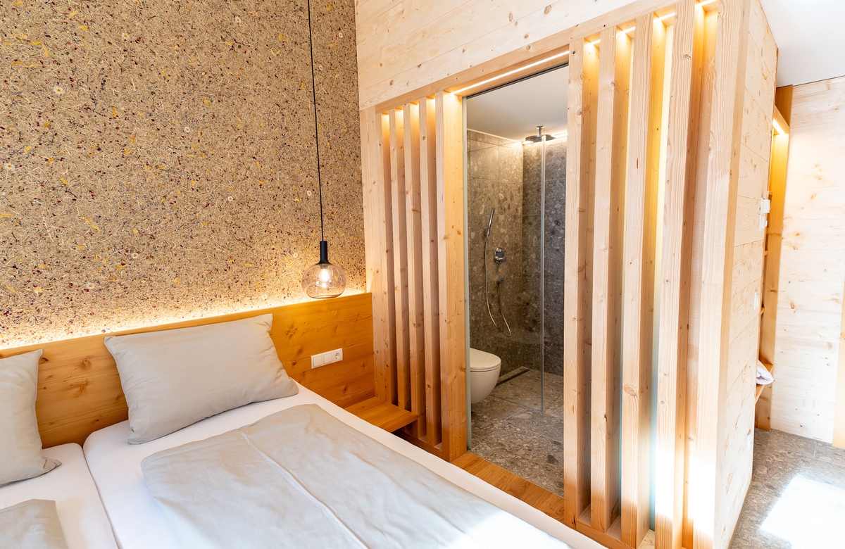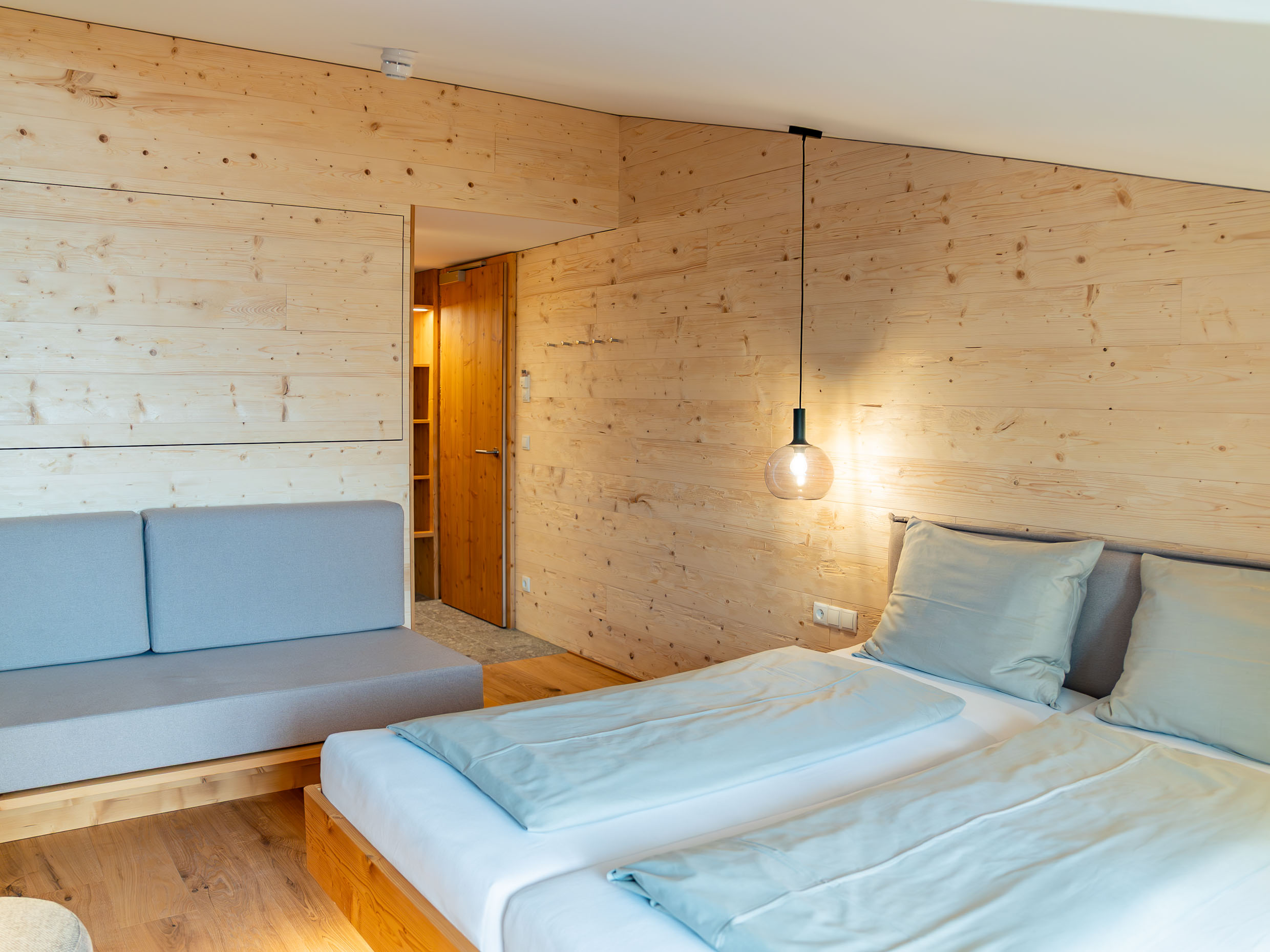Gestalterisch greifen die Zimmer den klassischen Hüttenstil auf: viel Holz, warme Materialien und eine behagliche Atmosphäre, die das alpine Lebensgefühl von Wald & Wiesn widerspiegelt. Die Hütte ist damit der perfekte Ort für alle, die gerne mittendrin wohnen und das Herz des Hauses bewusst erleben möchten.