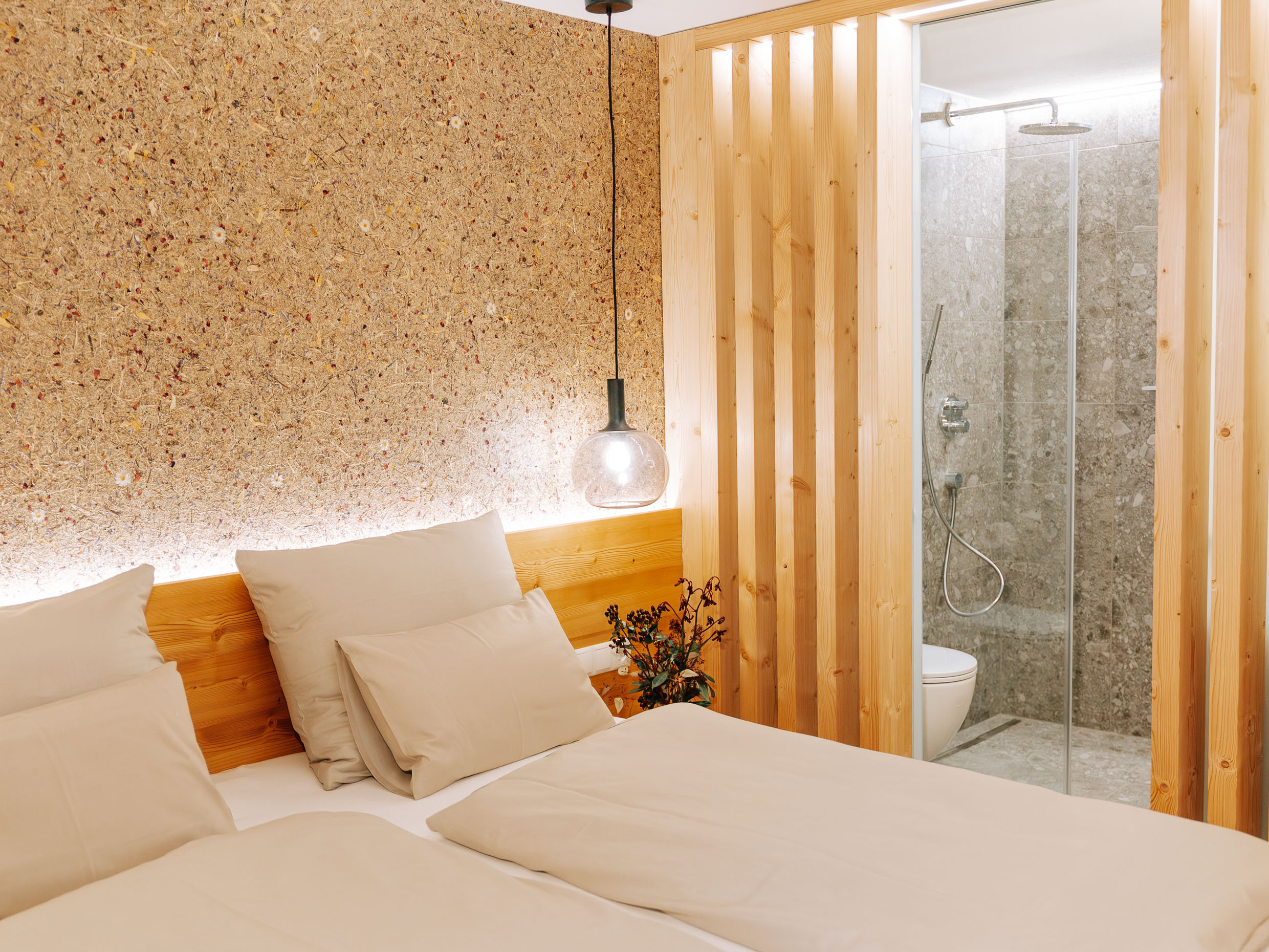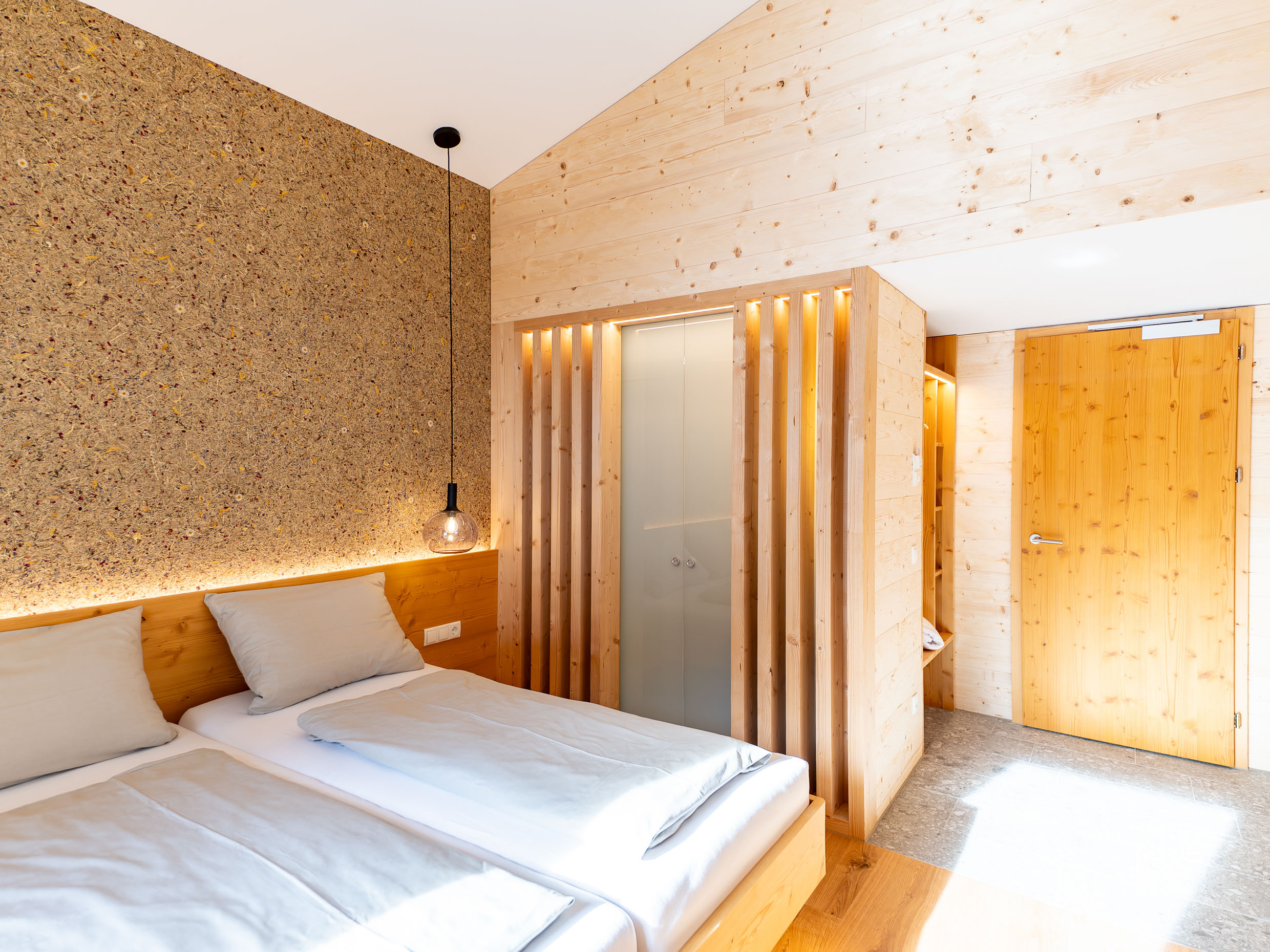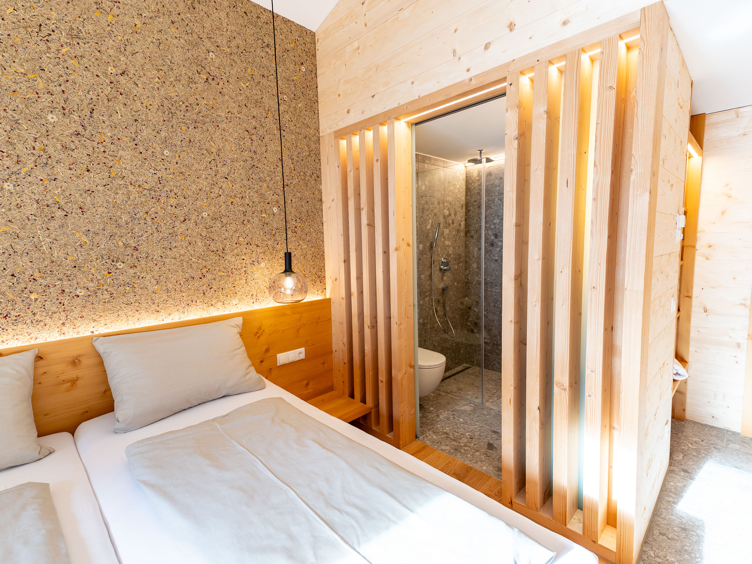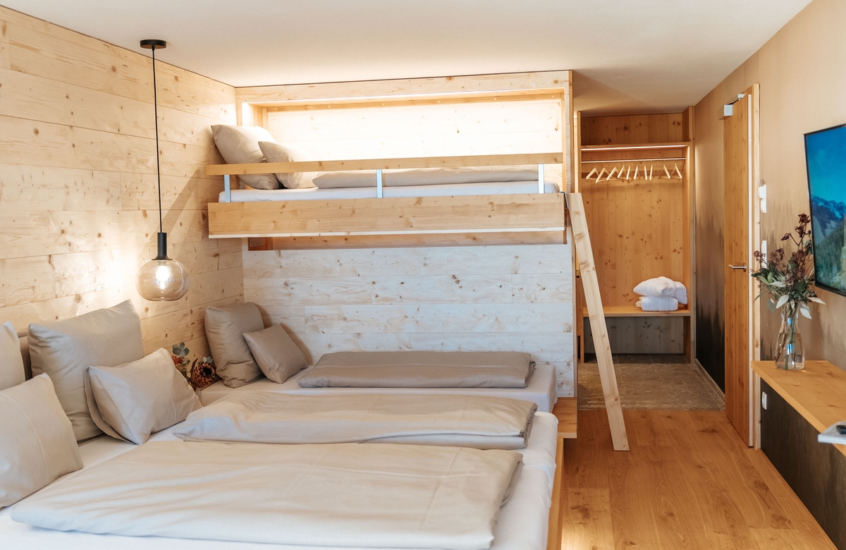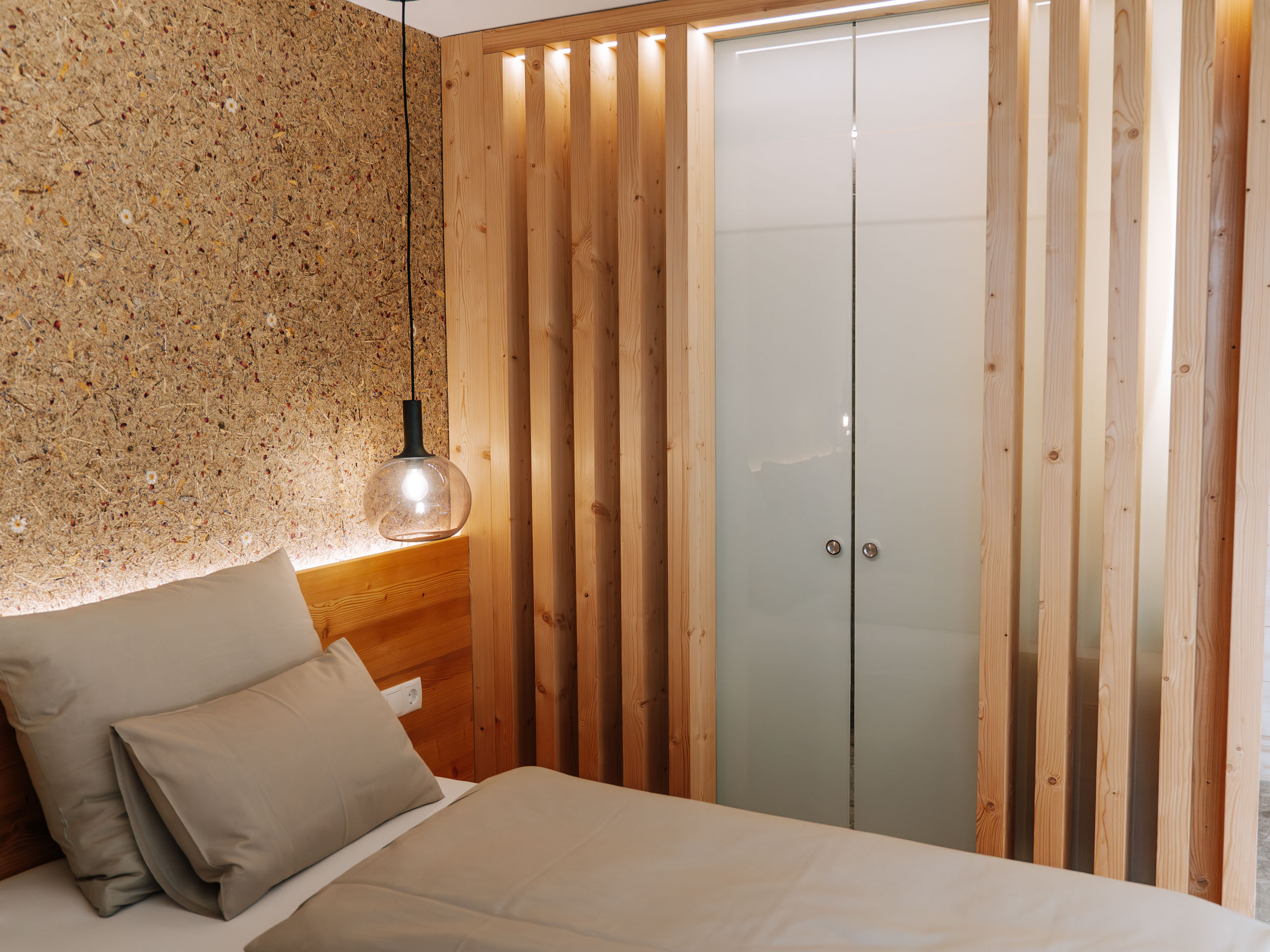 Gestalterisch greifen die Zimmer den klassischen Hüttenstil auf: viel Holz, warme Materialien und eine behagliche Atmosphäre, die das alpine Lebensgefühl von Wald & Wiesn widerspiegelt. Die Hütte ist damit der perfekte Ort für alle, die gerne mittendrin wohnen und das Herz des Hauses bewusst erleben möchten.