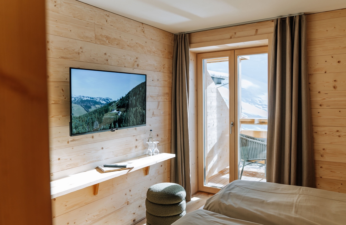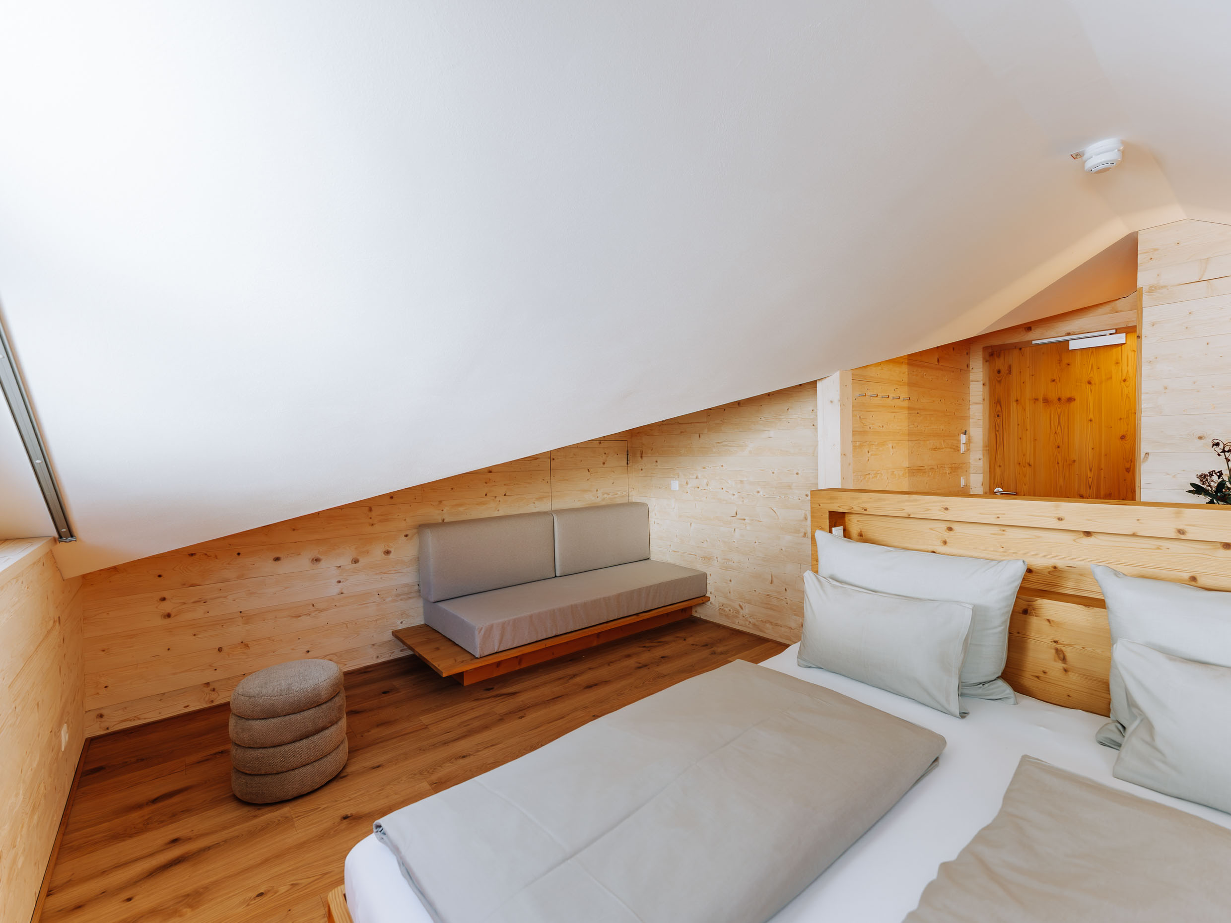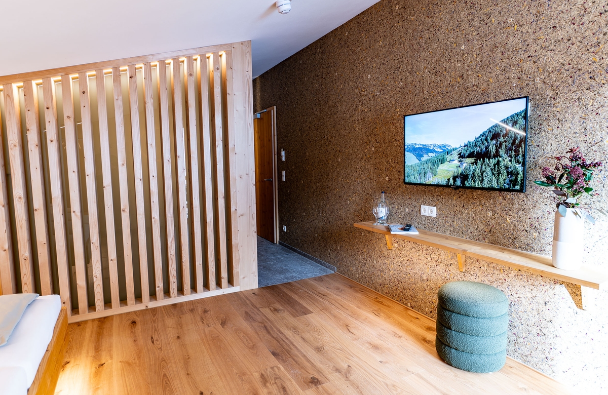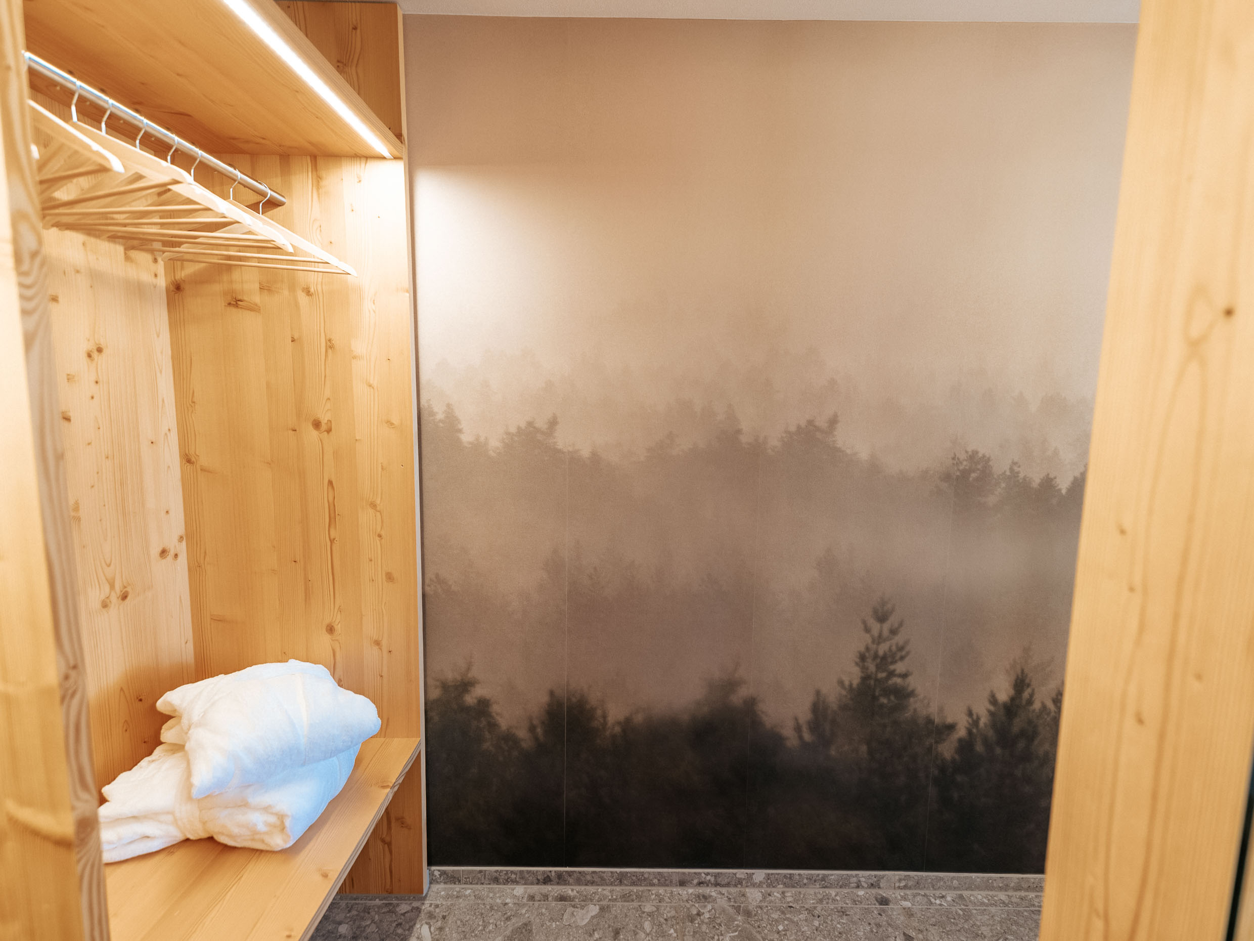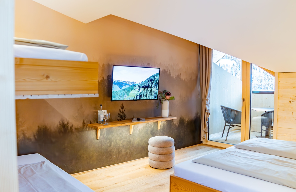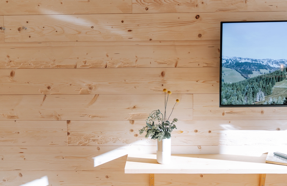 Gestalterisch greifen die Zimmer den klassischen Hüttenstil auf: viel Holz, warme Materialien und eine behagliche Atmosphäre, die das alpine Lebensgefühl von Wald & Wiesn widerspiegelt. Die Hütte ist damit der perfekte Ort für alle, die gerne mittendrin wohnen und das Herz des Hauses bewusst erleben möchten.