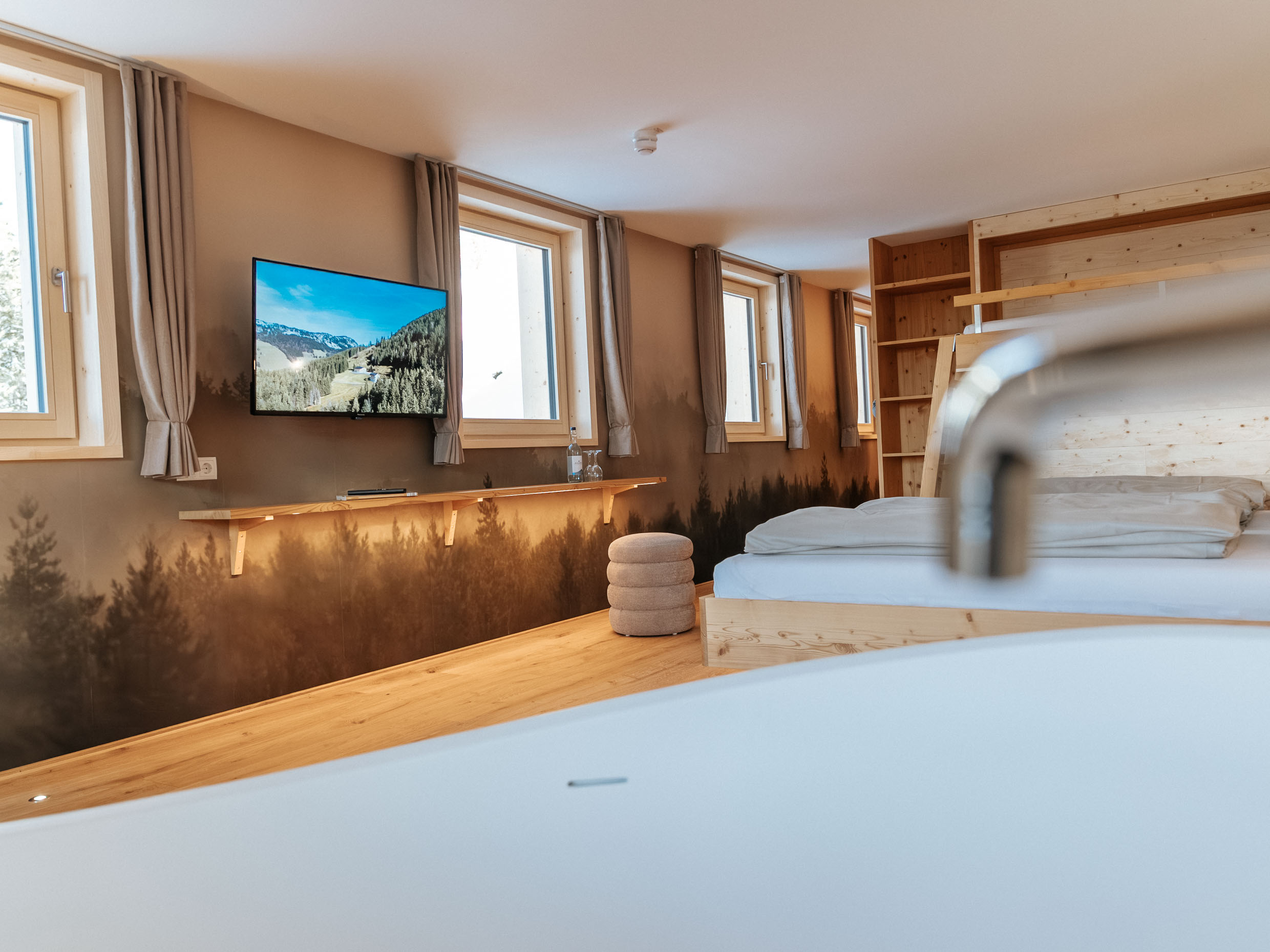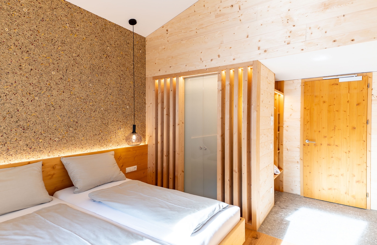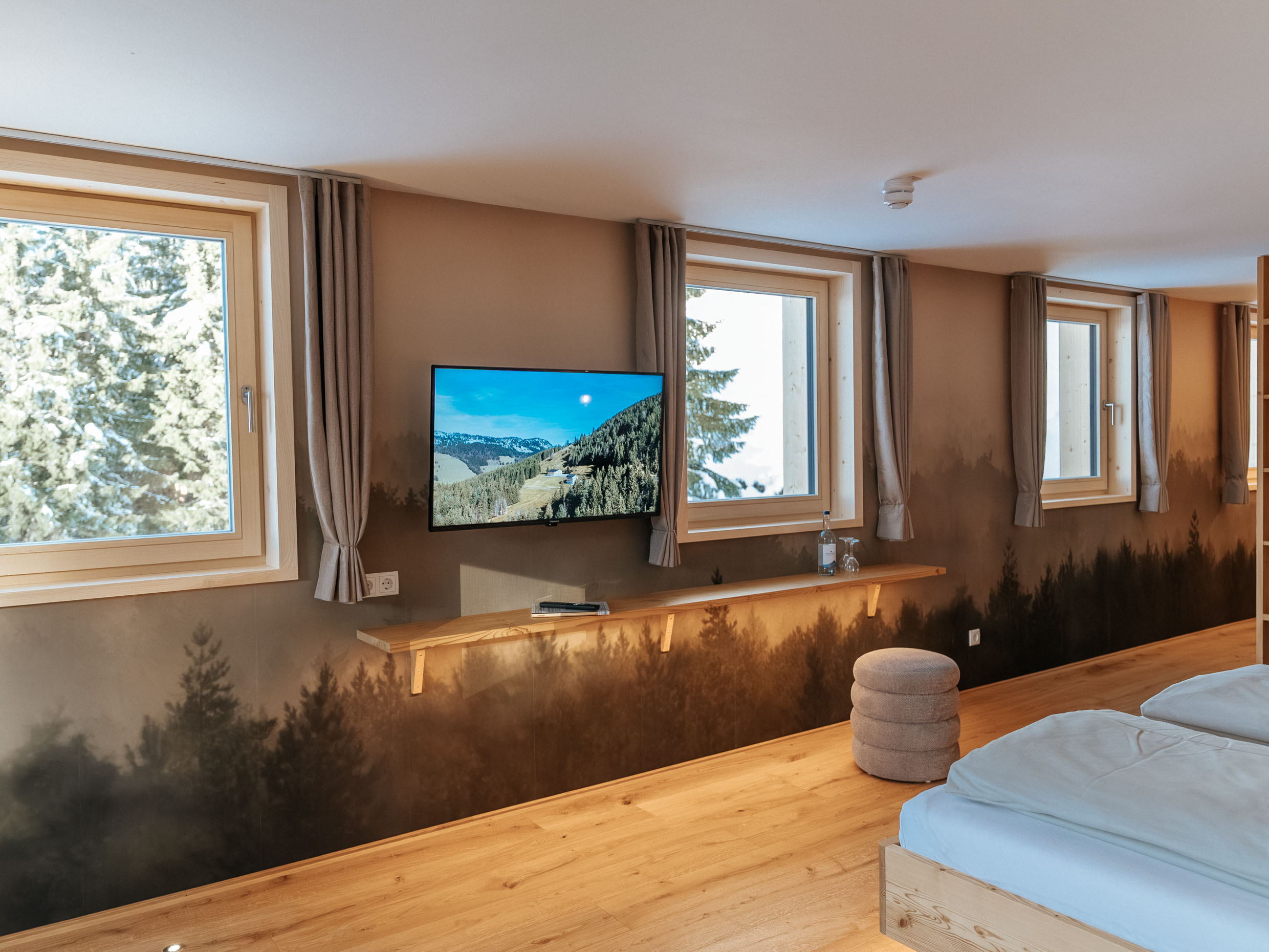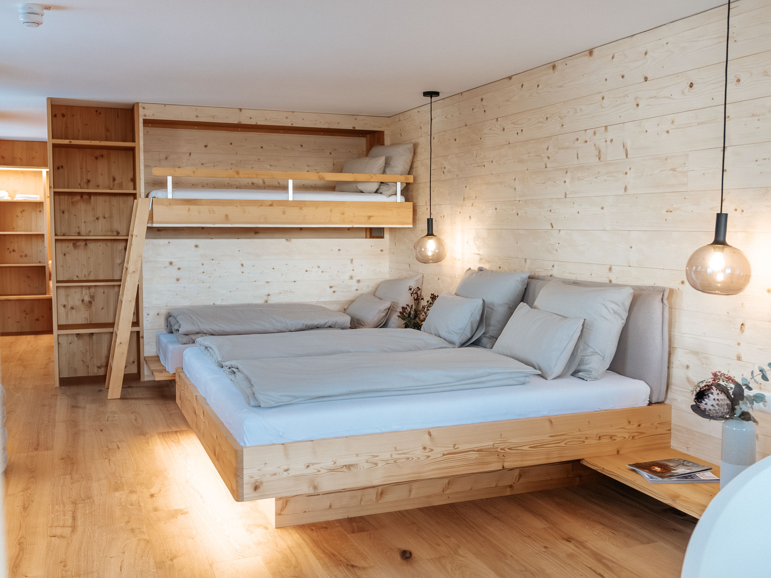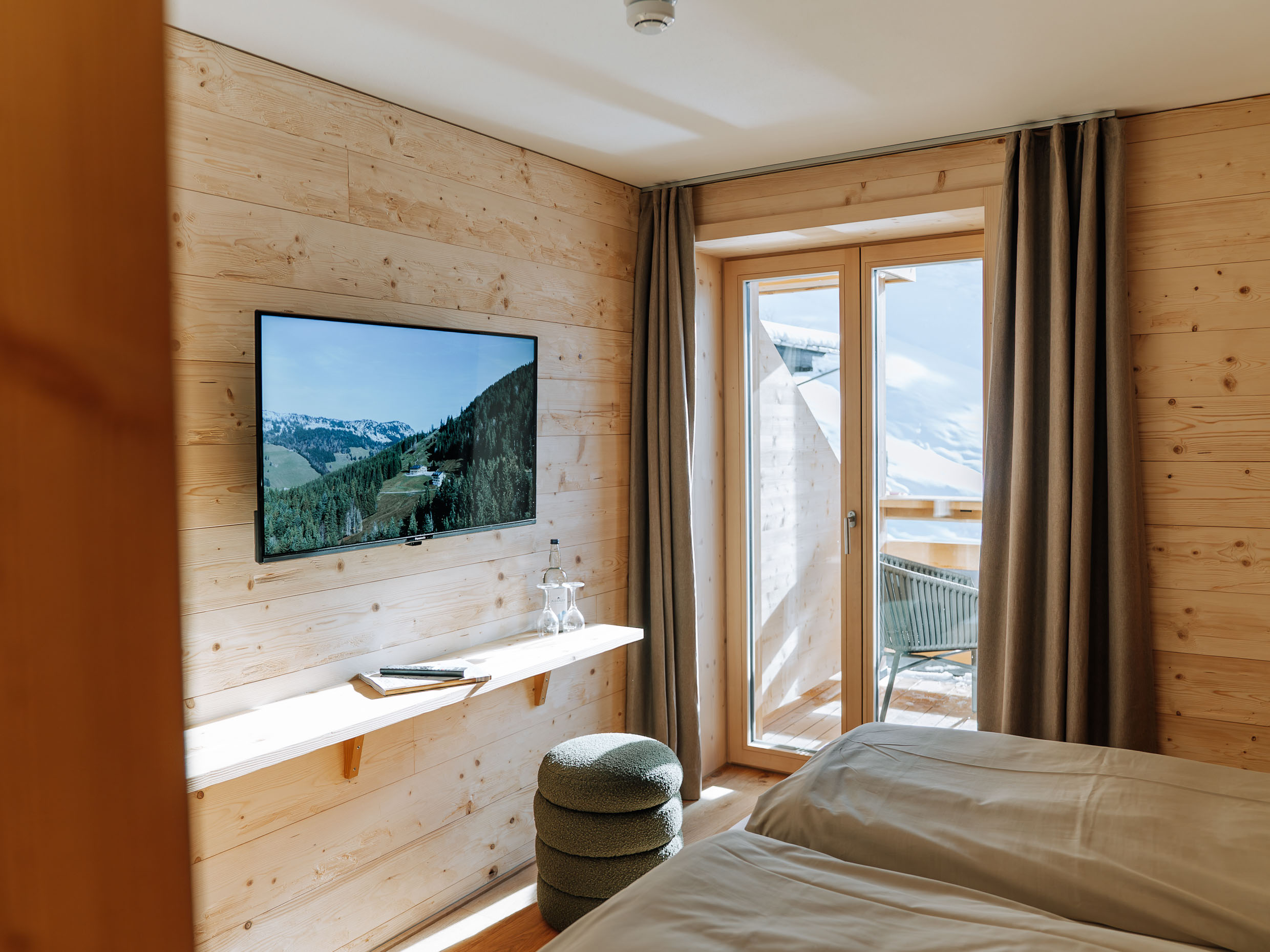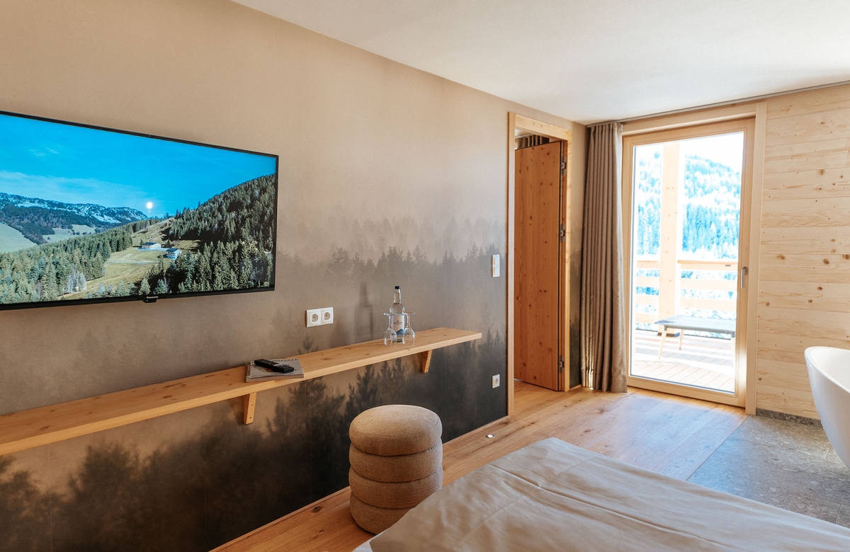 Gestalterisch greifen die Zimmer den klassischen Hüttenstil auf: viel Holz, warme Materialien und eine behagliche Atmosphäre, die das alpine Lebensgefühl von Wald & Wiesn widerspiegelt. Die Hütte ist damit der perfekte Ort für alle, die gerne mittendrin wohnen und das Herz des Hauses bewusst erleben möchten.