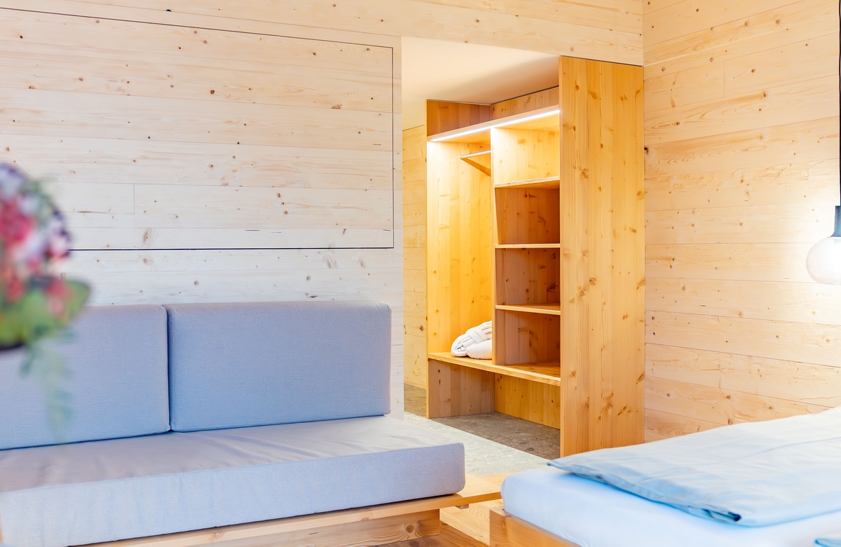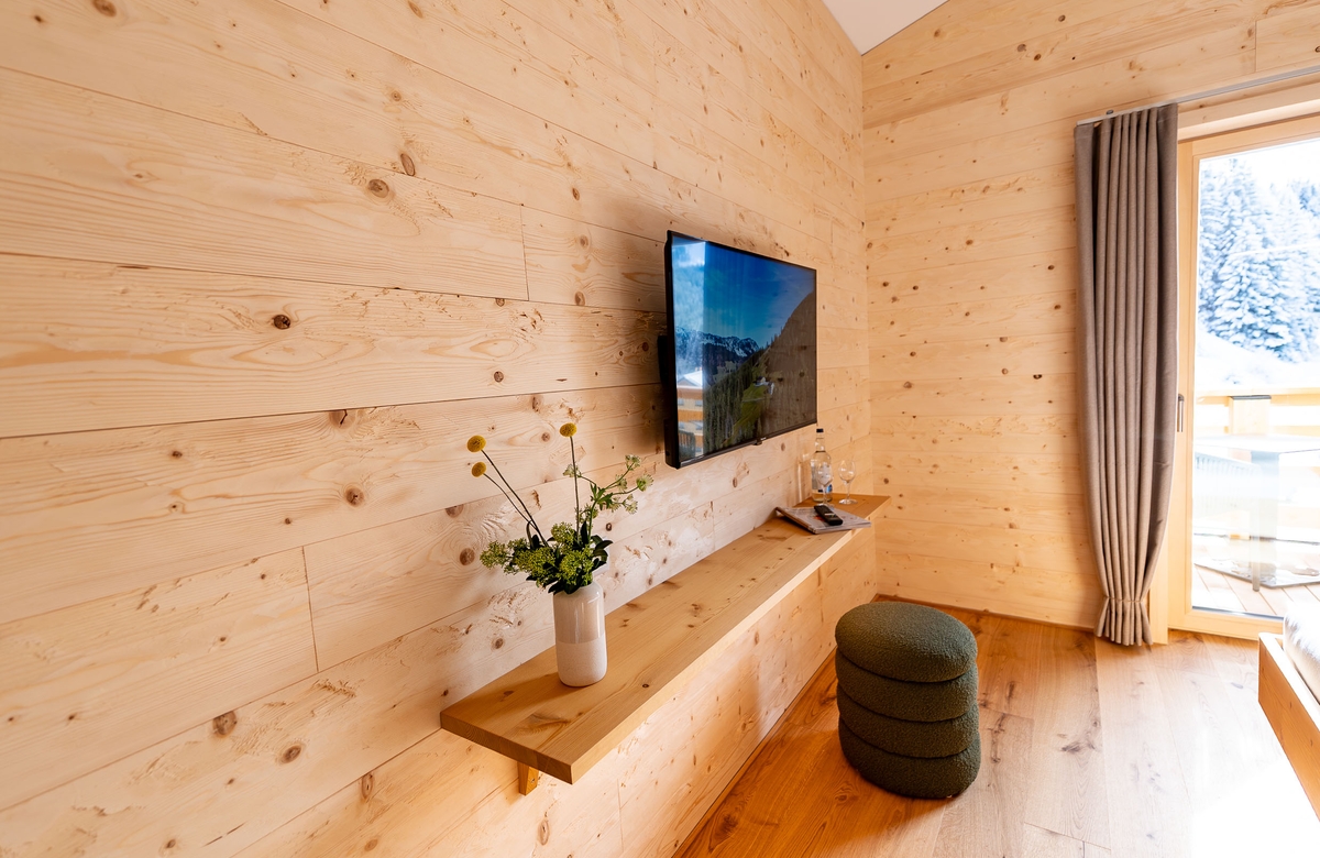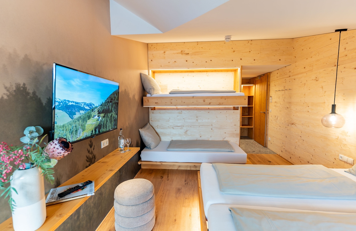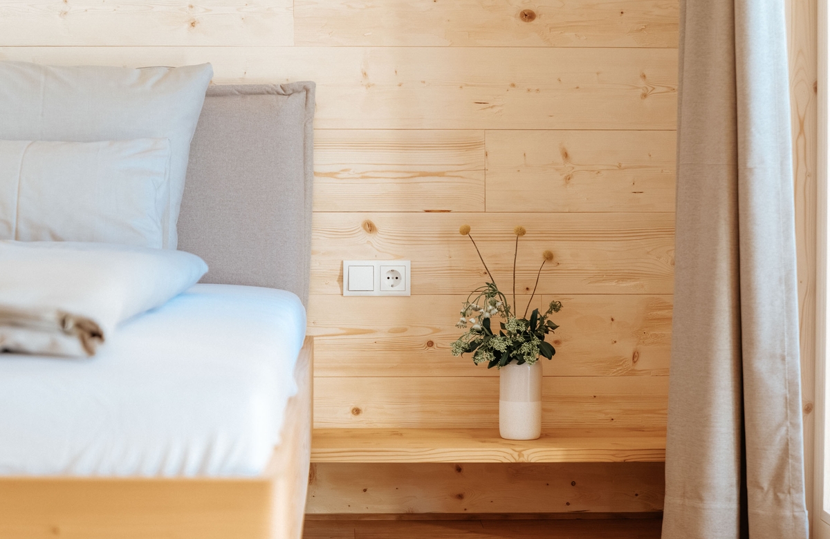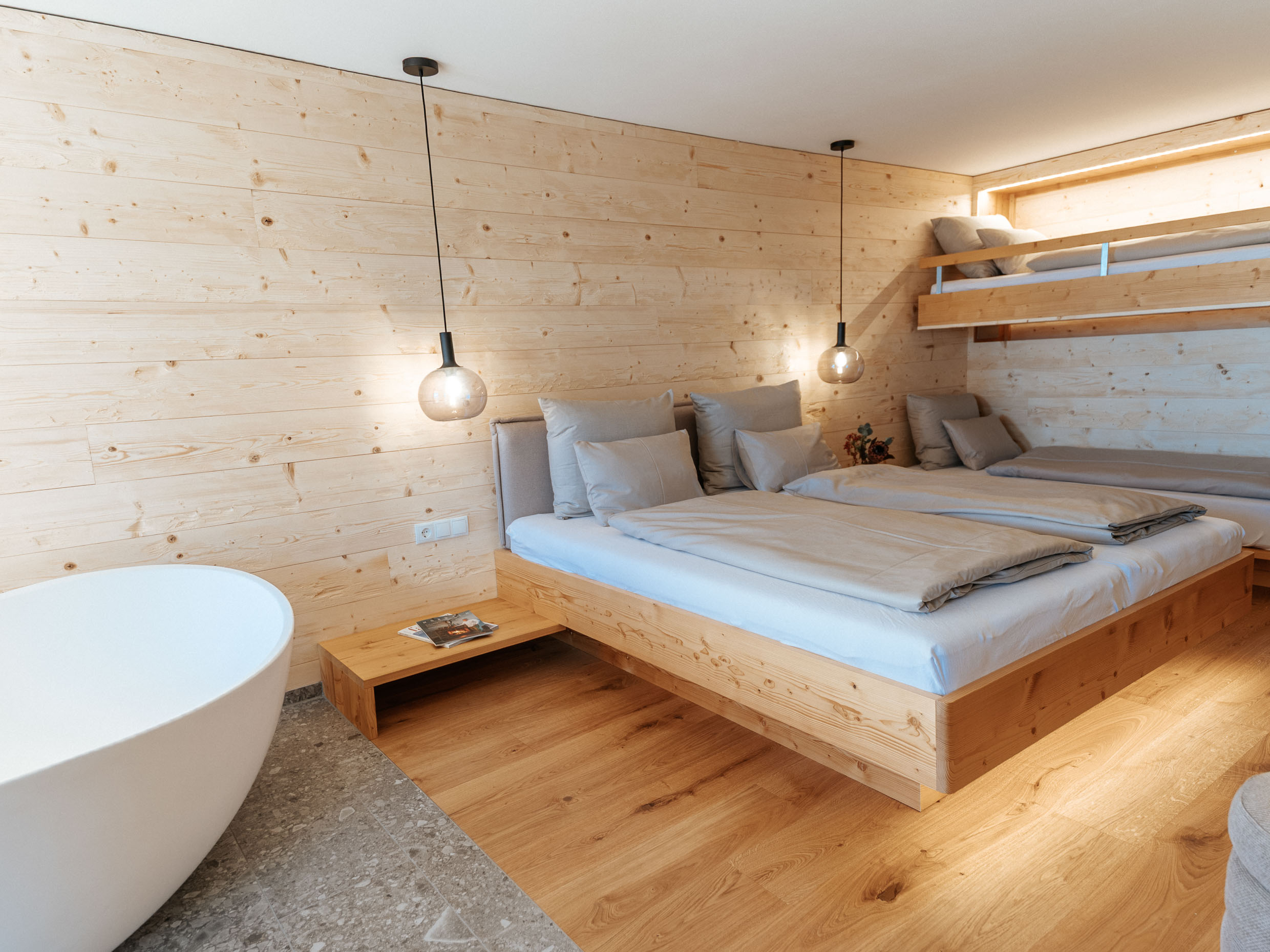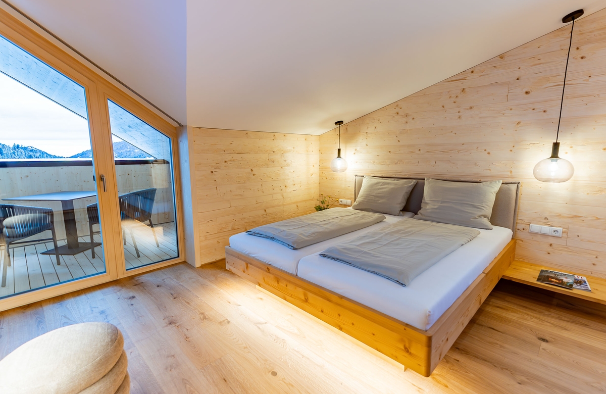 Gestalterisch greifen die Zimmer den klassischen Hüttenstil auf: viel Holz, warme Materialien und eine behagliche Atmosphäre, die das alpine Lebensgefühl von Wald & Wiesn widerspiegelt. Die Hütte ist damit der perfekte Ort für alle, die gerne mittendrin wohnen und das Herz des Hauses bewusst erleben möchten.
