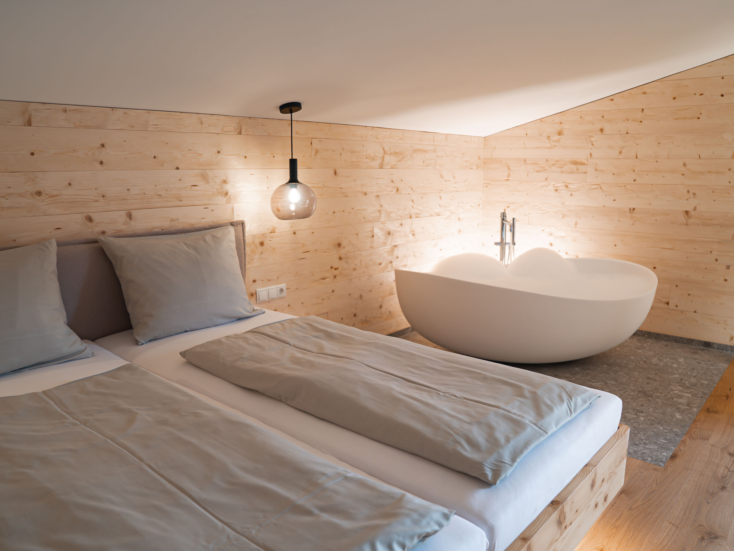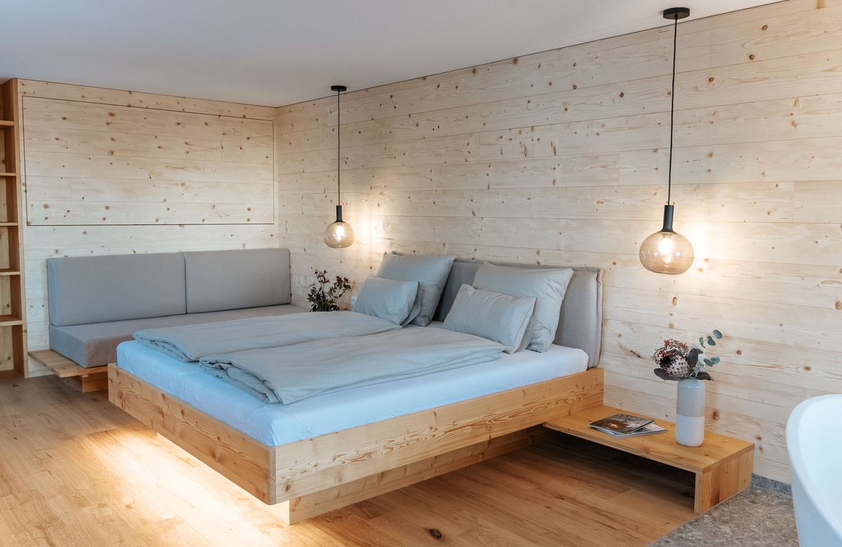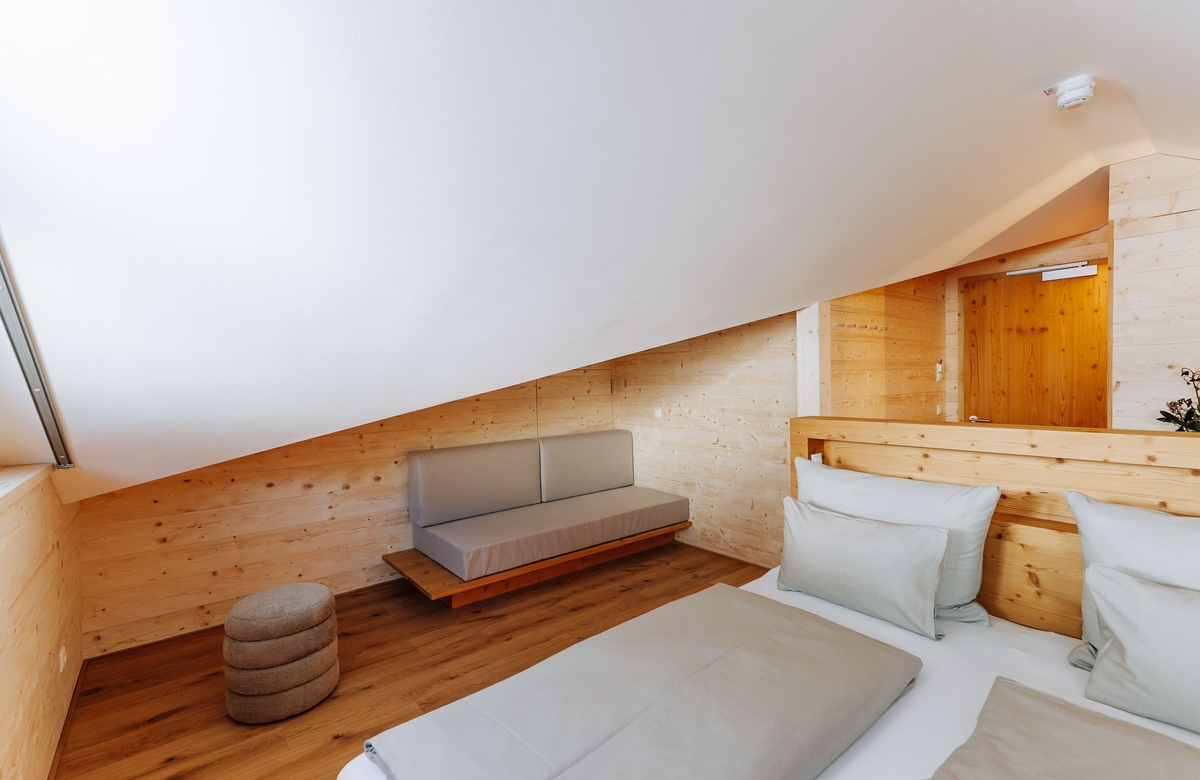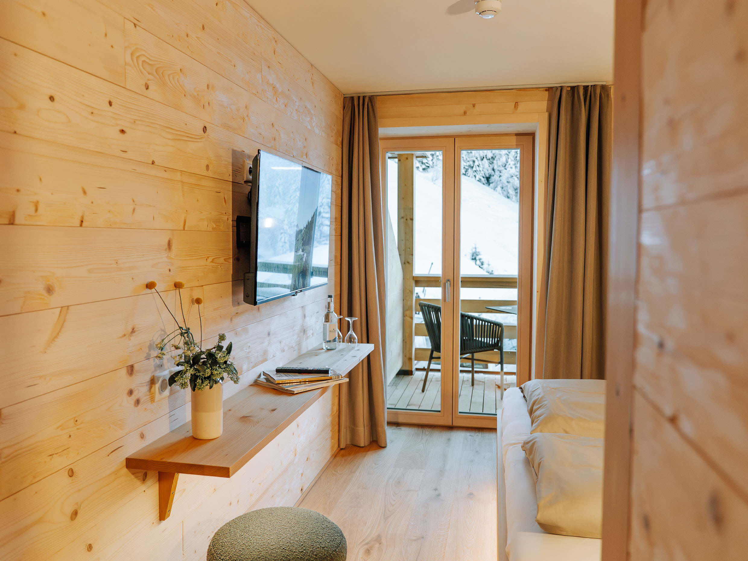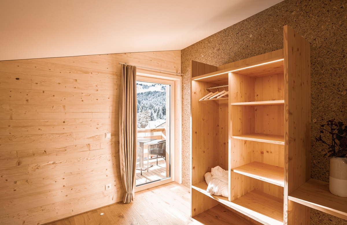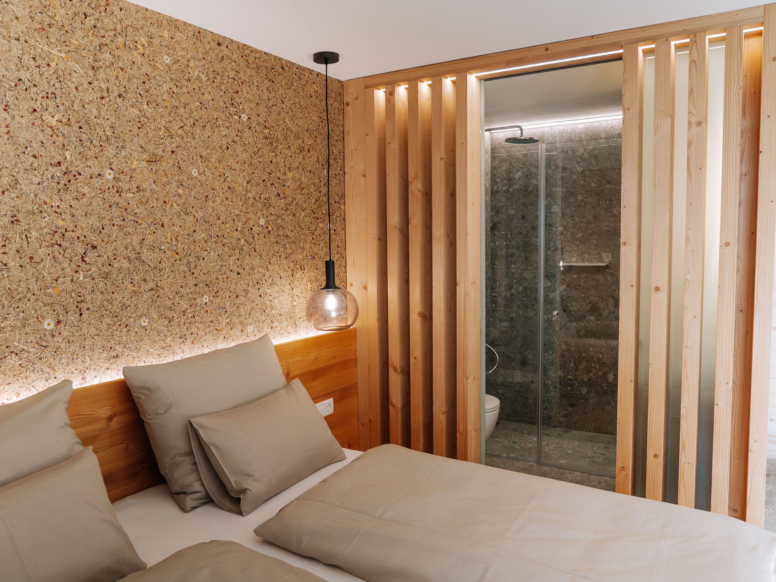 Gestalterisch greifen die Zimmer den klassischen Hüttenstil auf: viel Holz, warme Materialien und eine behagliche Atmosphäre, die das alpine Lebensgefühl von Wald & Wiesn widerspiegelt. Die Hütte ist damit der perfekte Ort für alle, die gerne mittendrin wohnen und das Herz des Hauses bewusst erleben möchten.