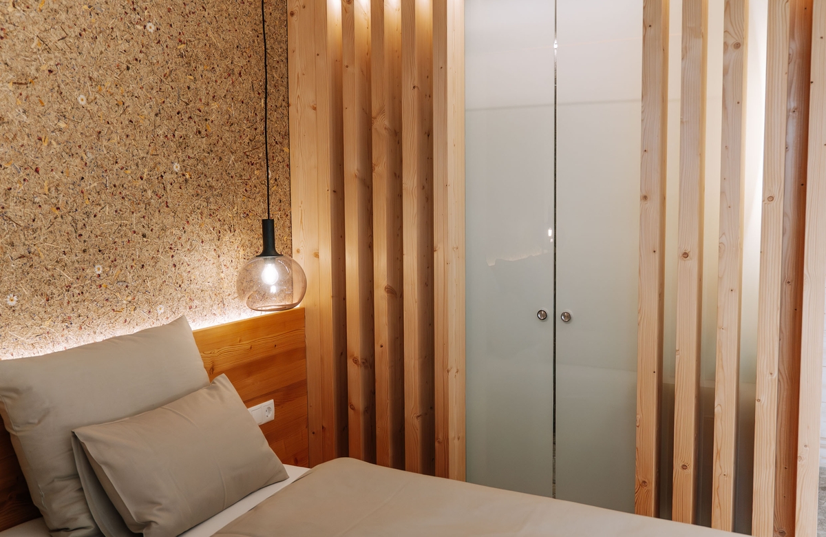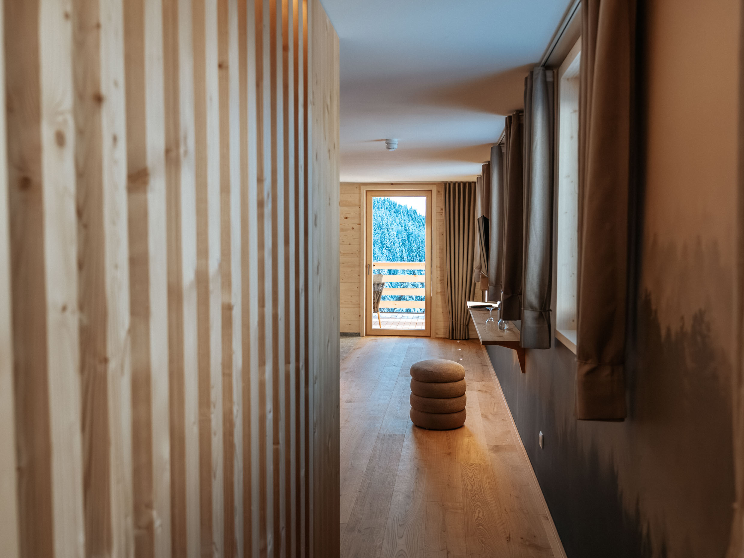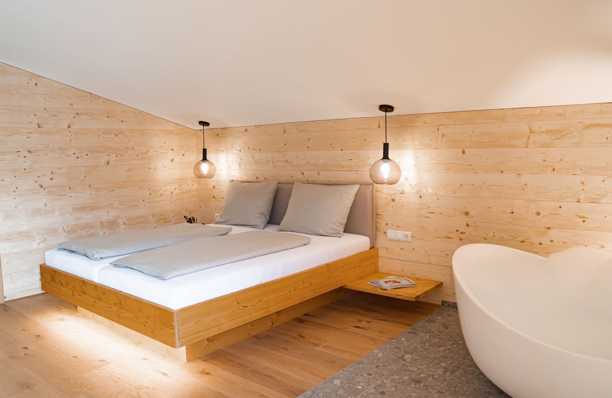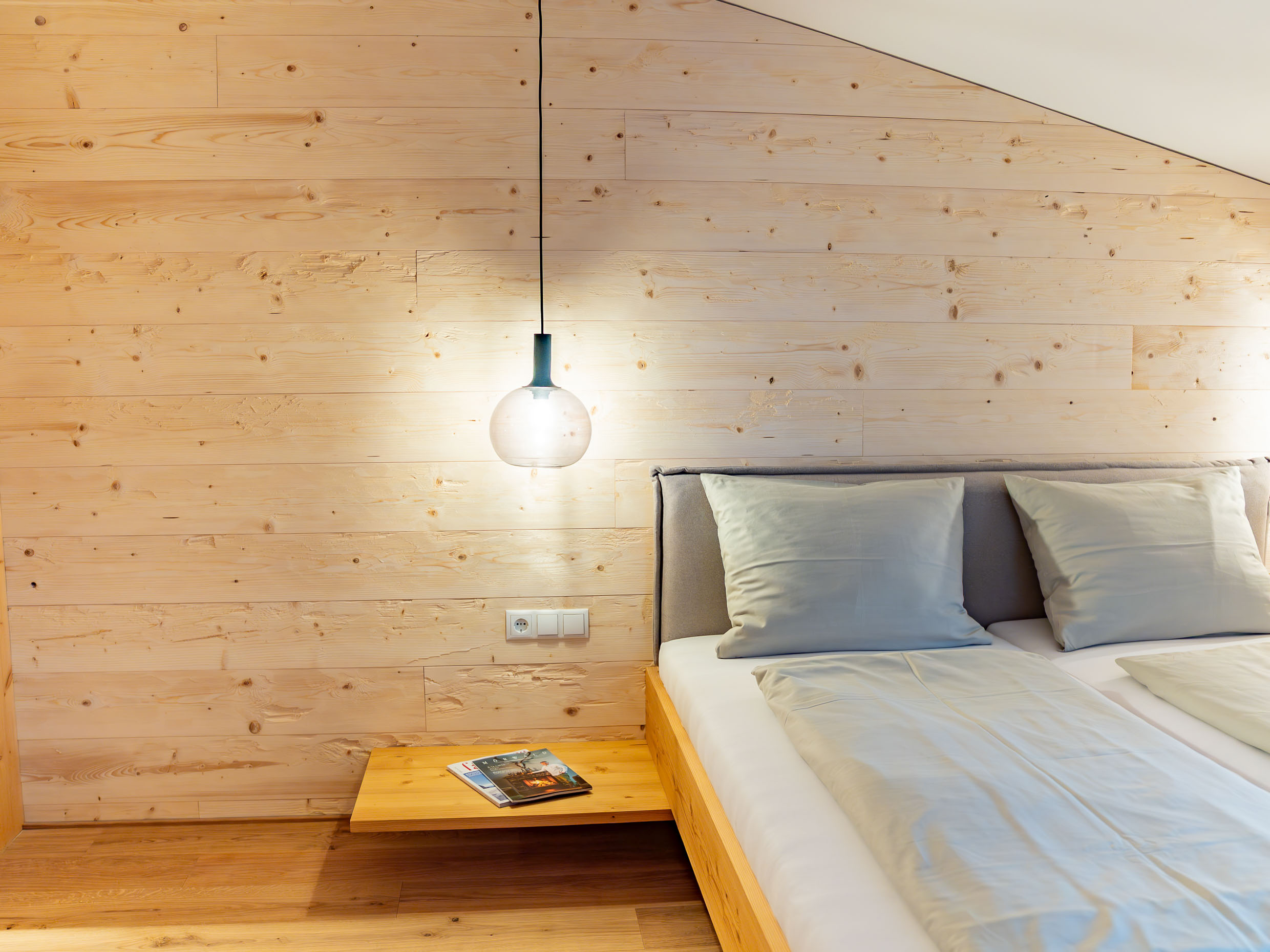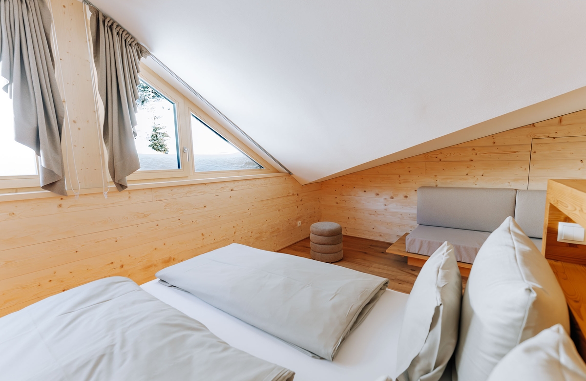 Gestalterisch greifen die Zimmer den klassischen Hüttenstil auf: viel Holz, warme Materialien und eine behagliche Atmosphäre, die das alpine Lebensgefühl von Wald & Wiesn widerspiegelt. Die Hütte ist damit der perfekte Ort für alle, die gerne mittendrin wohnen und das Herz des Hauses bewusst erleben möchten.