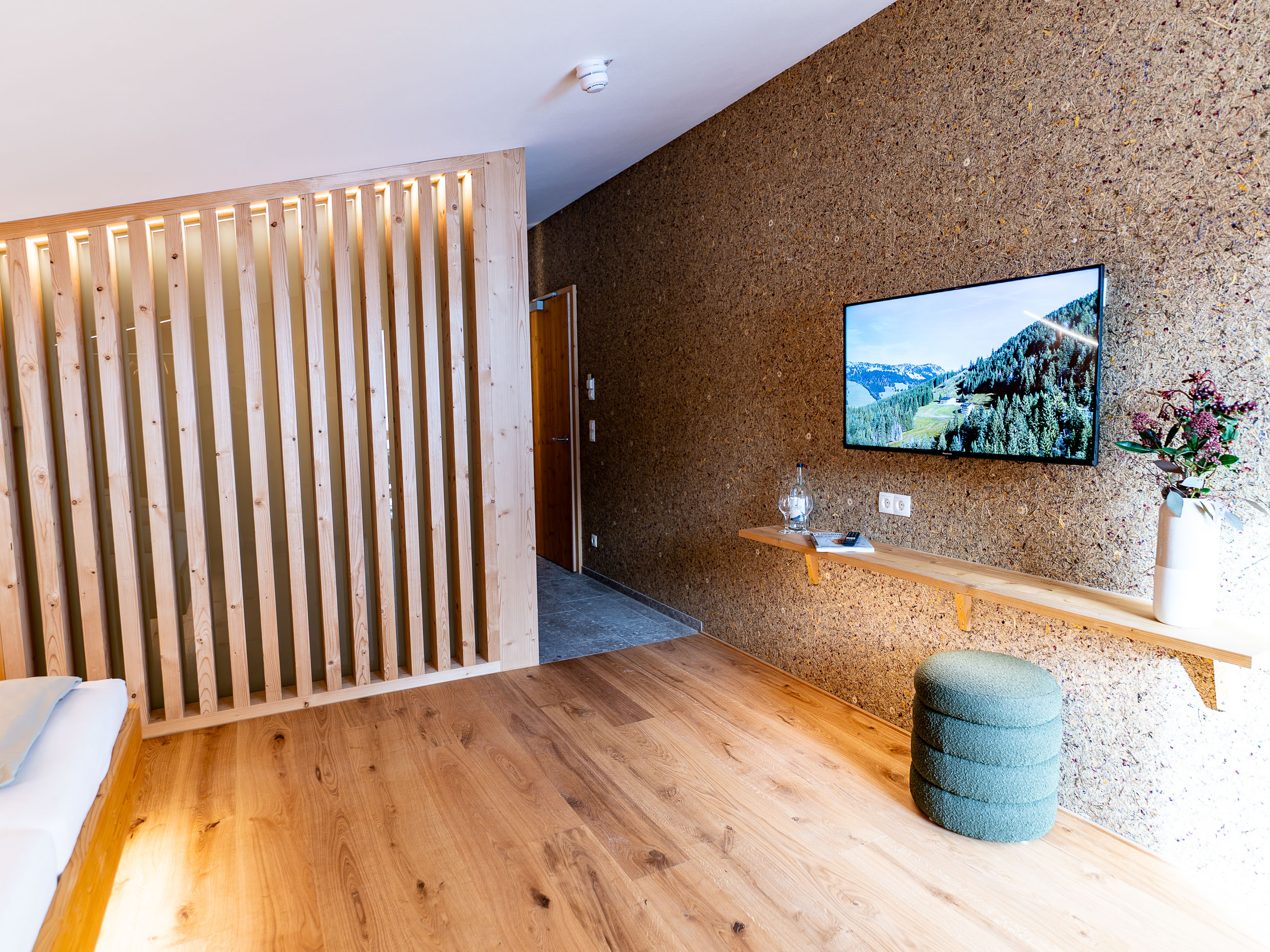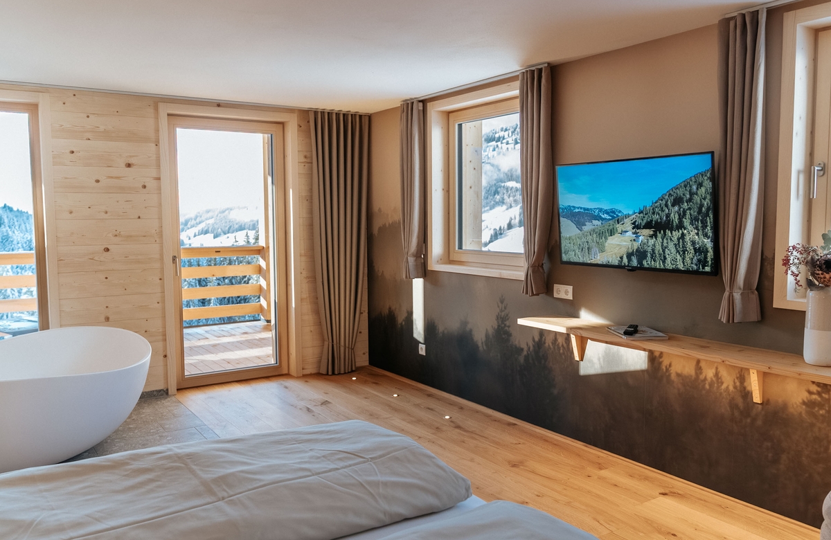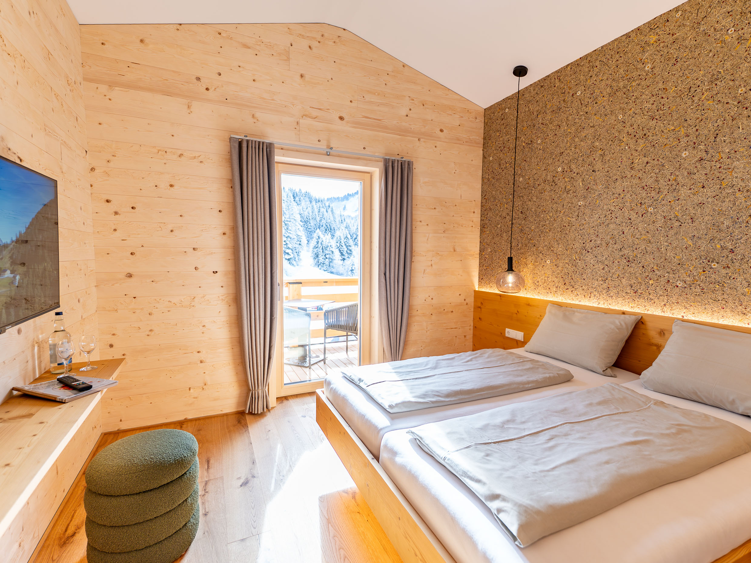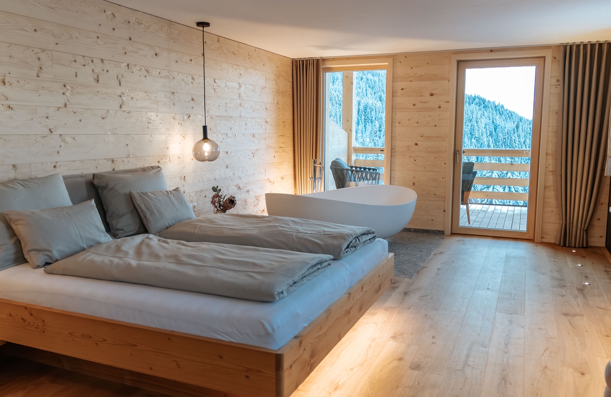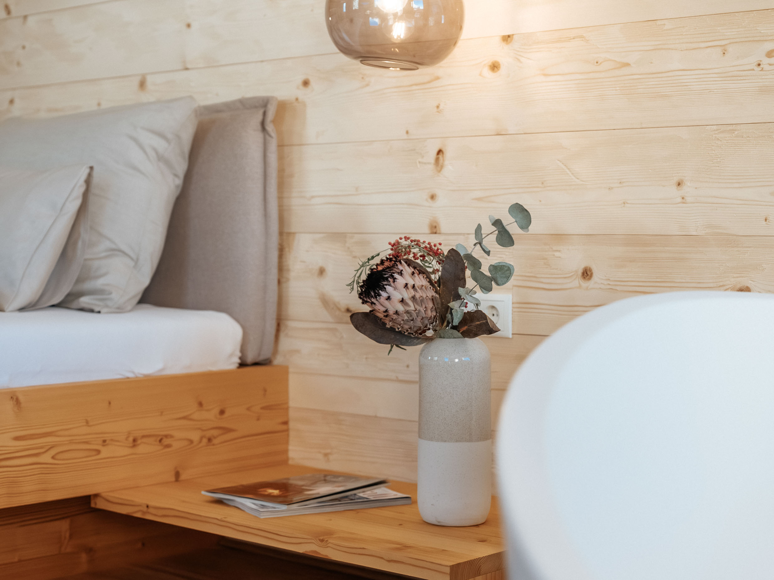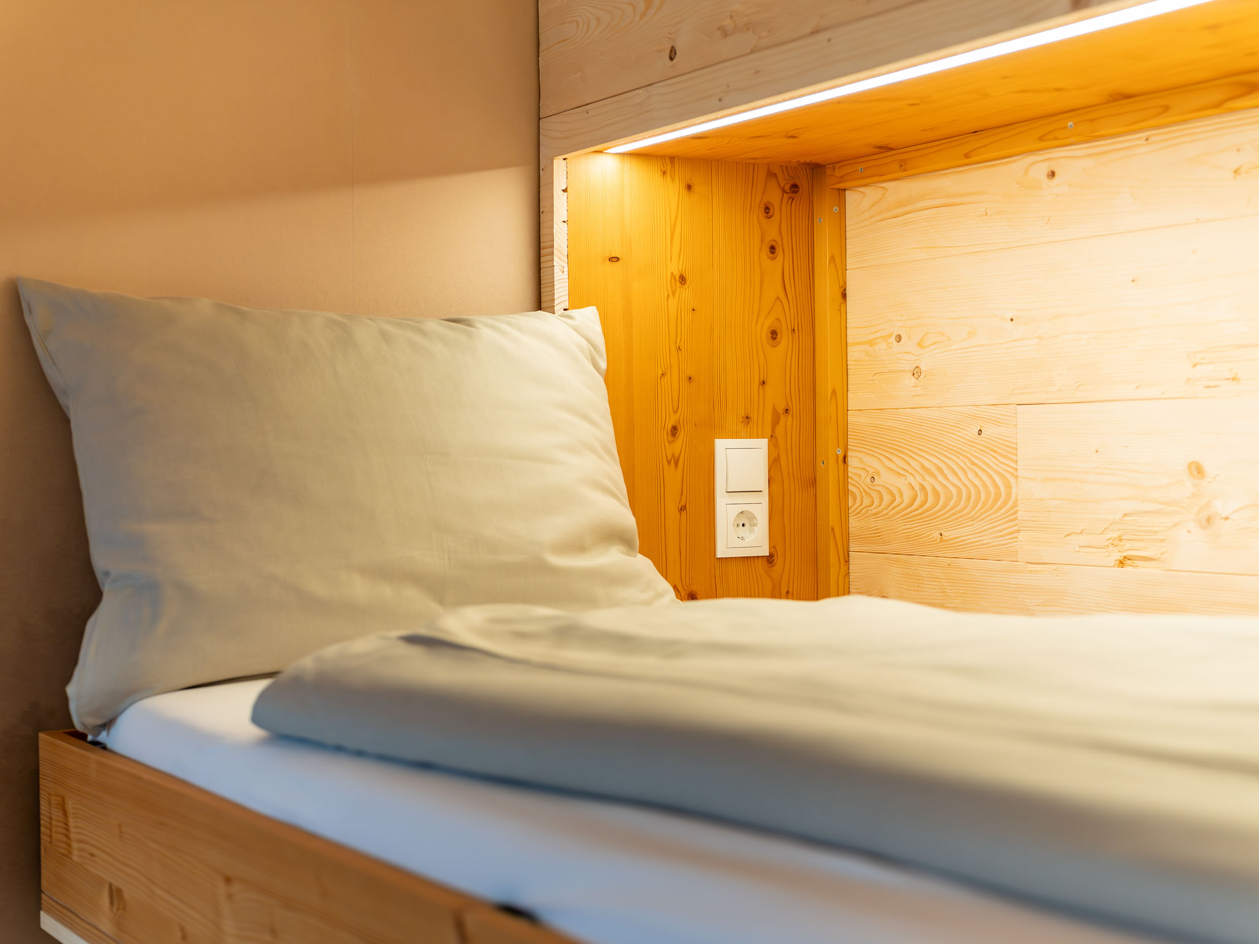 Gestalterisch greifen die Zimmer den klassischen Hüttenstil auf: viel Holz, warme Materialien und eine behagliche Atmosphäre, die das alpine Lebensgefühl von Wald & Wiesn widerspiegelt. Die Hütte ist damit der perfekte Ort für alle, die gerne mittendrin wohnen und das Herz des Hauses bewusst erleben möchten.
