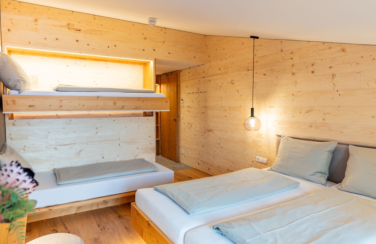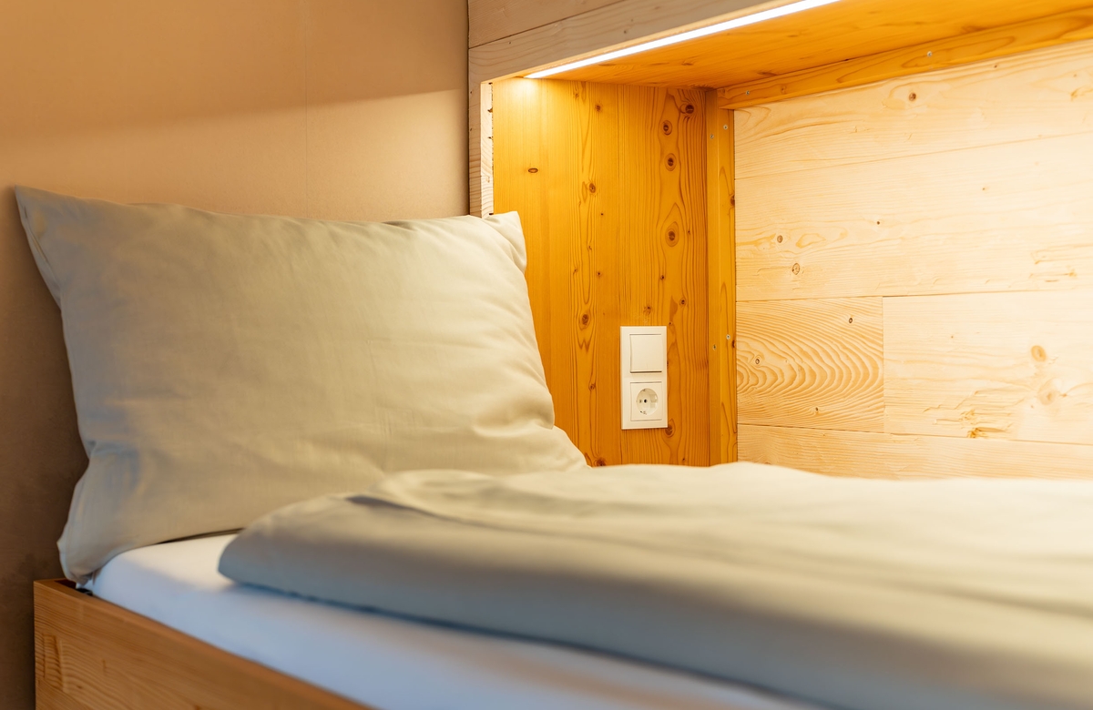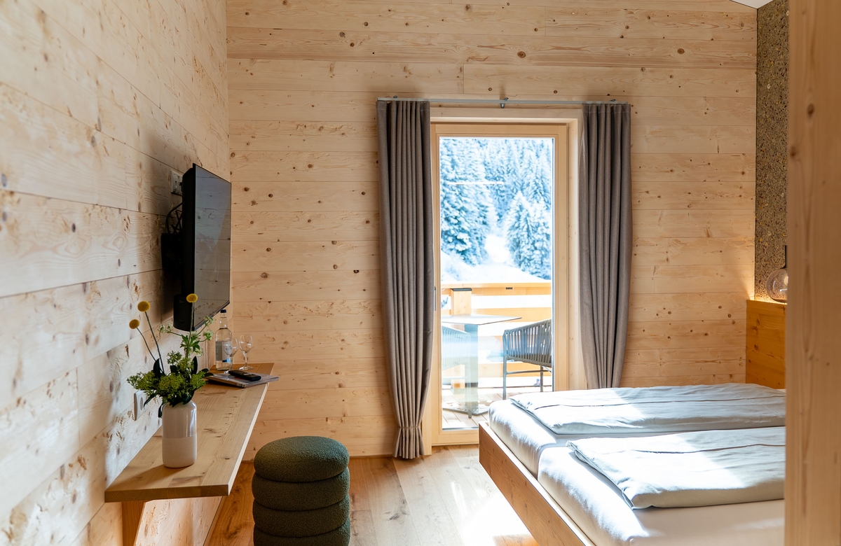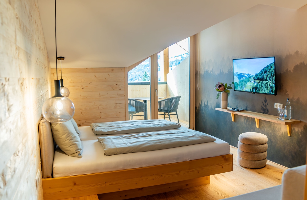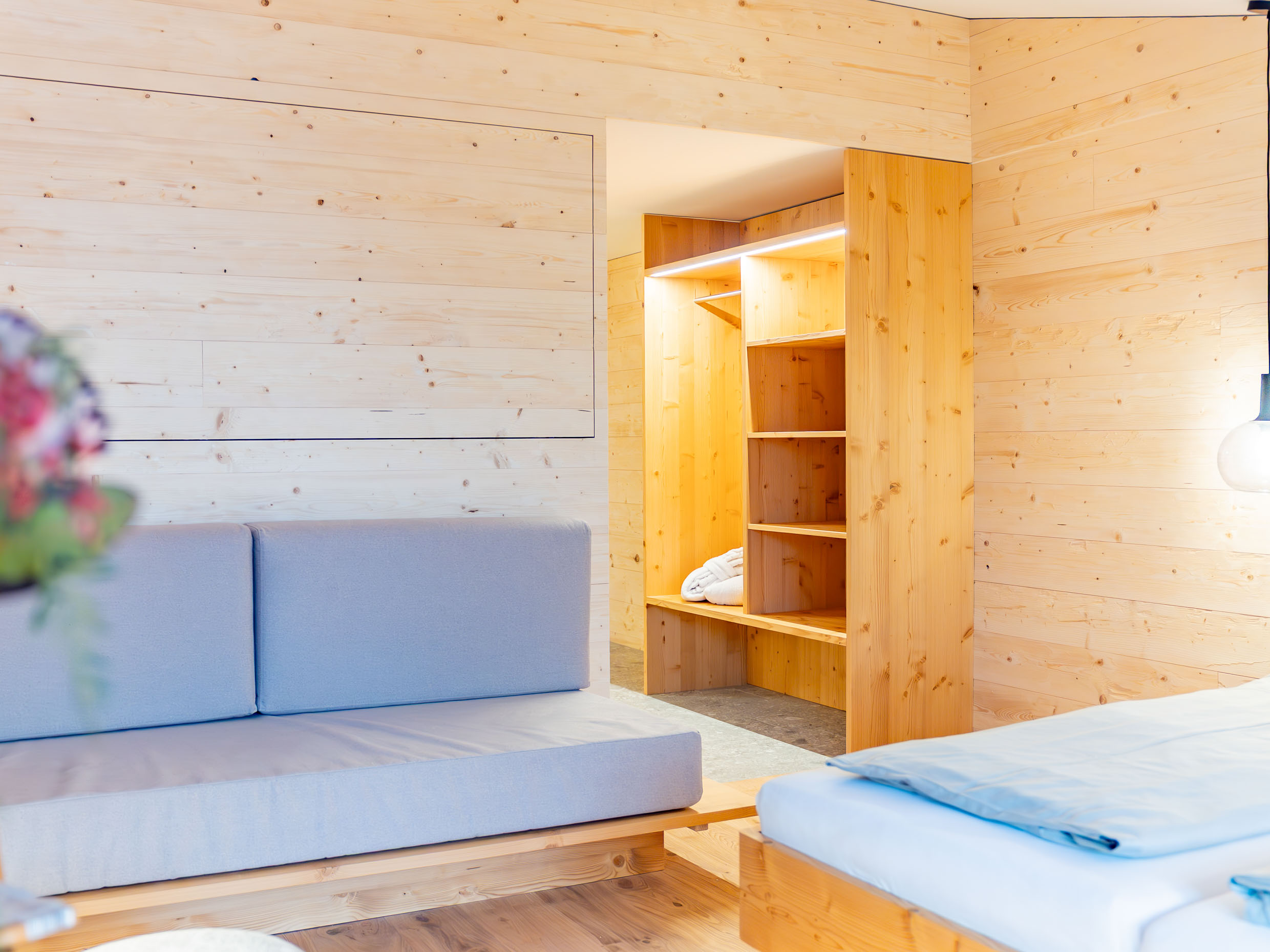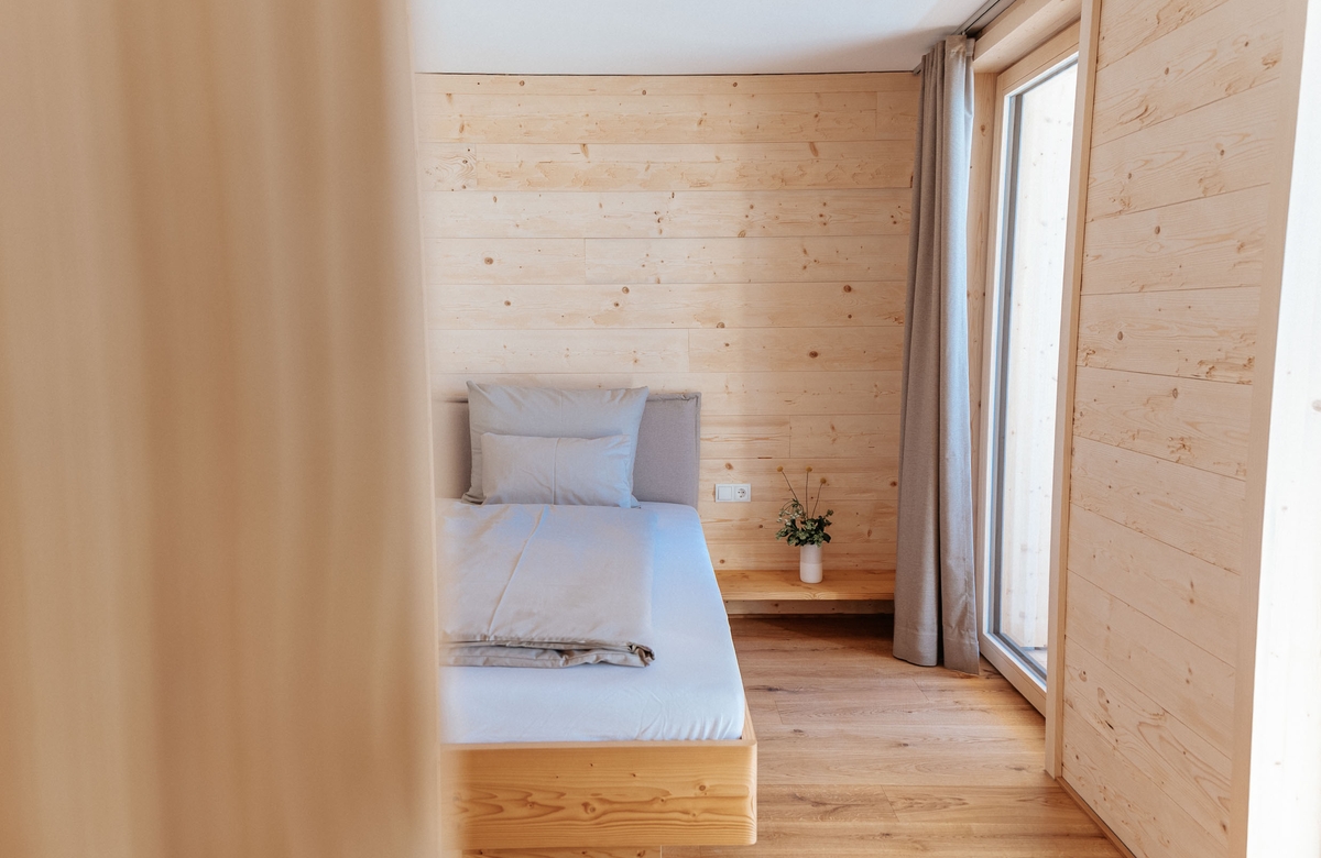 Gestalterisch greifen die Zimmer den klassischen Hüttenstil auf: viel Holz, warme Materialien und eine behagliche Atmosphäre, die das alpine Lebensgefühl von Wald & Wiesn widerspiegelt. Die Hütte ist damit der perfekte Ort für alle, die gerne mittendrin wohnen und das Herz des Hauses bewusst erleben möchten.