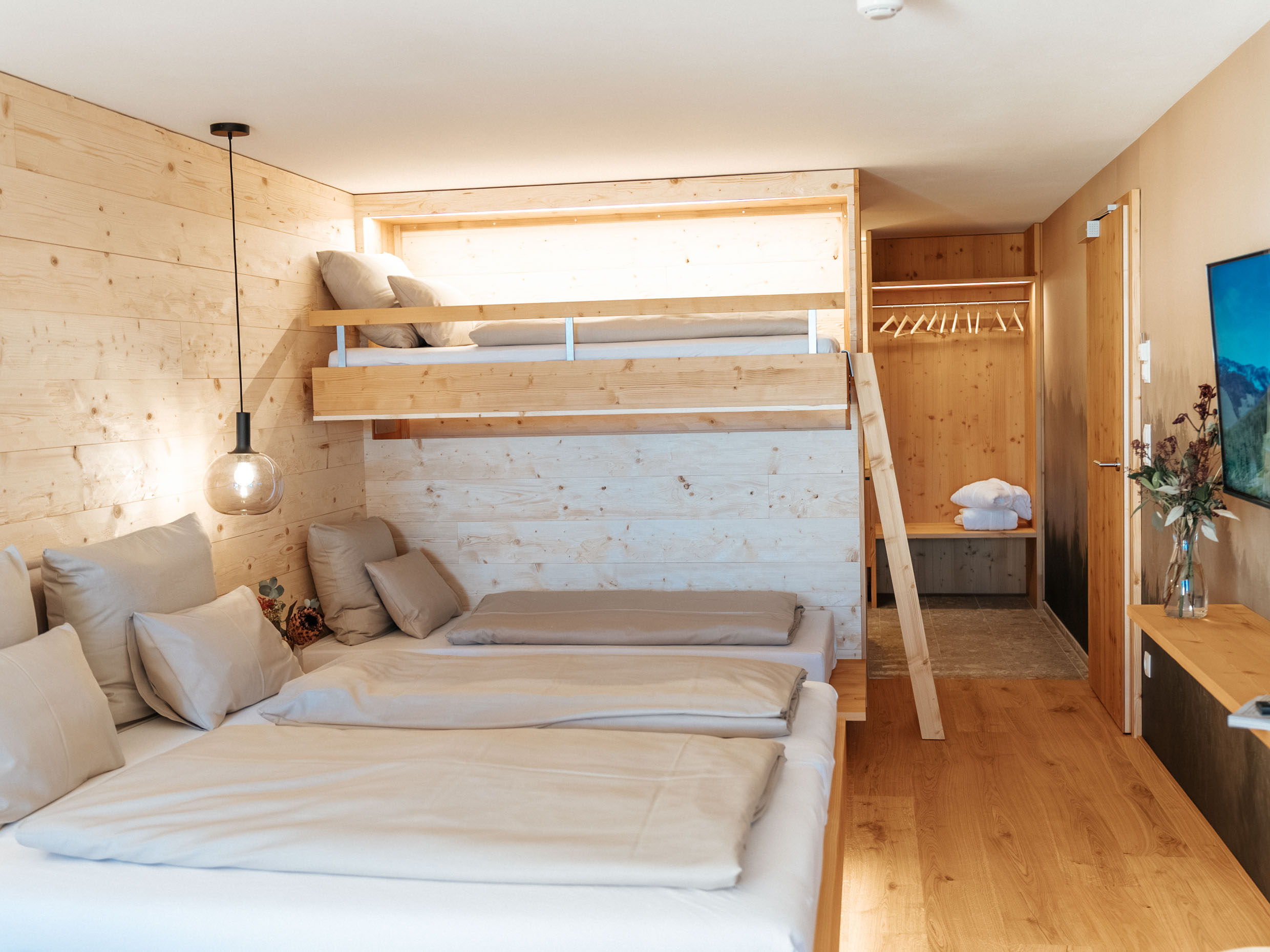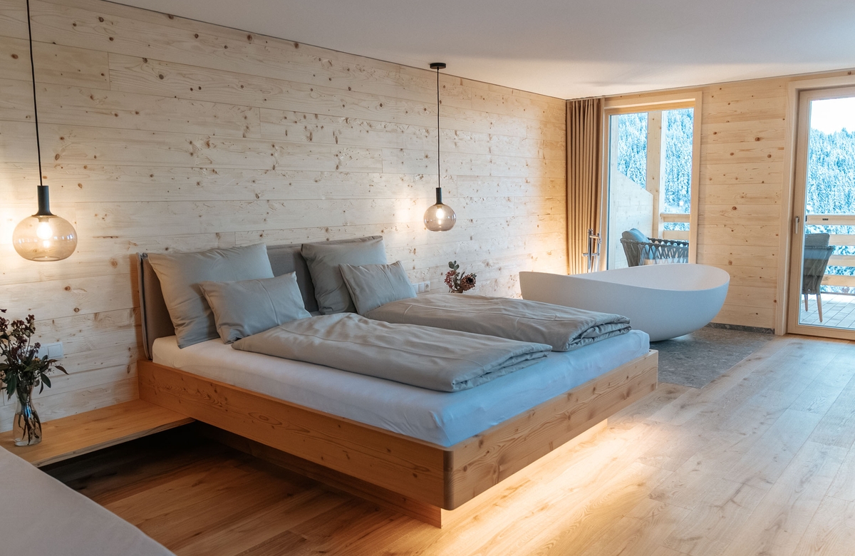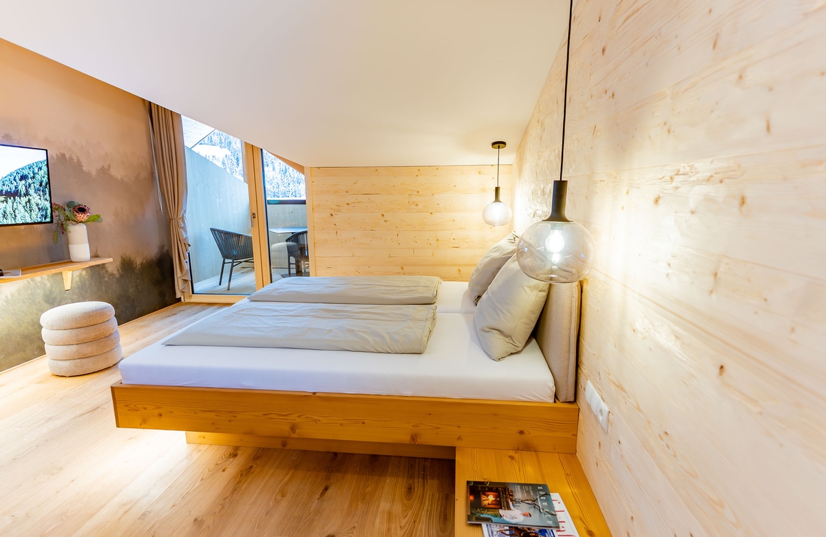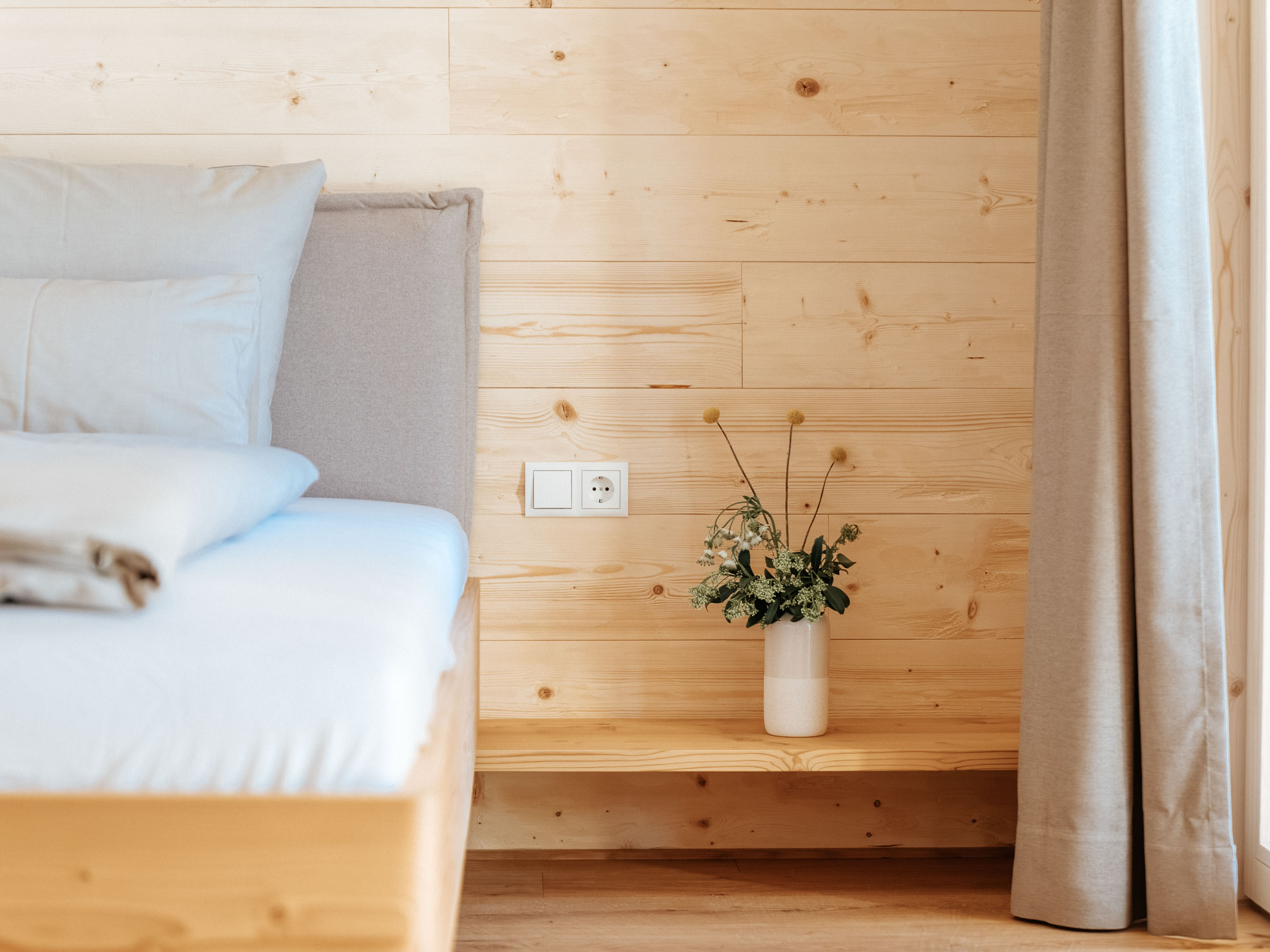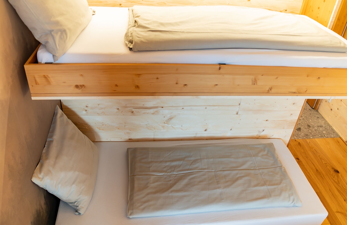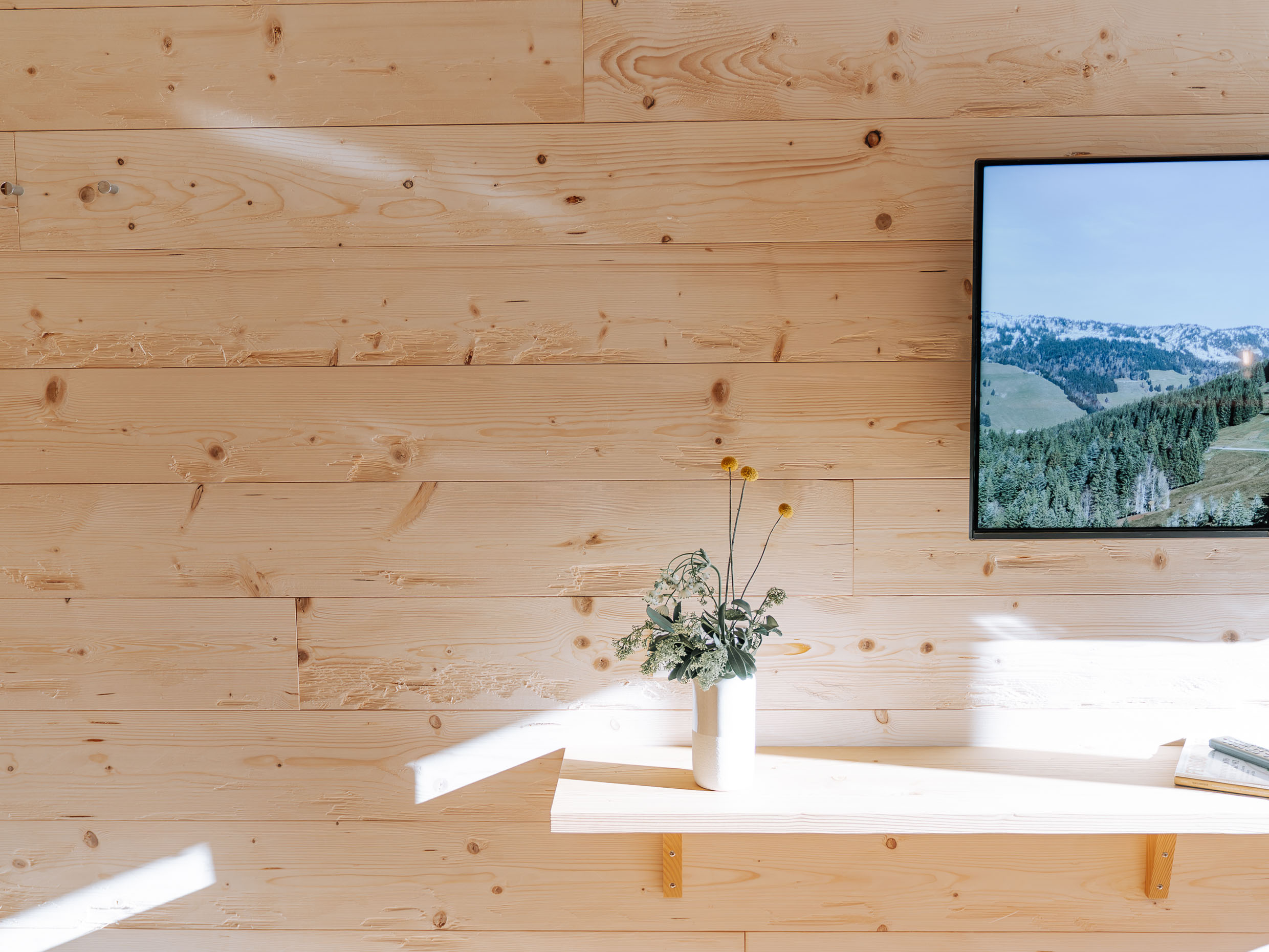 Gestalterisch greifen die Zimmer den klassischen Hüttenstil auf: viel Holz, warme Materialien und eine behagliche Atmosphäre, die das alpine Lebensgefühl von Wald & Wiesn widerspiegelt. Die Hütte ist damit der perfekte Ort für alle, die gerne mittendrin wohnen und das Herz des Hauses bewusst erleben möchten.