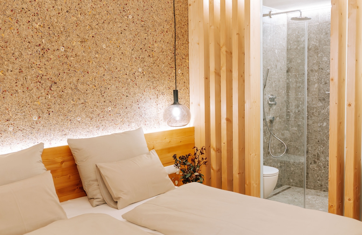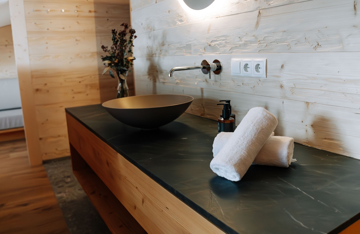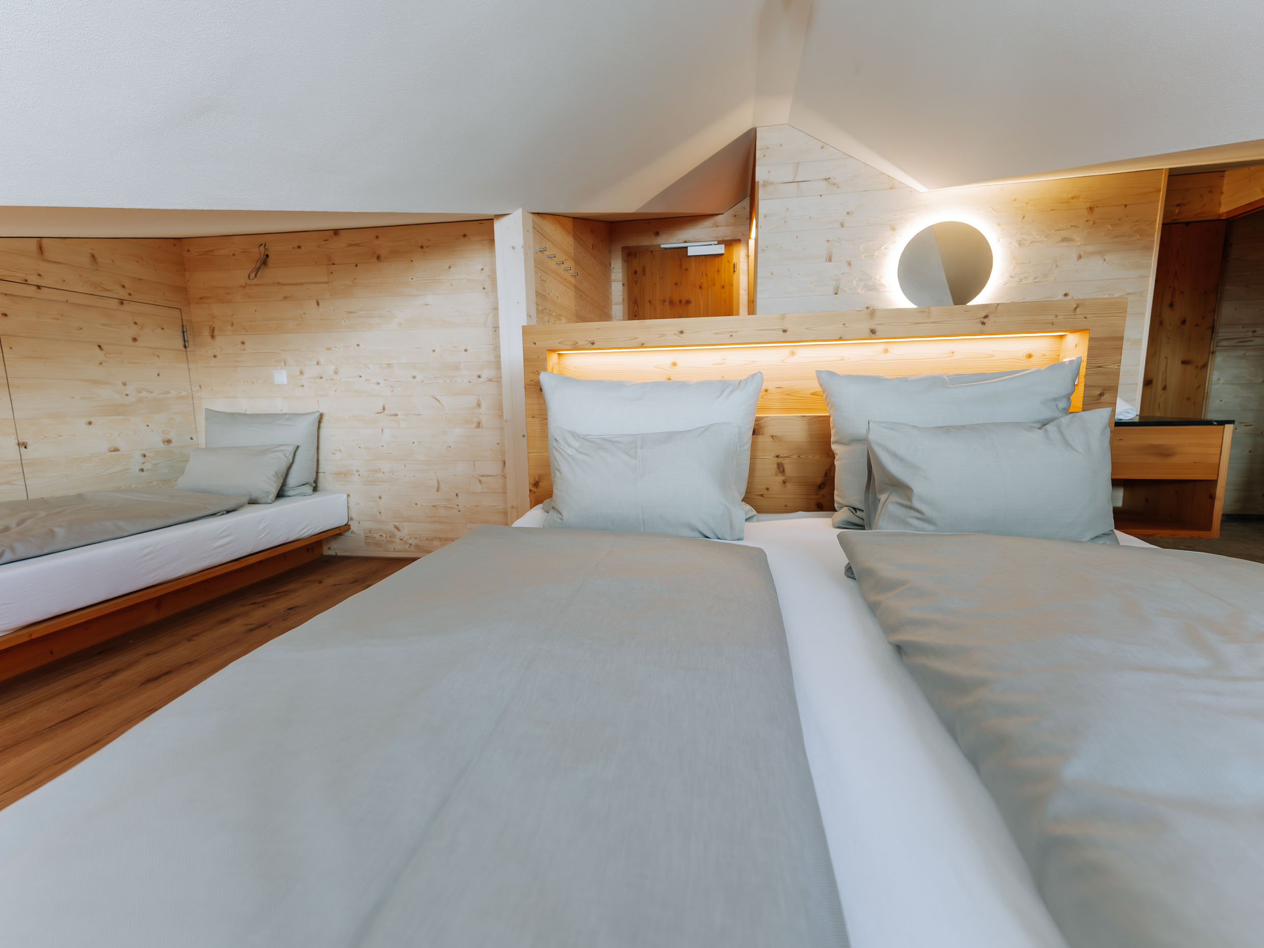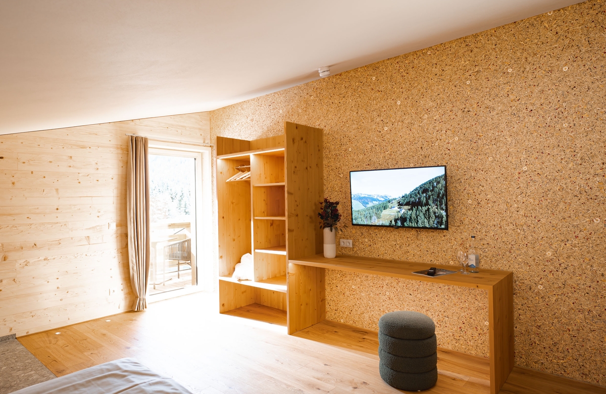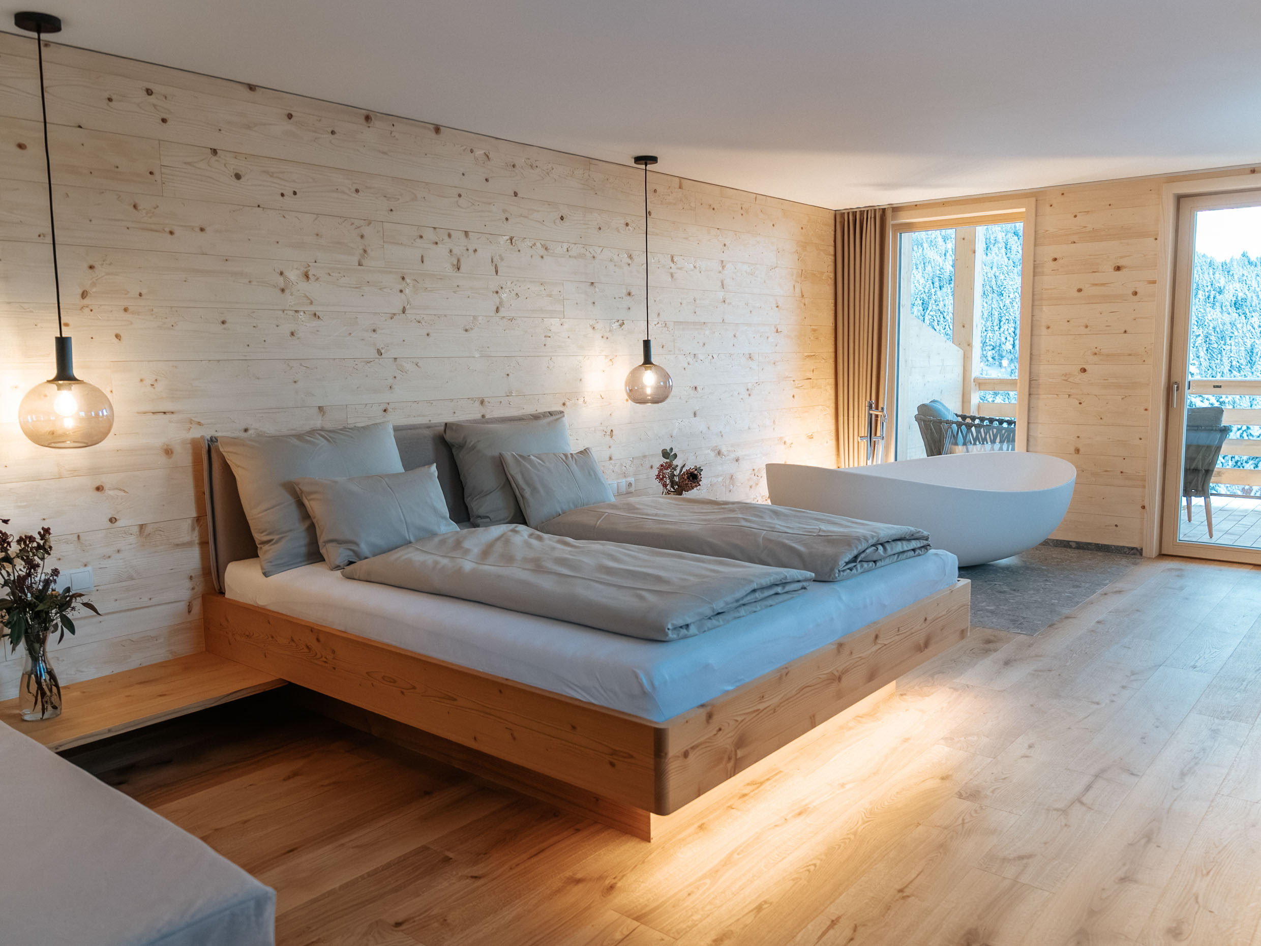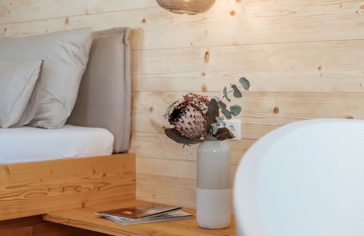 Gestalterisch greifen die Zimmer den klassischen Hüttenstil auf: viel Holz, warme Materialien und eine behagliche Atmosphäre, die das alpine Lebensgefühl von Wald & Wiesn widerspiegelt. Die Hütte ist damit der perfekte Ort für alle, die gerne mittendrin wohnen und das Herz des Hauses bewusst erleben möchten.