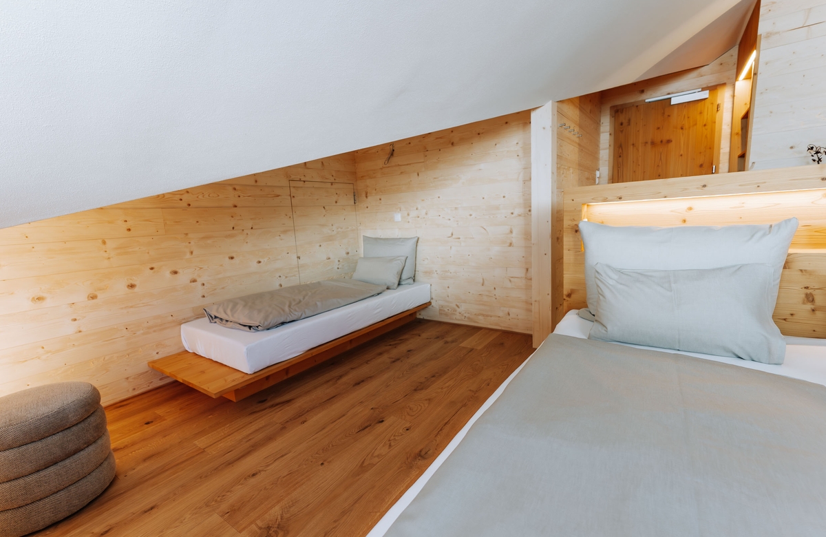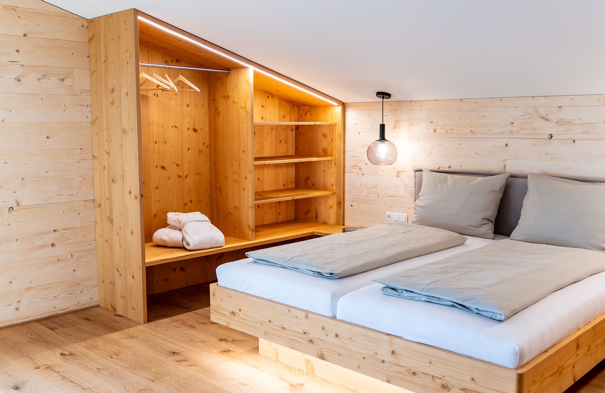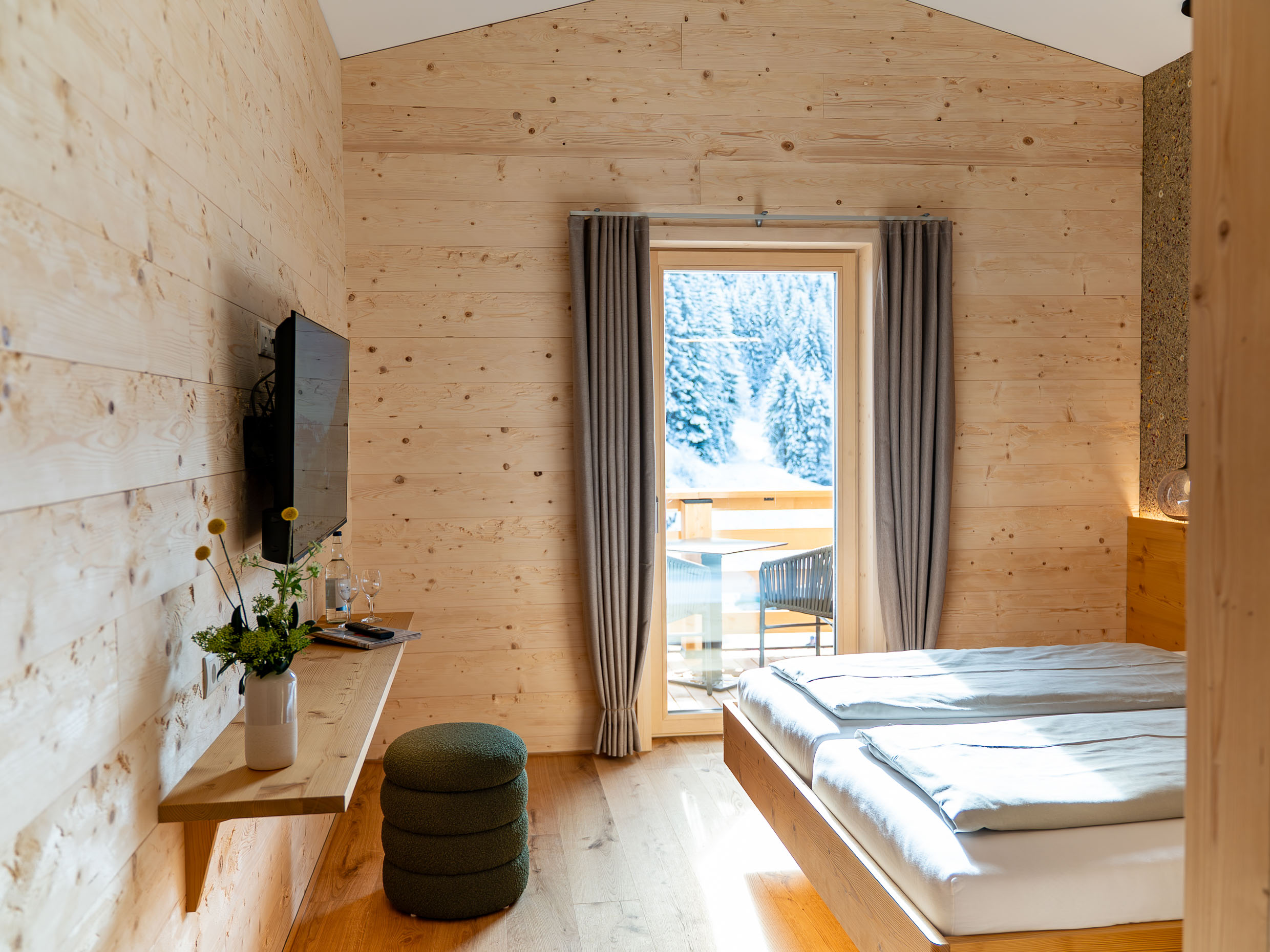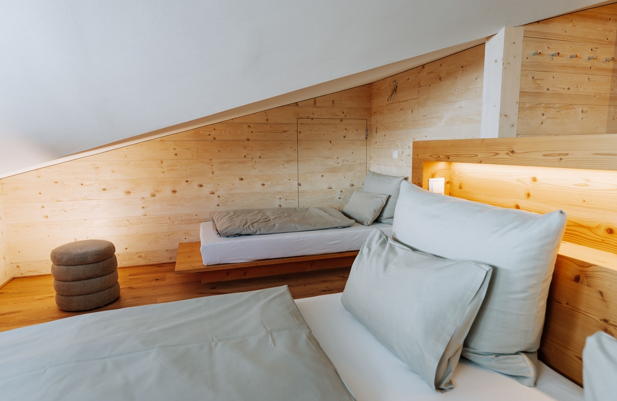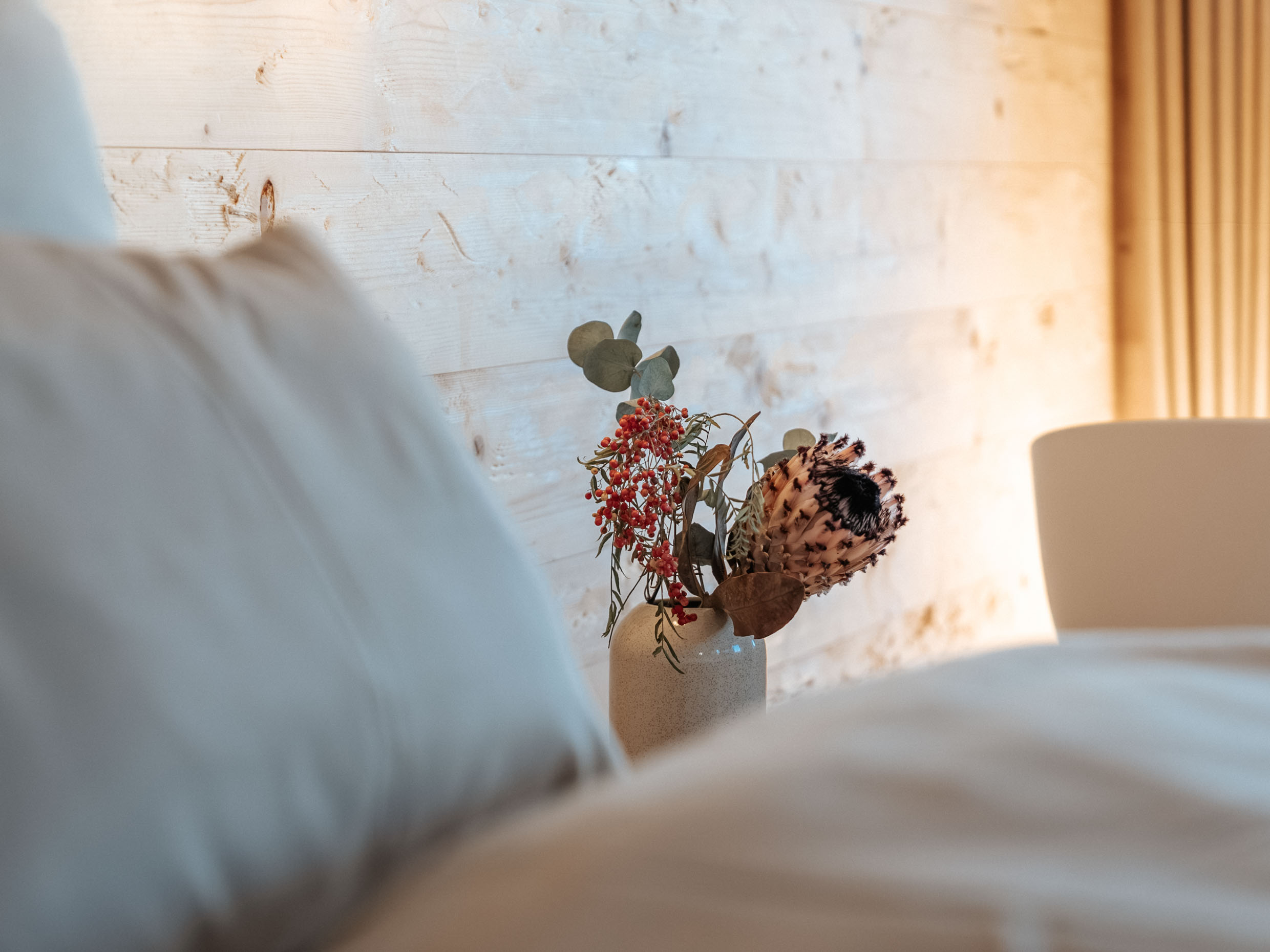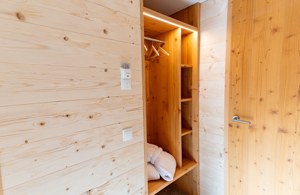 Gestalterisch greifen die Zimmer den klassischen Hüttenstil auf: viel Holz, warme Materialien und eine behagliche Atmosphäre, die das alpine Lebensgefühl von Wald & Wiesn widerspiegelt. Die Hütte ist damit der perfekte Ort für alle, die gerne mittendrin wohnen und das Herz des Hauses bewusst erleben möchten.
