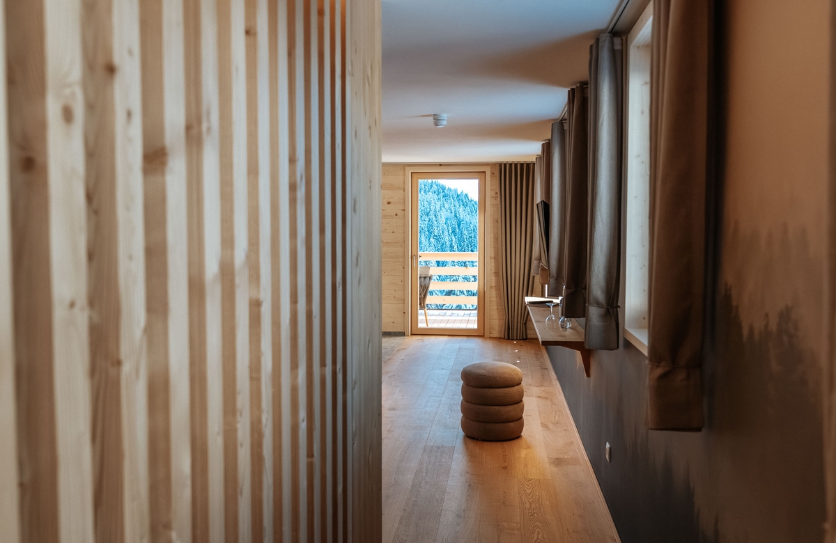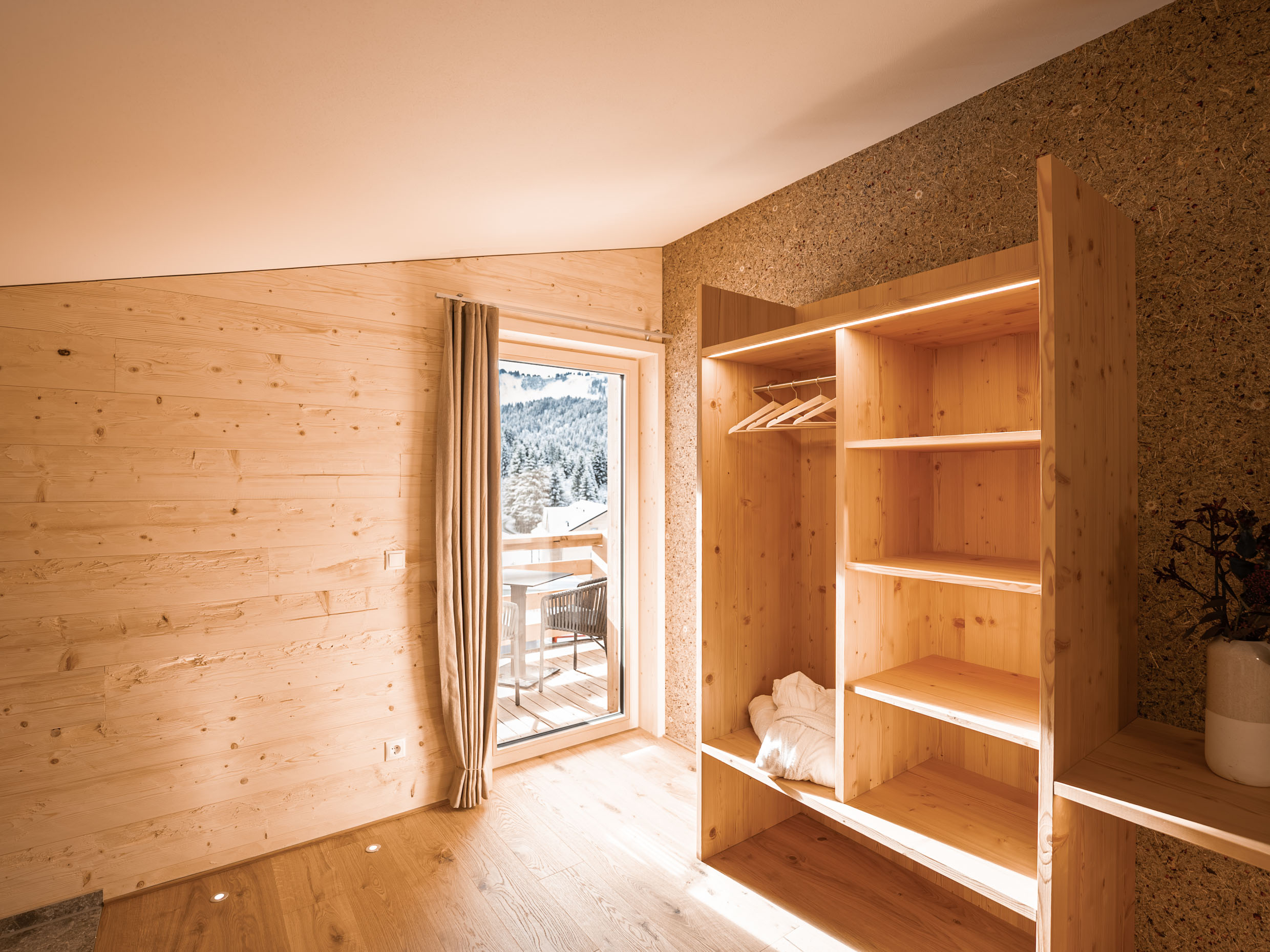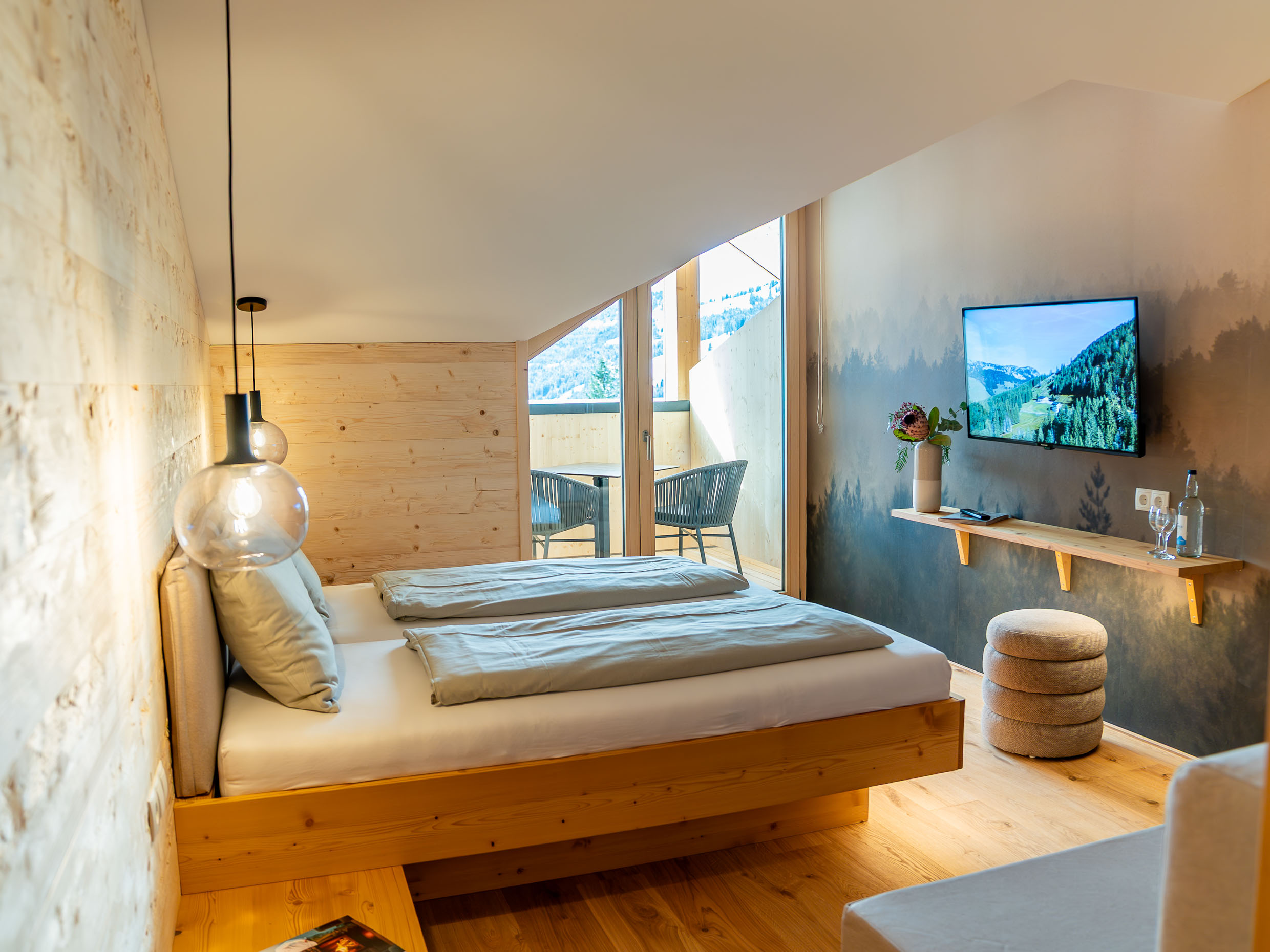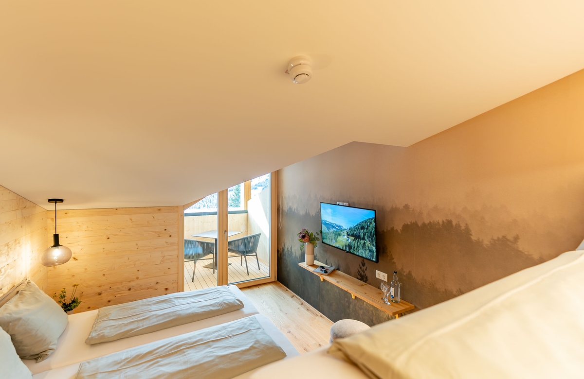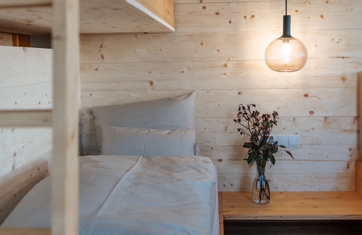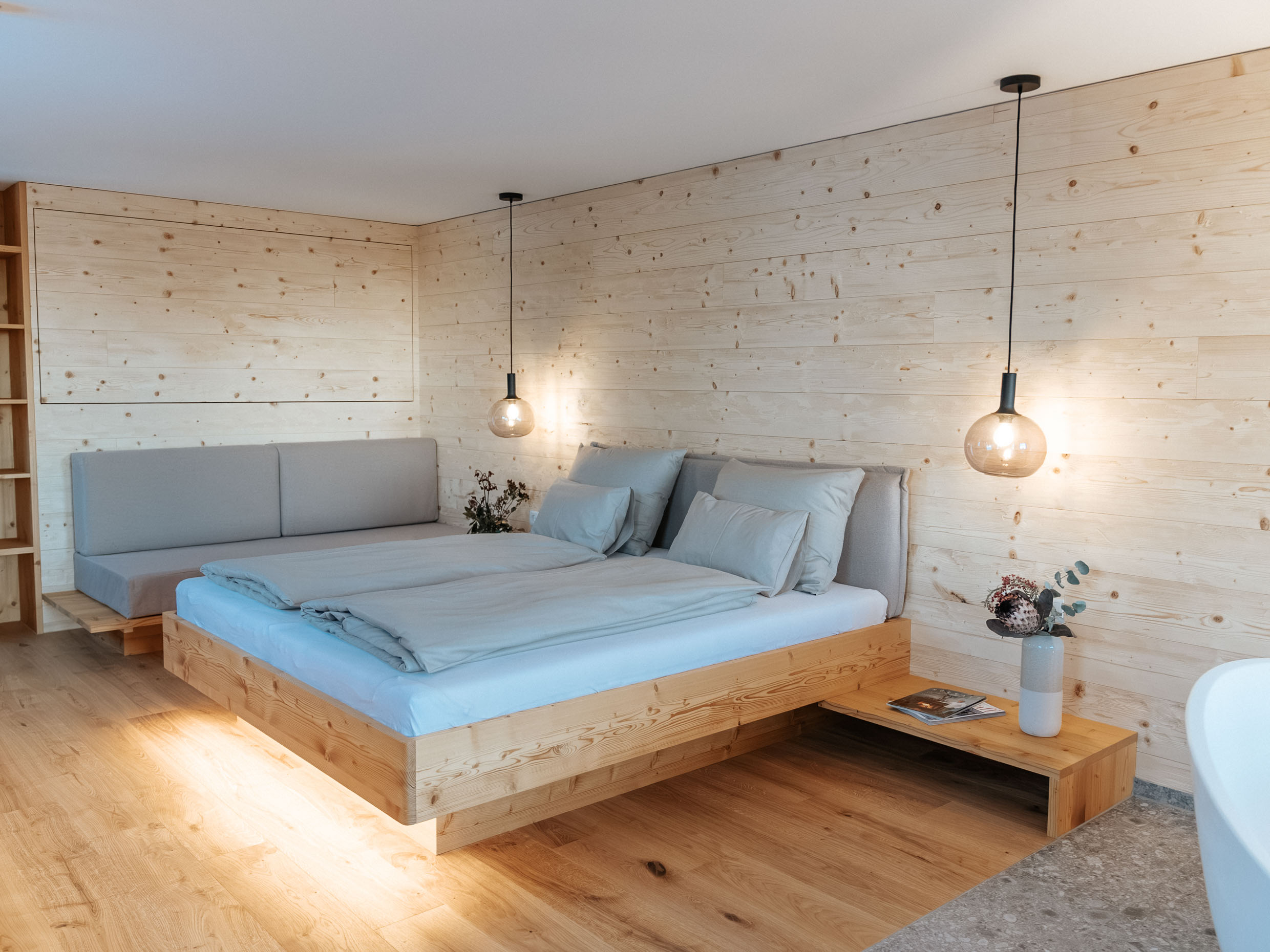 Gestalterisch greifen die Zimmer den klassischen Hüttenstil auf: viel Holz, warme Materialien und eine behagliche Atmosphäre, die das alpine Lebensgefühl von Wald & Wiesn widerspiegelt. Die Hütte ist damit der perfekte Ort für alle, die gerne mittendrin wohnen und das Herz des Hauses bewusst erleben möchten.
