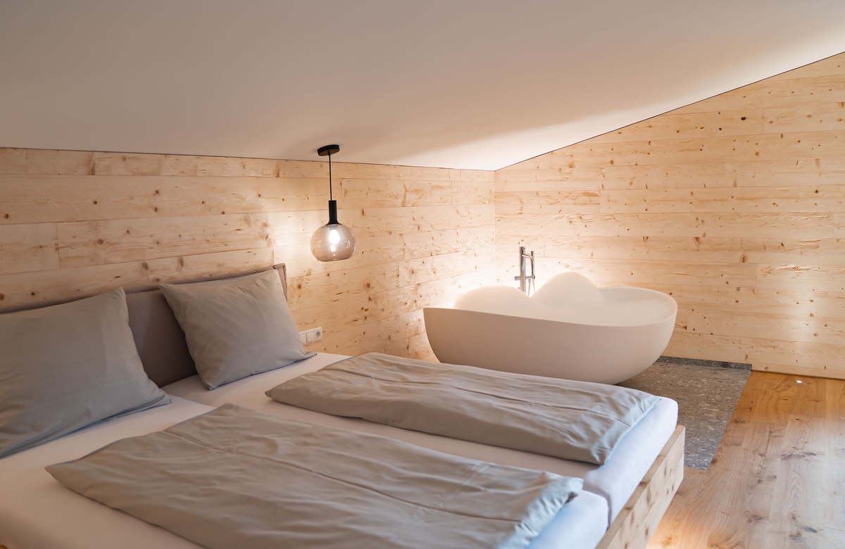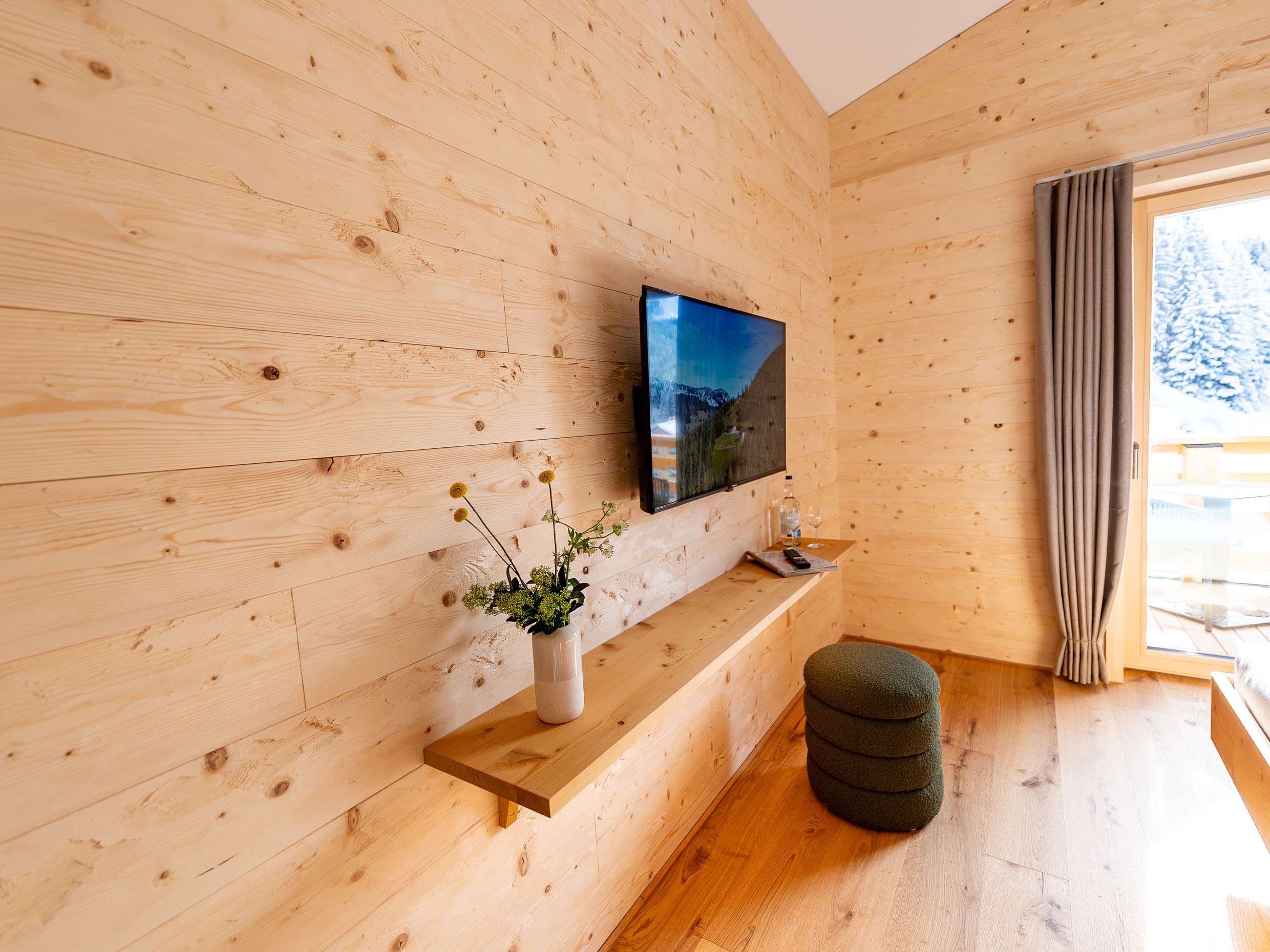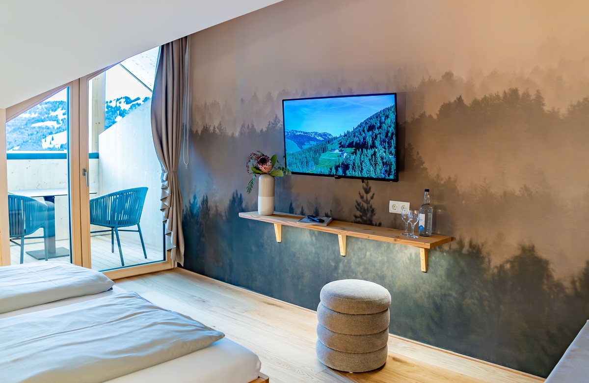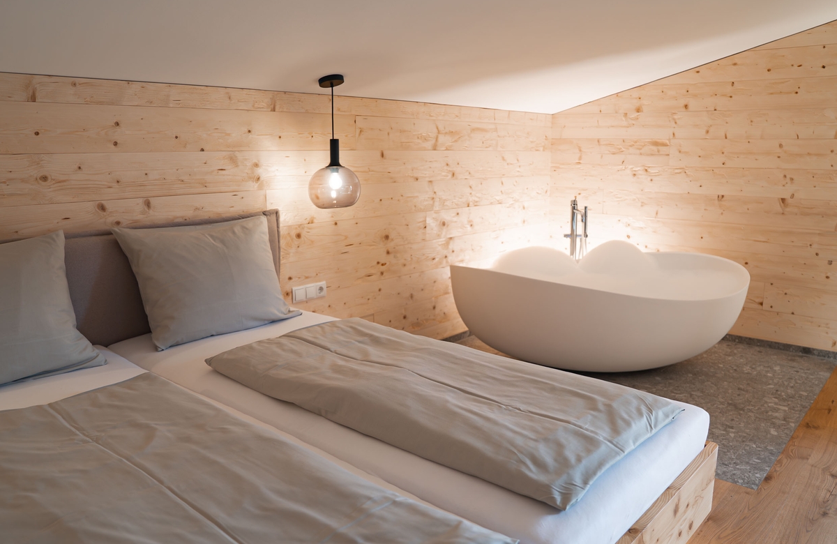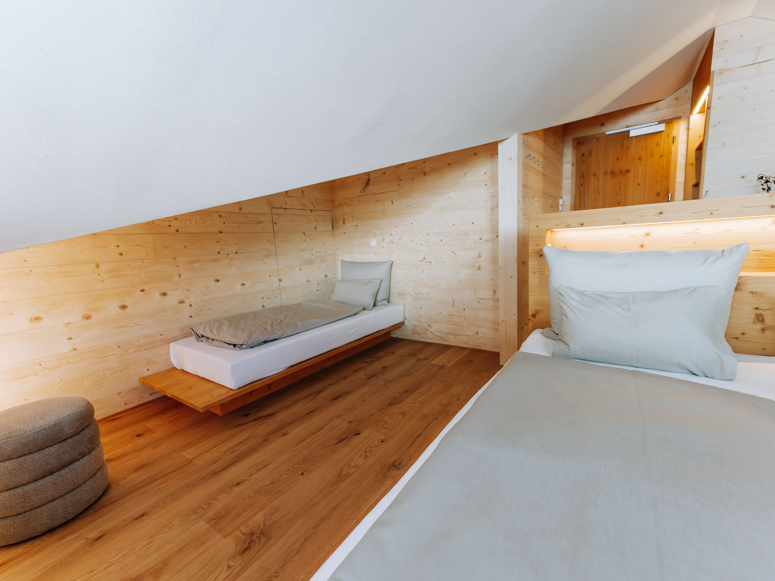 Gestalterisch greifen die Zimmer den klassischen Hüttenstil auf: viel Holz, warme Materialien und eine behagliche Atmosphäre, die das alpine Lebensgefühl von Wald & Wiesn widerspiegelt. Die Hütte ist damit der perfekte Ort für alle, die gerne mittendrin wohnen und das Herz des Hauses bewusst erleben möchten.