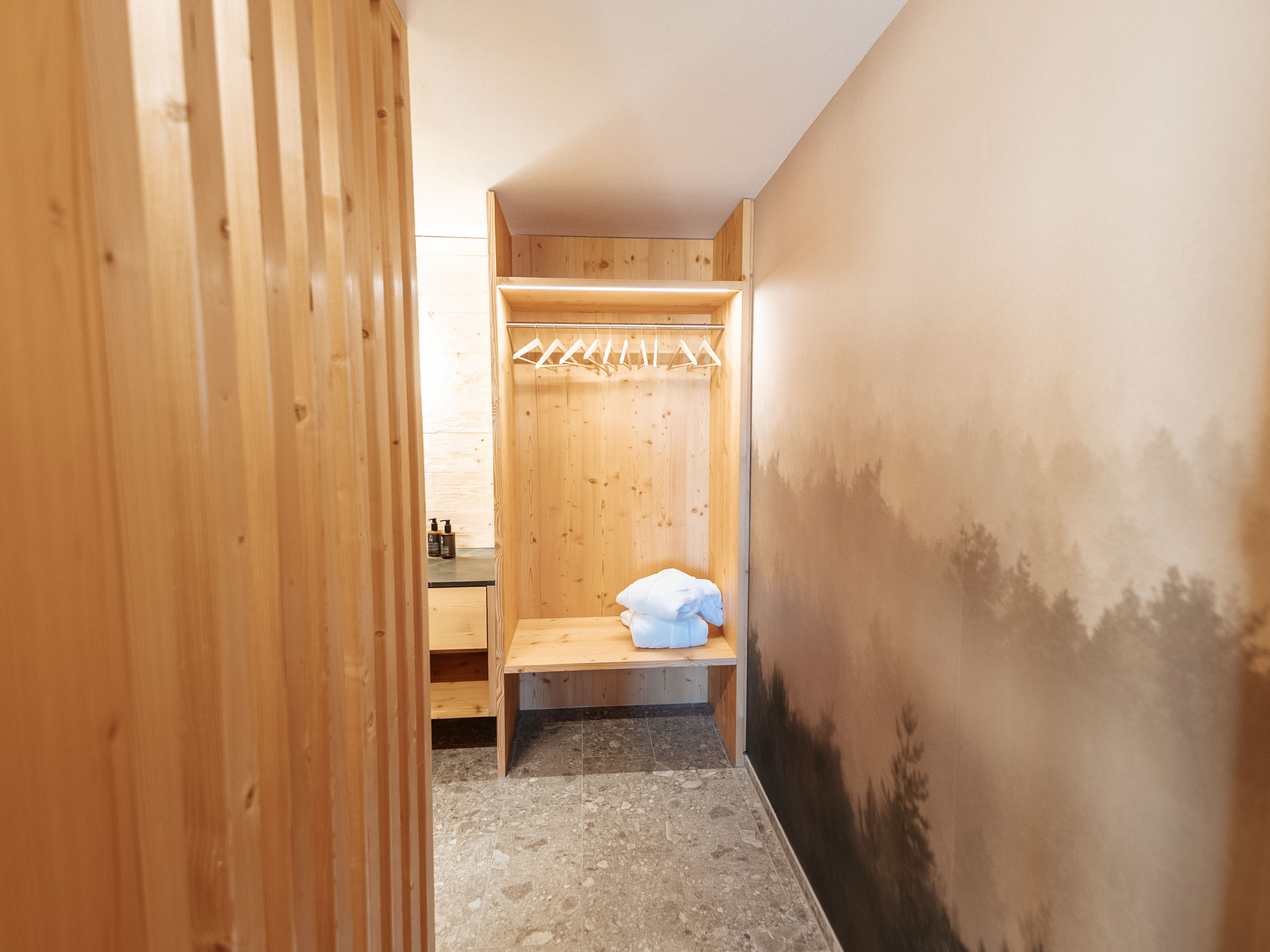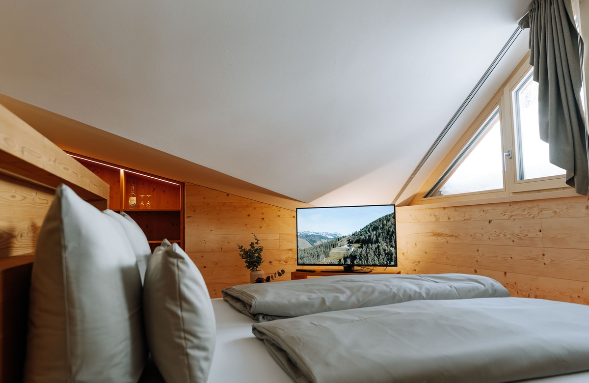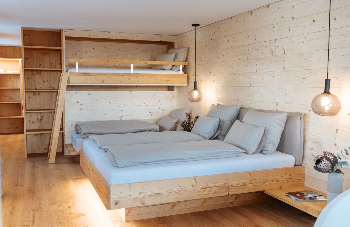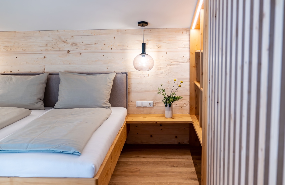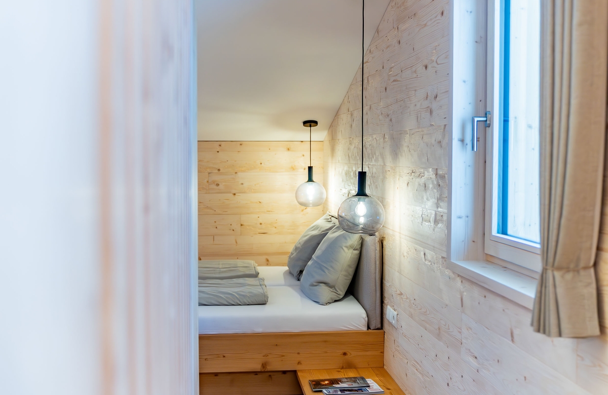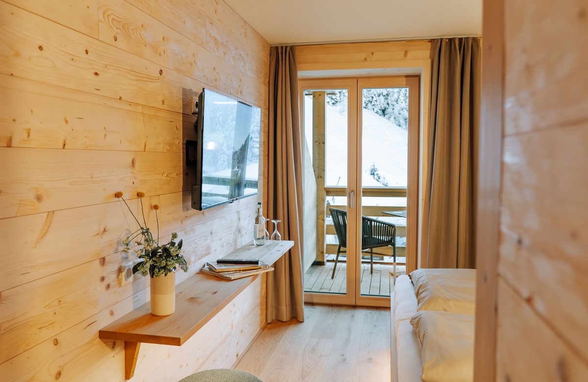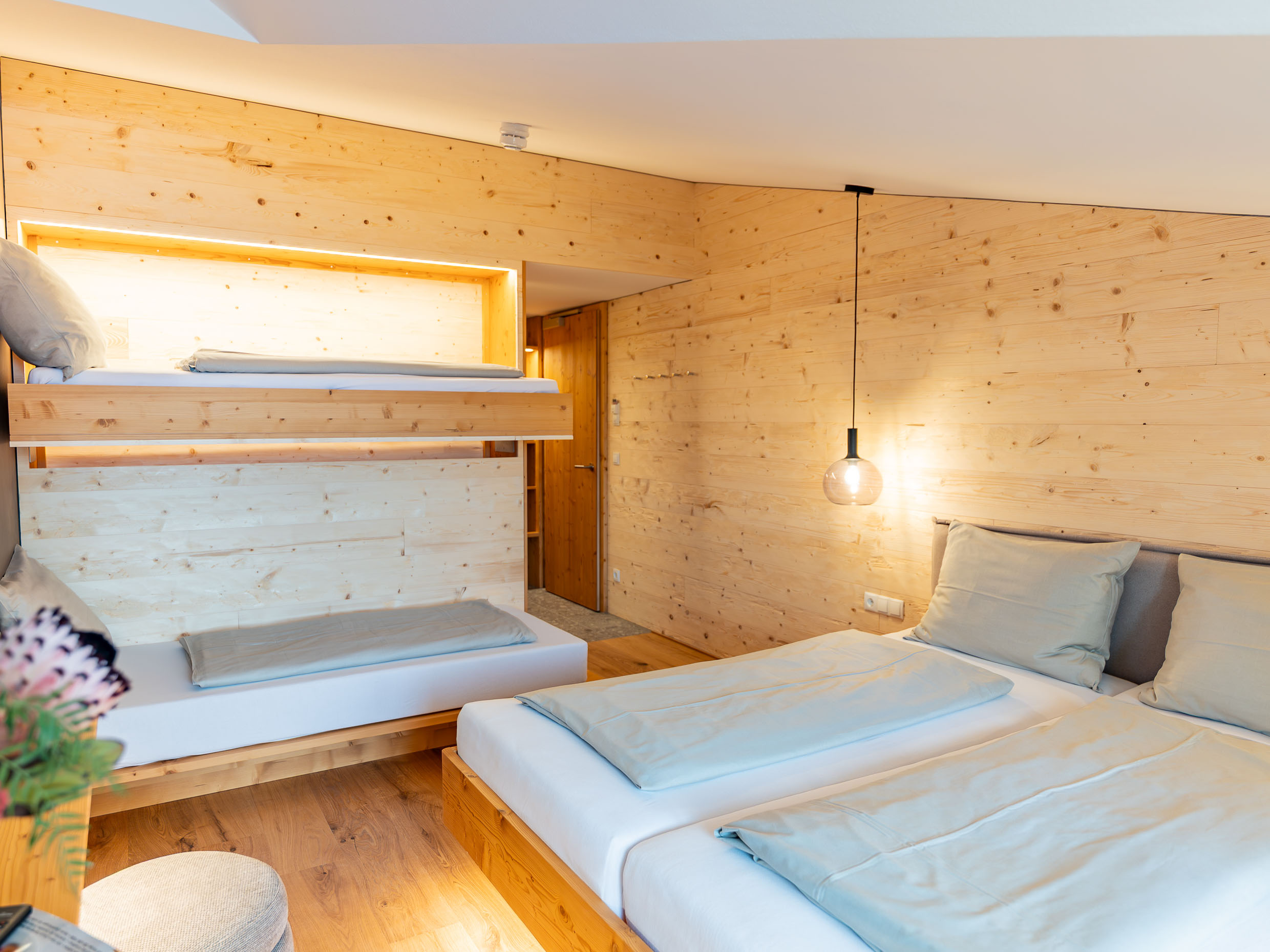 Gestalterisch greifen die Zimmer den klassischen Hüttenstil auf: viel Holz, warme Materialien und eine behagliche Atmosphäre, die das alpine Lebensgefühl von Wald & Wiesn widerspiegelt. Die Hütte ist damit der perfekte Ort für alle, die gerne mittendrin wohnen und das Herz des Hauses bewusst erleben möchten.