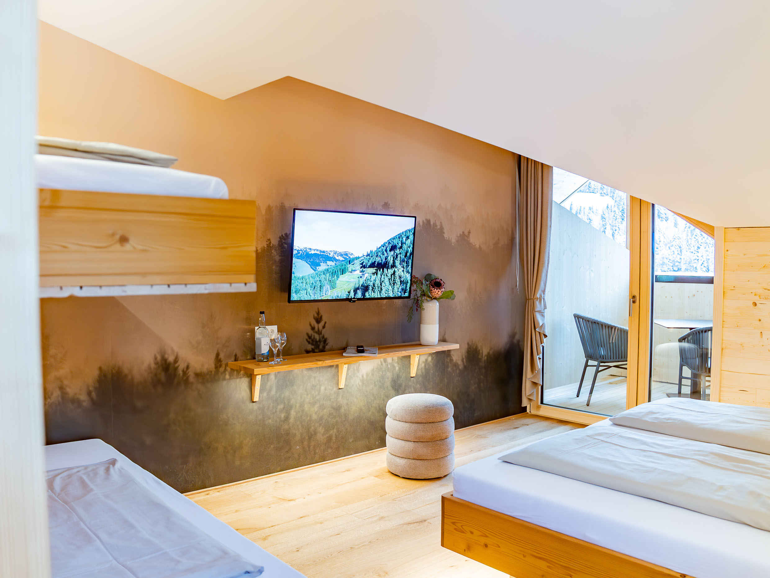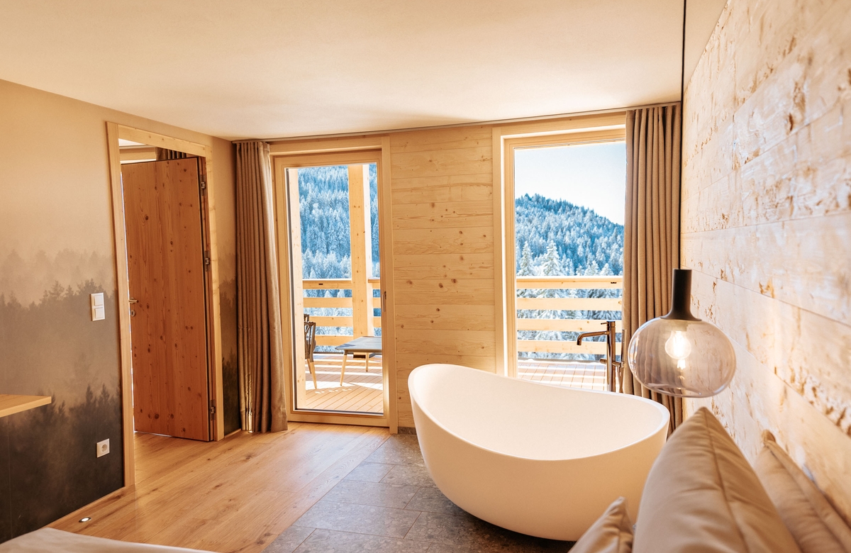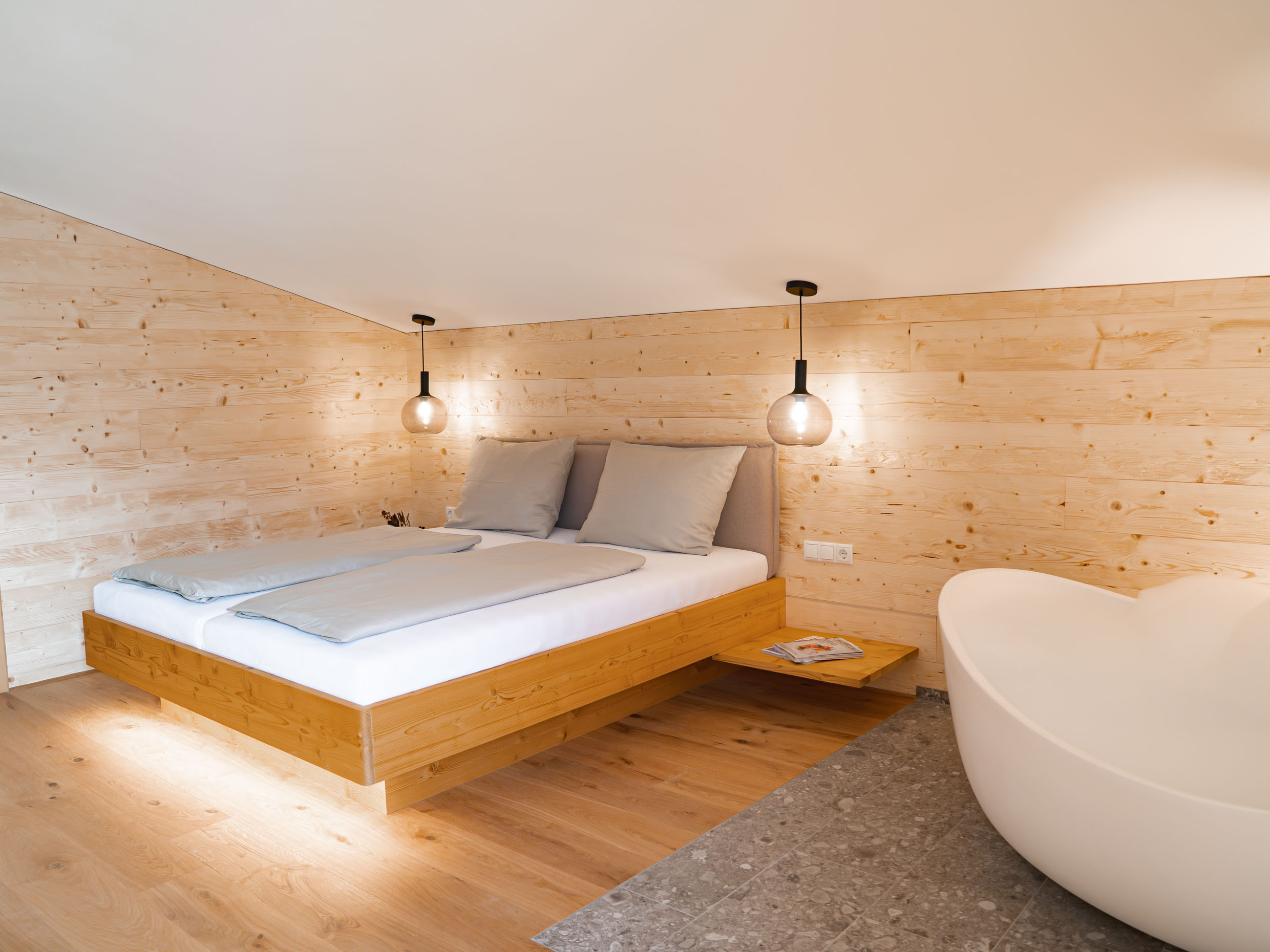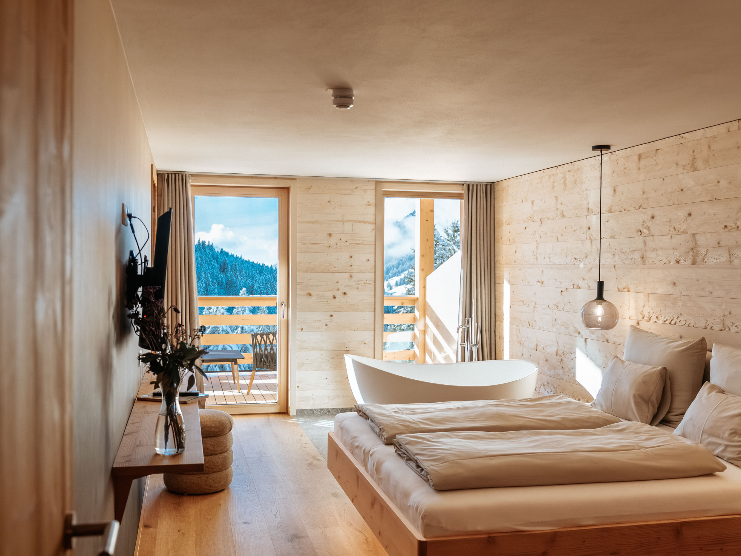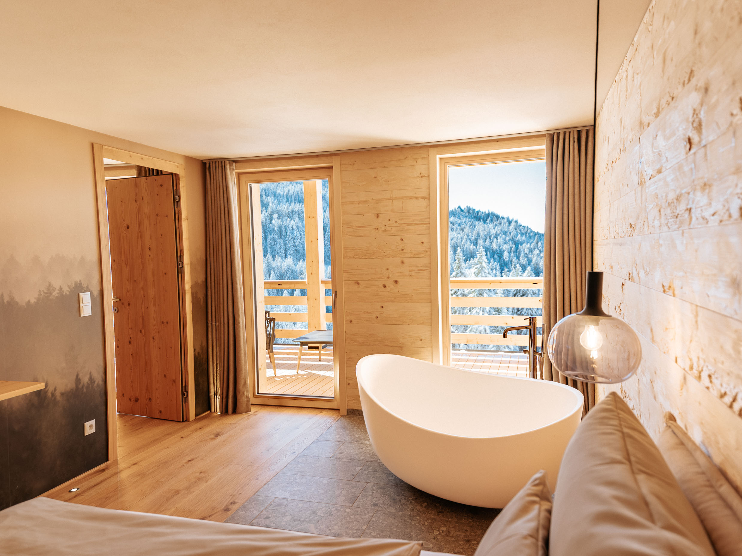 Gestalterisch greifen die Zimmer den klassischen Hüttenstil auf: viel Holz, warme Materialien und eine behagliche Atmosphäre, die das alpine Lebensgefühl von Wald & Wiesn widerspiegelt. Die Hütte ist damit der perfekte Ort für alle, die gerne mittendrin wohnen und das Herz des Hauses bewusst erleben möchten.