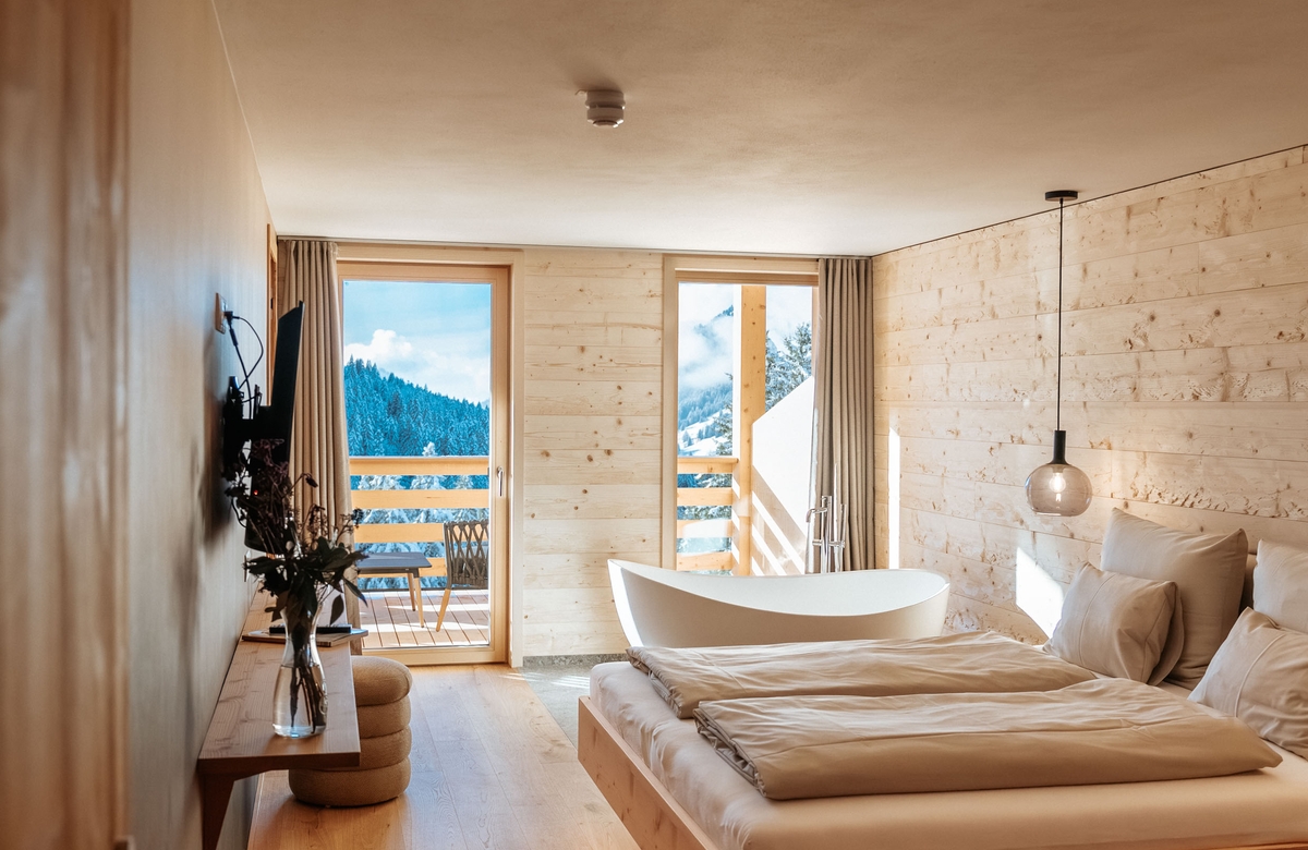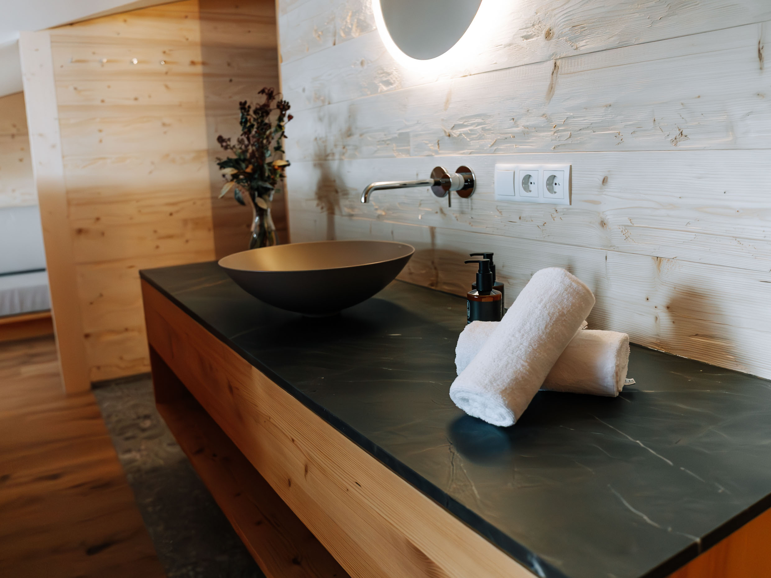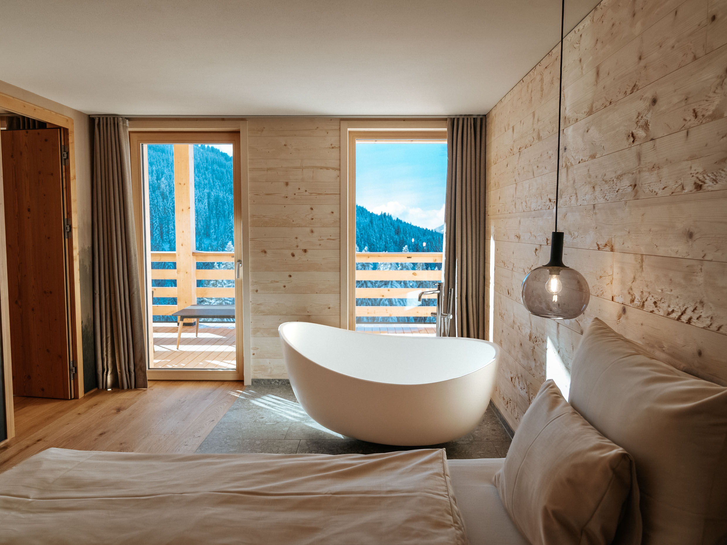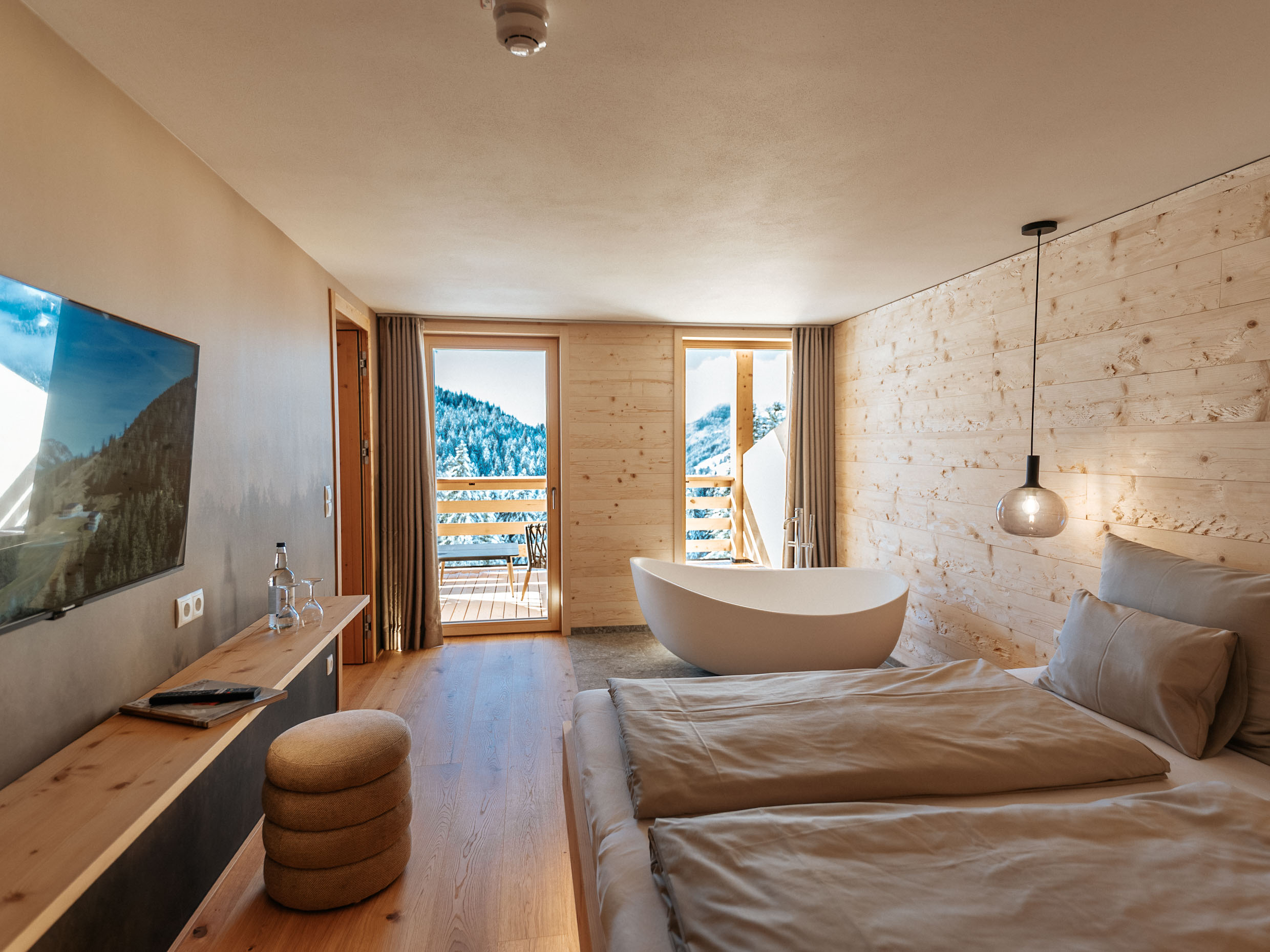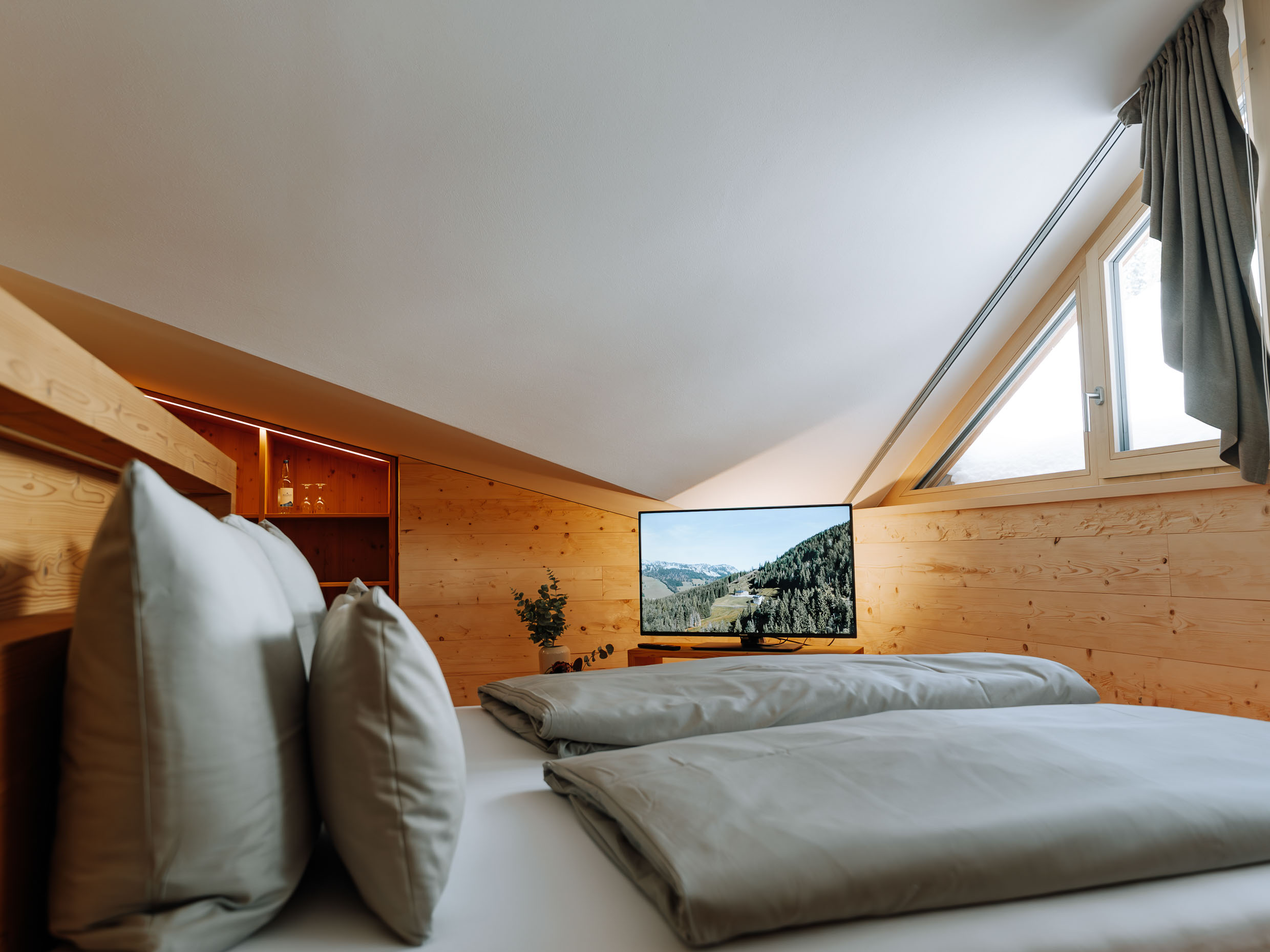 Gestalterisch greifen die Zimmer den klassischen Hüttenstil auf: viel Holz, warme Materialien und eine behagliche Atmosphäre, die das alpine Lebensgefühl von Wald & Wiesn widerspiegelt. Die Hütte ist damit der perfekte Ort für alle, die gerne mittendrin wohnen und das Herz des Hauses bewusst erleben möchten.