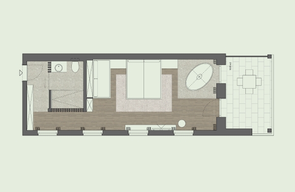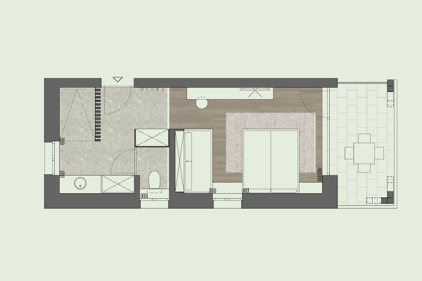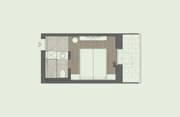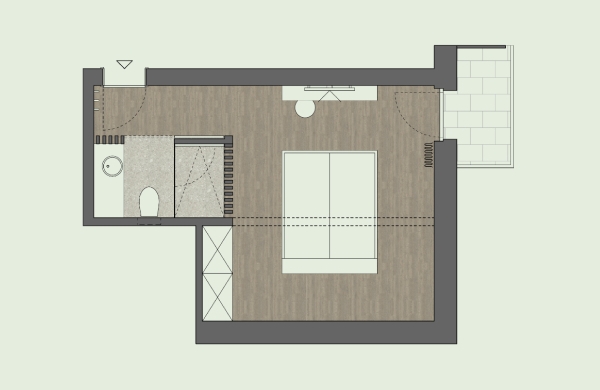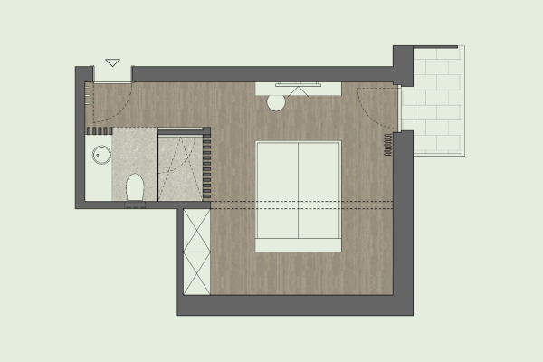 - Freistehendes Doppelbett im offenen Studio-Layout