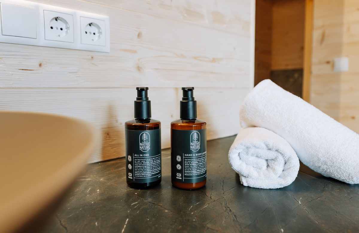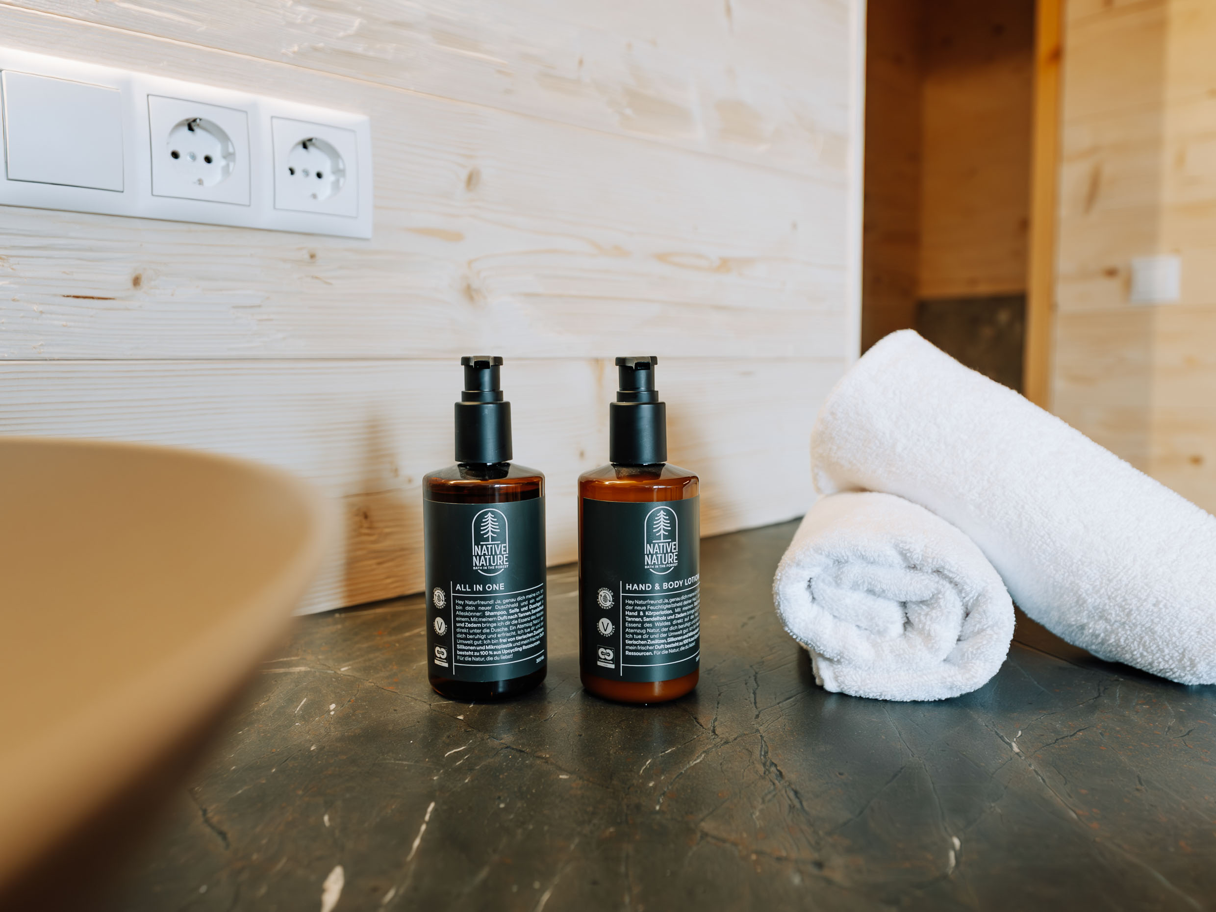 - Pflegeprodukte: Duschgel, Shampoo & Föhn