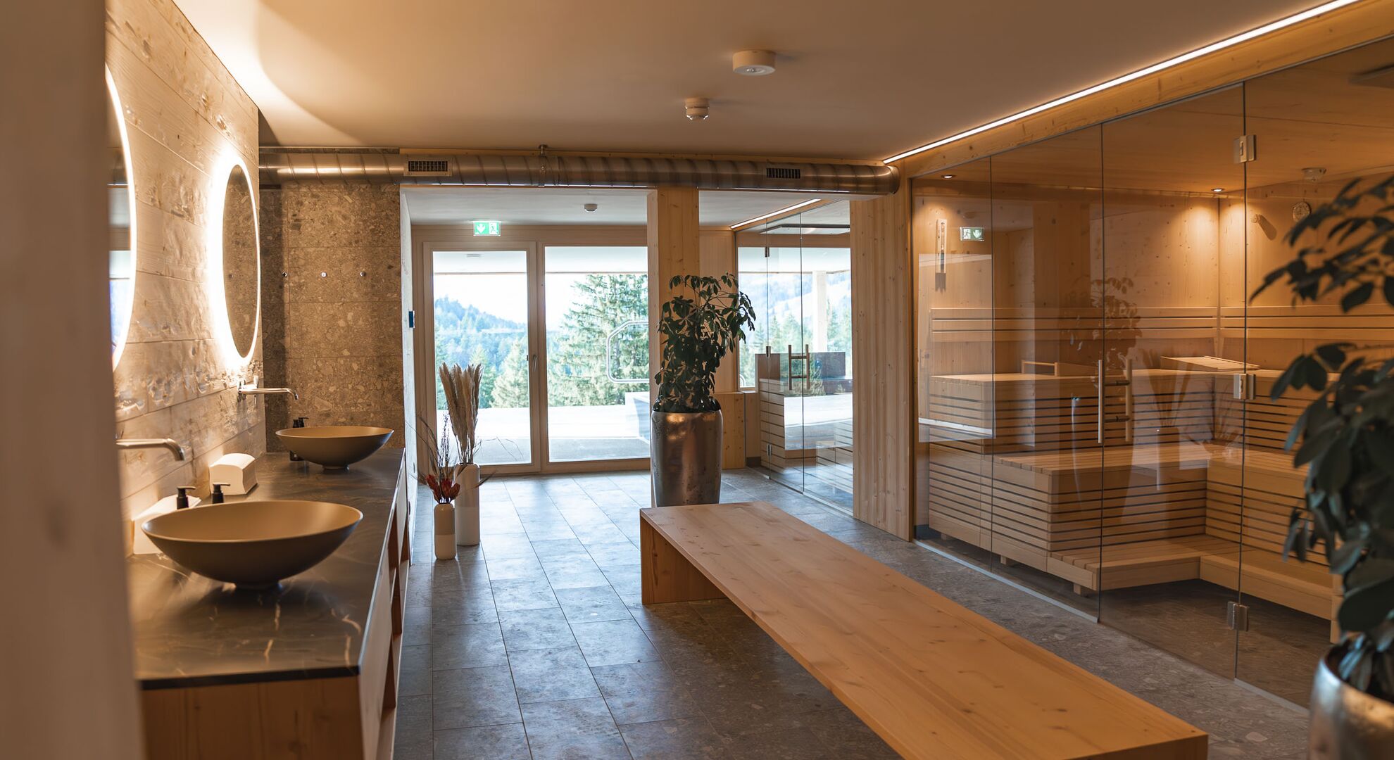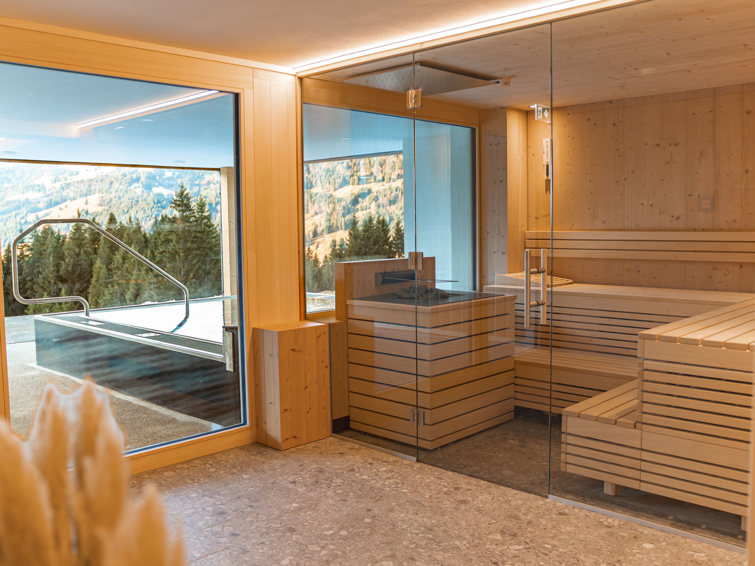 Wenn Du es lieber etwas sanfter magst, dann entspannst Du in unserer Bio-Sauna und blickst durch das riesige Panoramafenster direkt in die Allgäuer Bergwelt – bis hin zum Bodensee. Besonders am Abend, wenn die Sonne hinter den Gipfeln versinkt, entsteht hier ein unvergesslicher Moment der Ruhe.