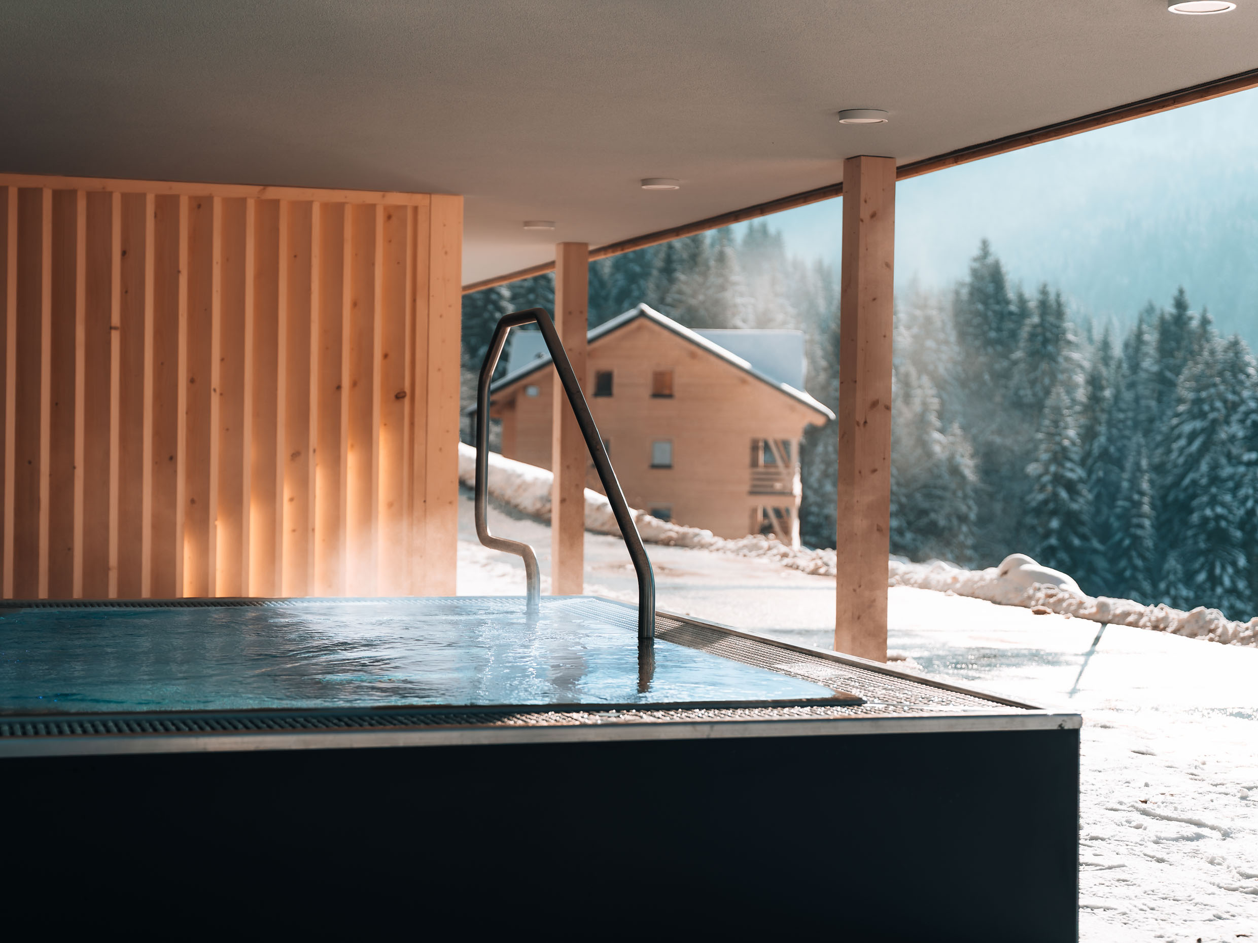 Im Sommer laden draußen großzügige Sonnenliegen inmitten der ruhigen Bergwiesen zum Entspannen ein – und im Winter wird der Pool zum besonderen Erlebnis, wenn das warme Wasser unter freiem Himmel sanft vor sich hin dampft.